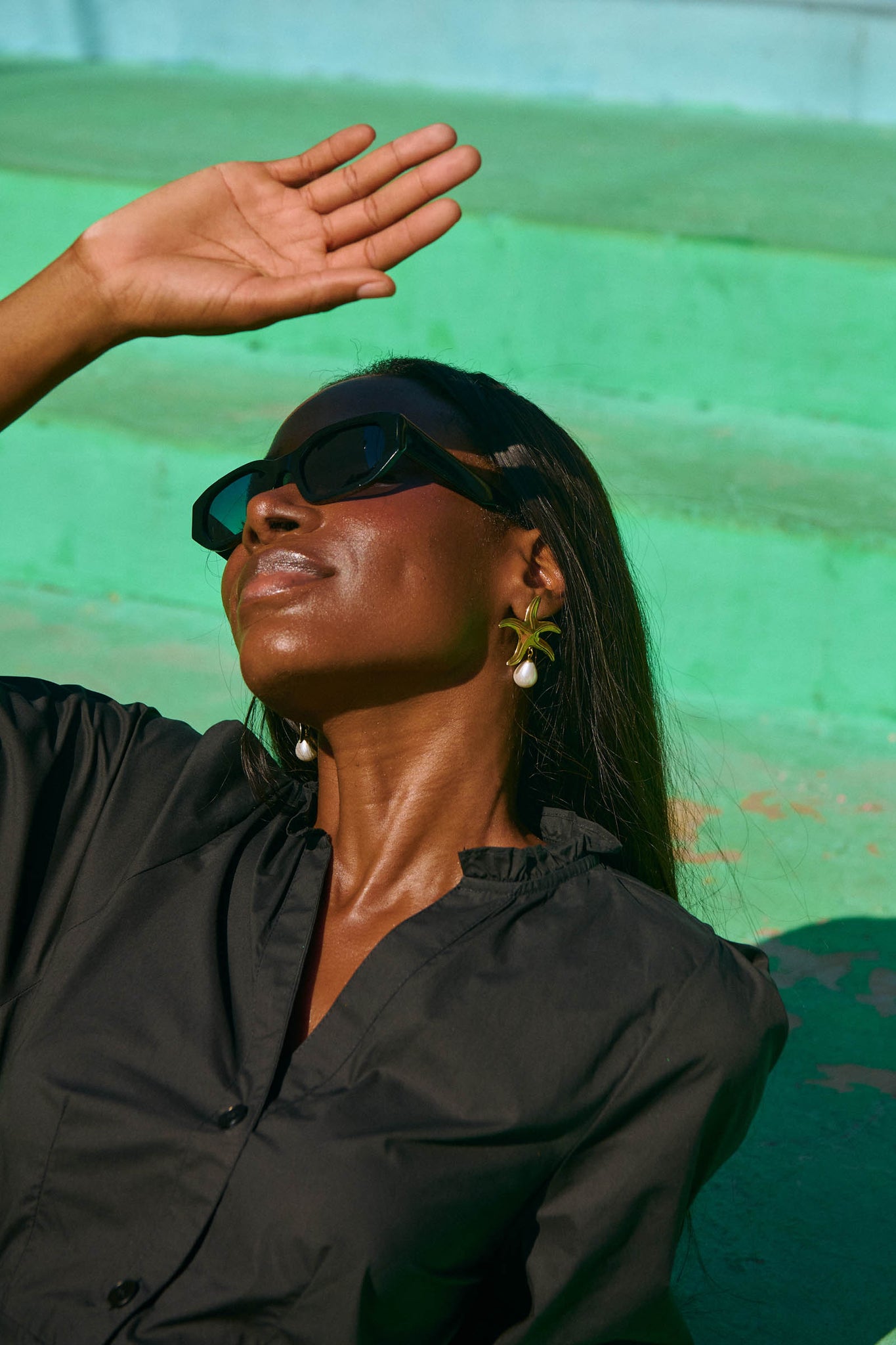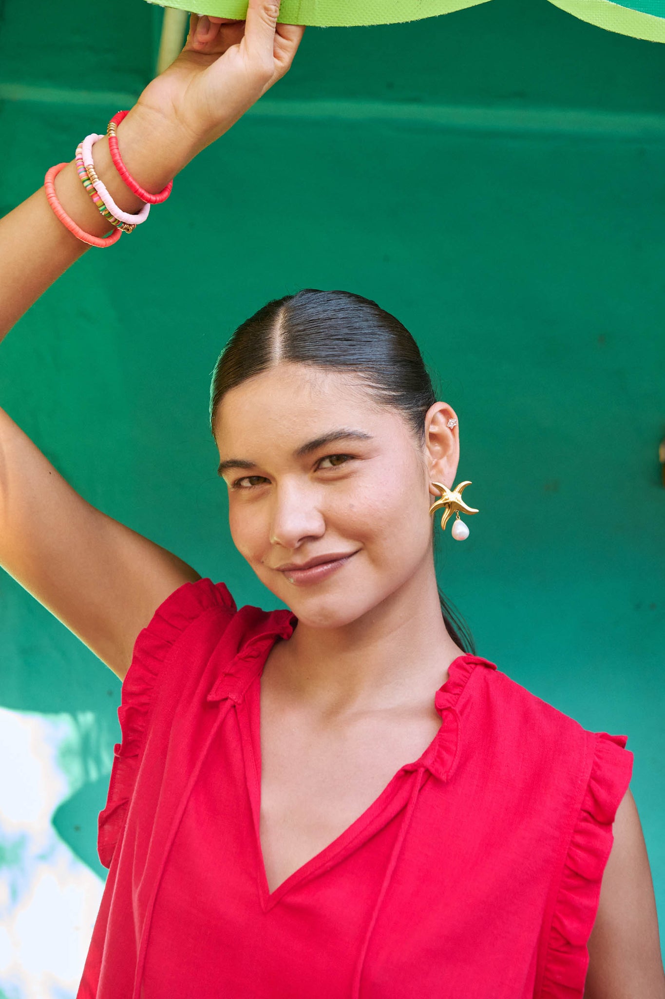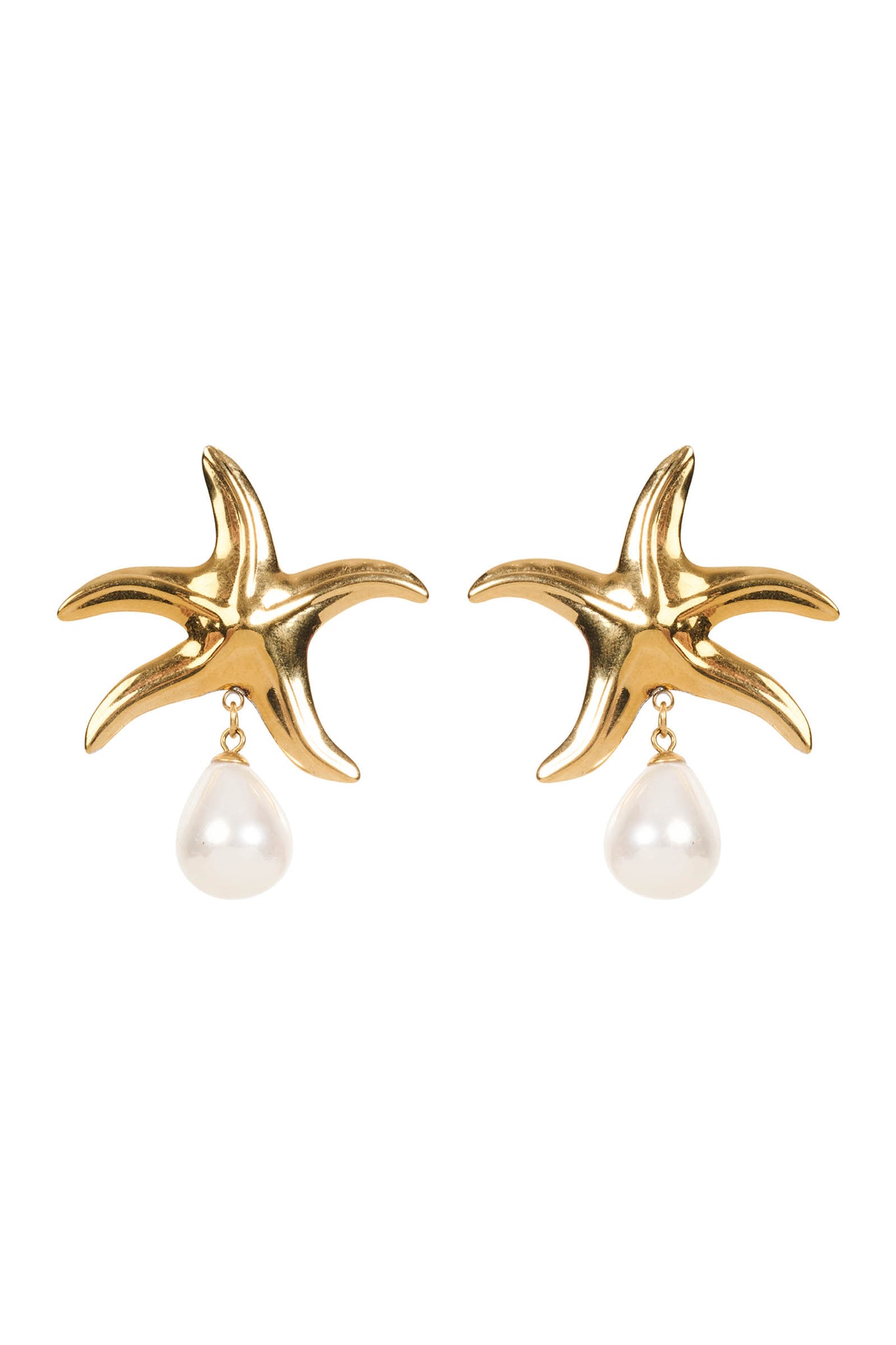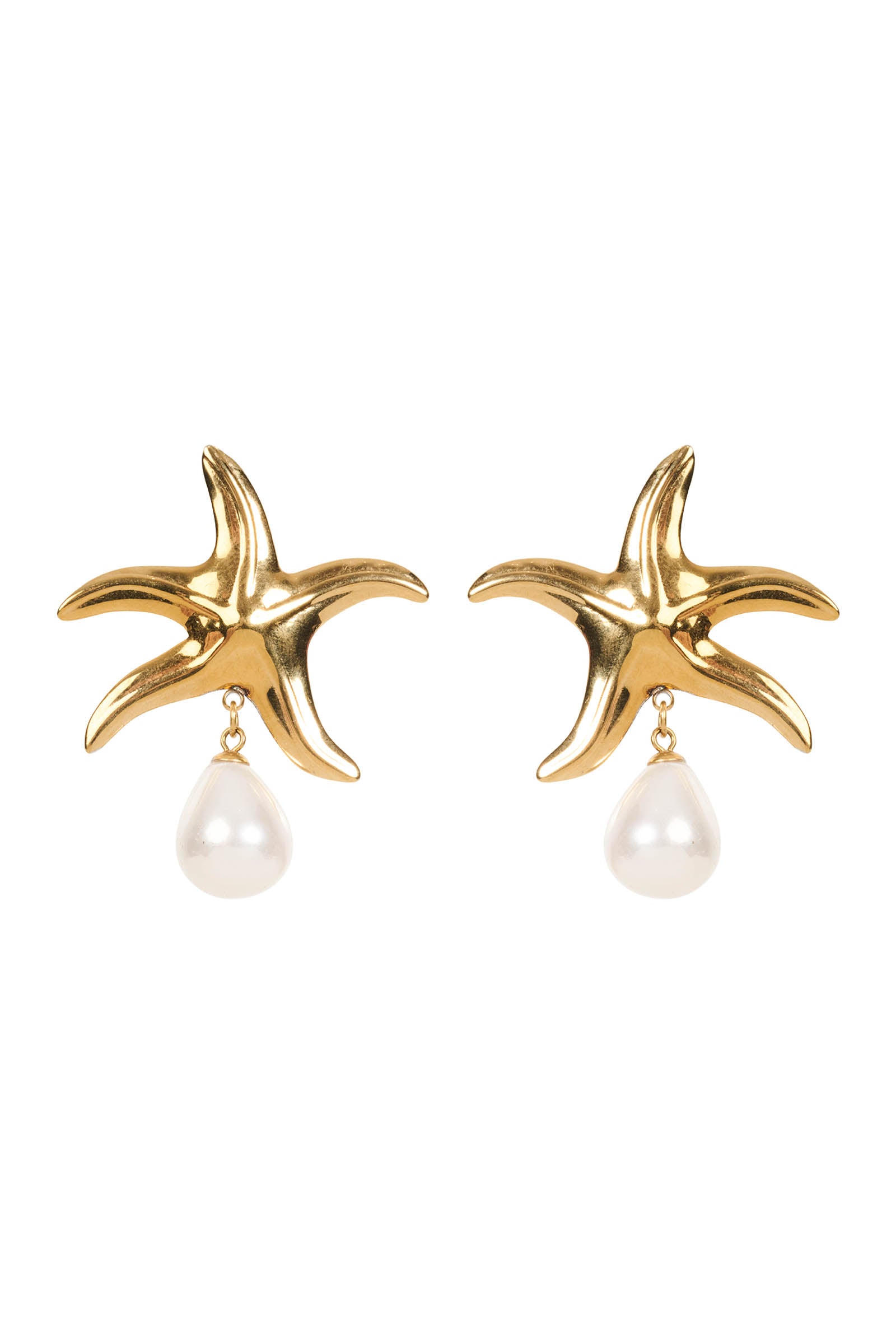 A beachy classic reimagined. The Bahama Pearl Earring Starfish pairs a gold-look starfish stud with a single hanging pearl for effortless coastal charm.