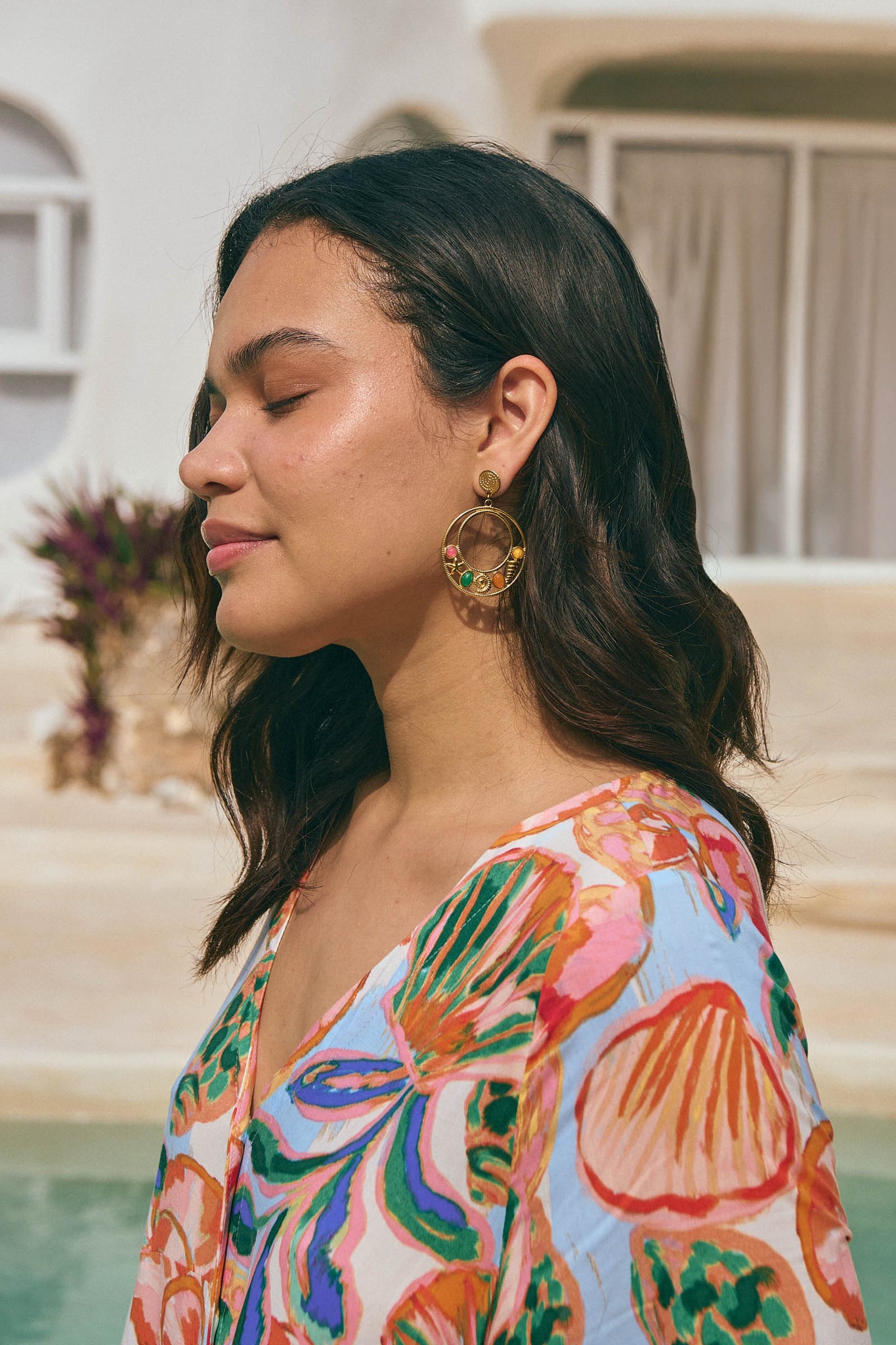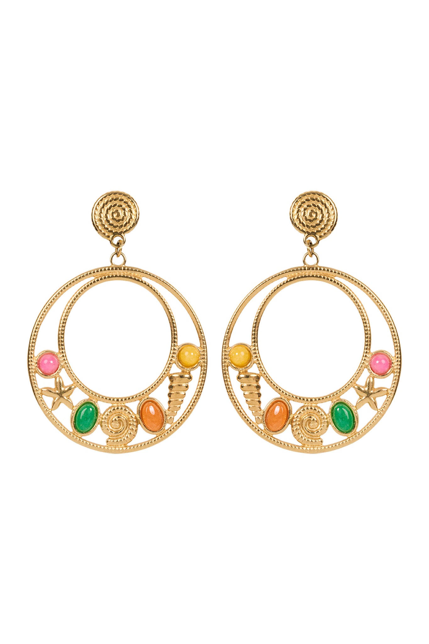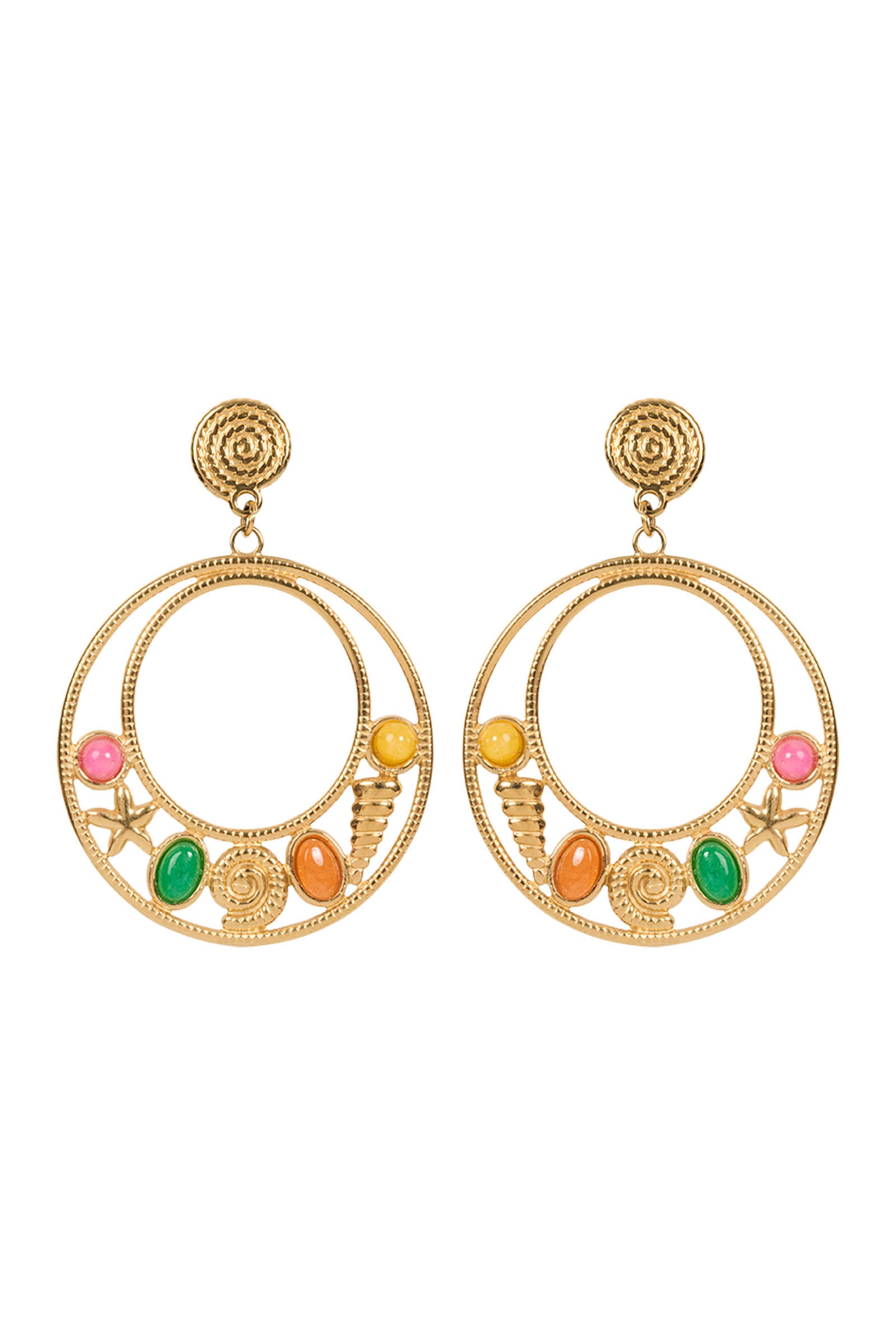 A playful sea-inspired moment. Featuring two linked golden hoops with floating charms suspended between - like treasures caught mid-drift. The colours of yellow, orange, pink and green bring tropical vibrancy to any outfit.