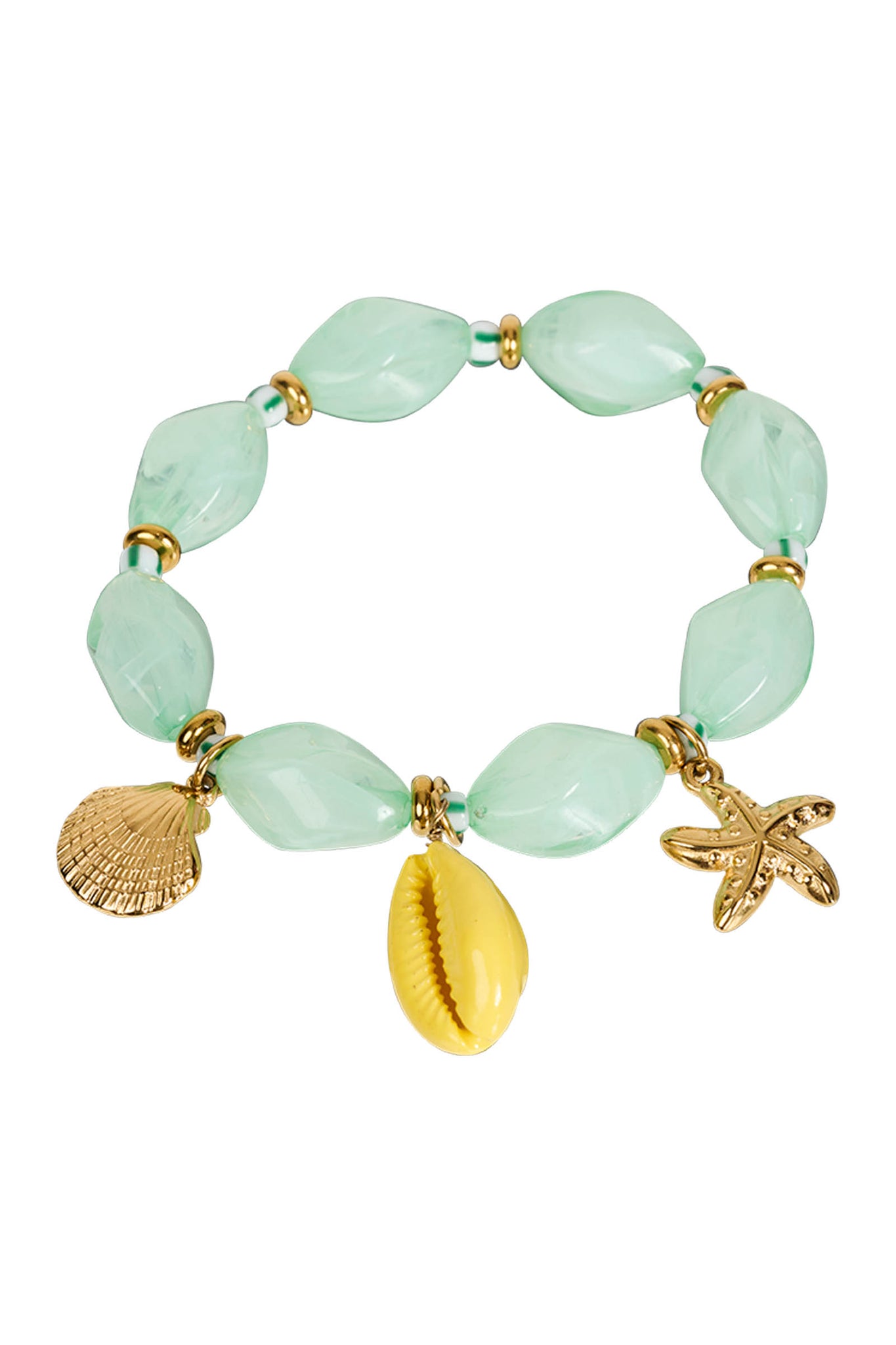 All the fun of the Cabana Necklace, in bracelet form. Chunky pearl-like beads and mini gold accents are paired with hanging sea treasures - shells, cowries and starfish. A little piece of paradise for your wrist.