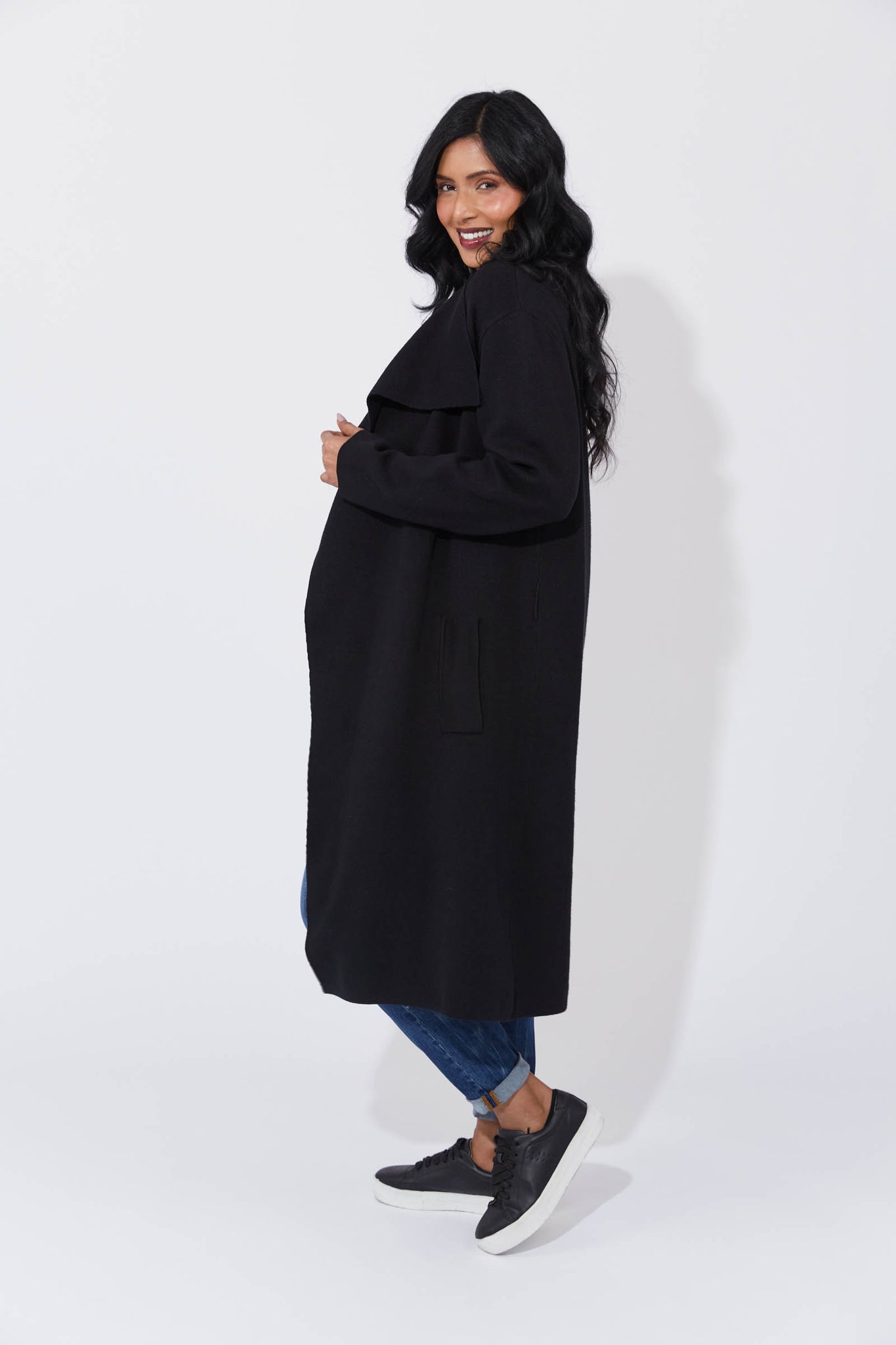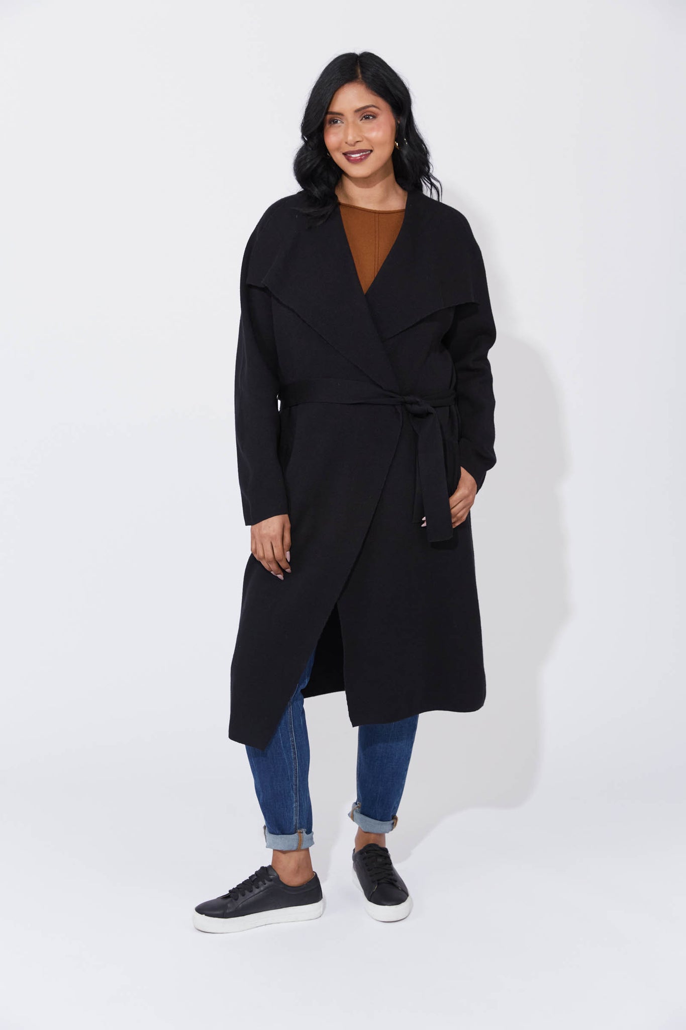Add a refined touch with the Cairo Cardigan. Ideal for professional or formal settings, this luxurious knit cardigan has an oversized fit that cascades elegantly over fitted knit dresses or tailored winter suiting. Functional welt pockets are complemented by an elegant collar and a removable self-fabric belt, combining sophistication with added warmth.
