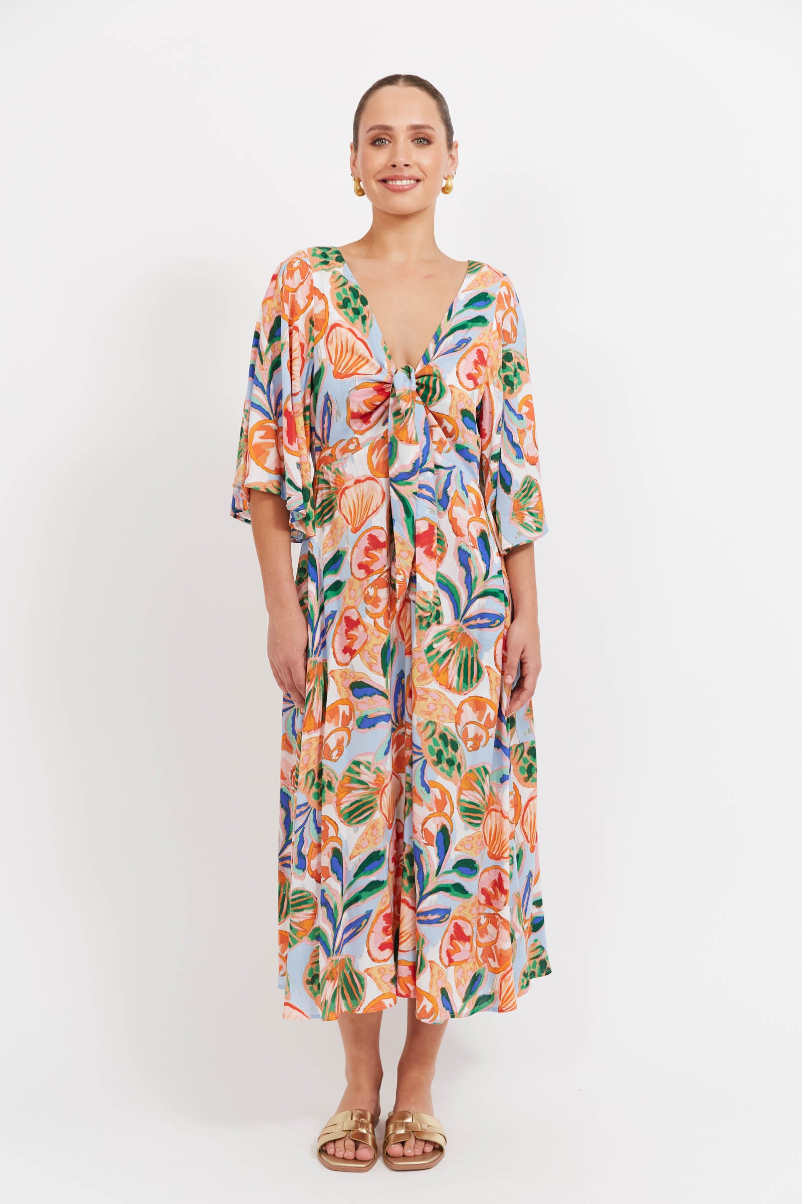 The Baja Tie Midi Dress is crafted in a feminine, flattering silhouette - perfect for sunny-day events or dressy moments that still call for comfort. Featuring soft butterfly flutter sleeves, a tie-front bust with adjustable shaping, and a relaxed swing-style hem. A defined waist seam and centre back zip offer subtle structure, while internal side pockets add everyday ease.