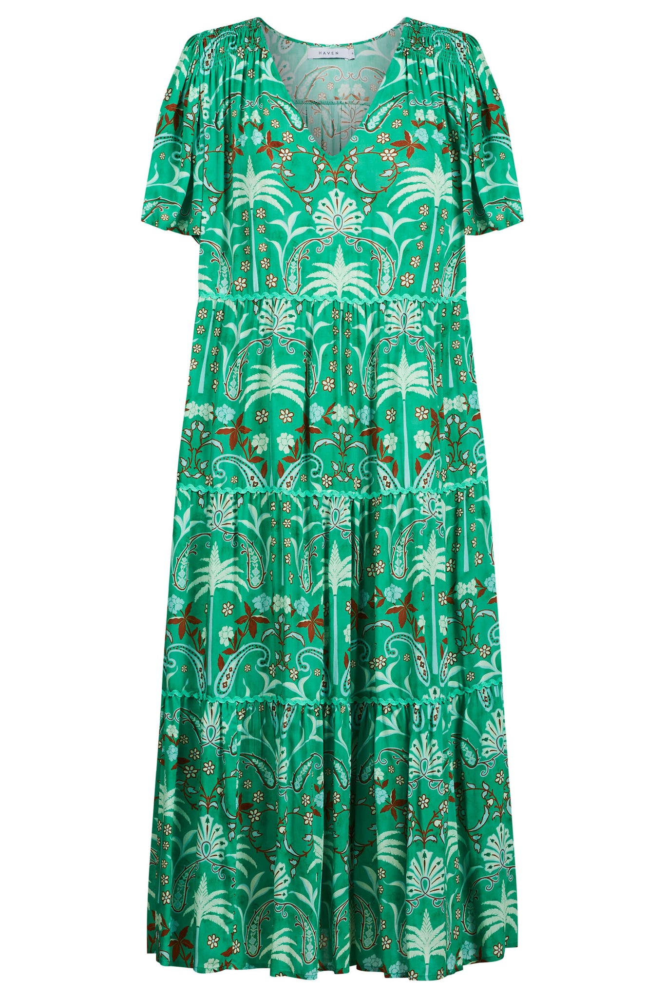 Whether it's lunch with friends or barefoot beach strolls, the Haiti Maxi Dress strikes the perfect balance between coverage and carefree style. With soft flutter sleeves for sun protection, a relaxed fit, and tiered panels trimmed with playful ric-rac, it's designed for warm days that roll into golden evenings.