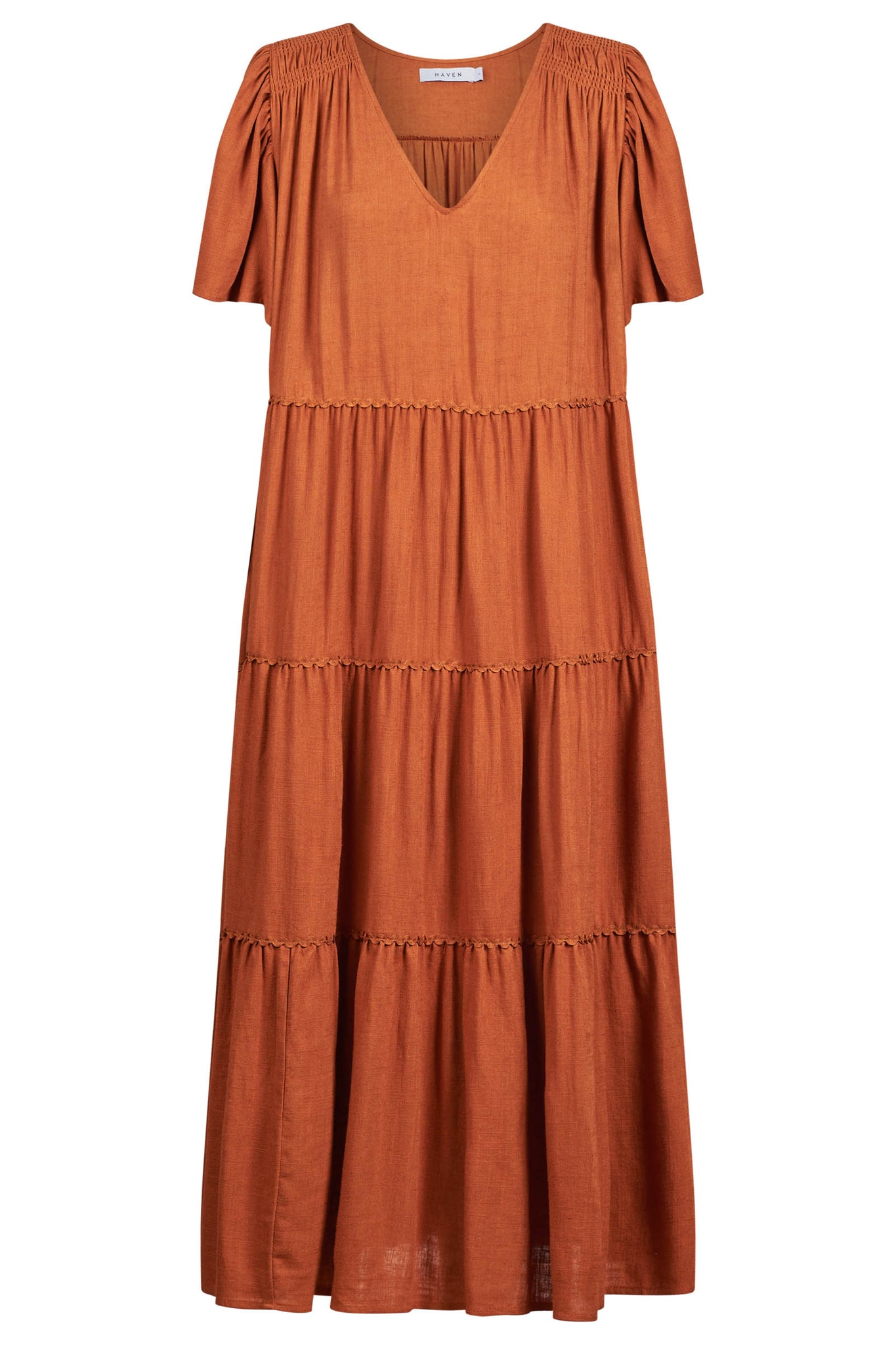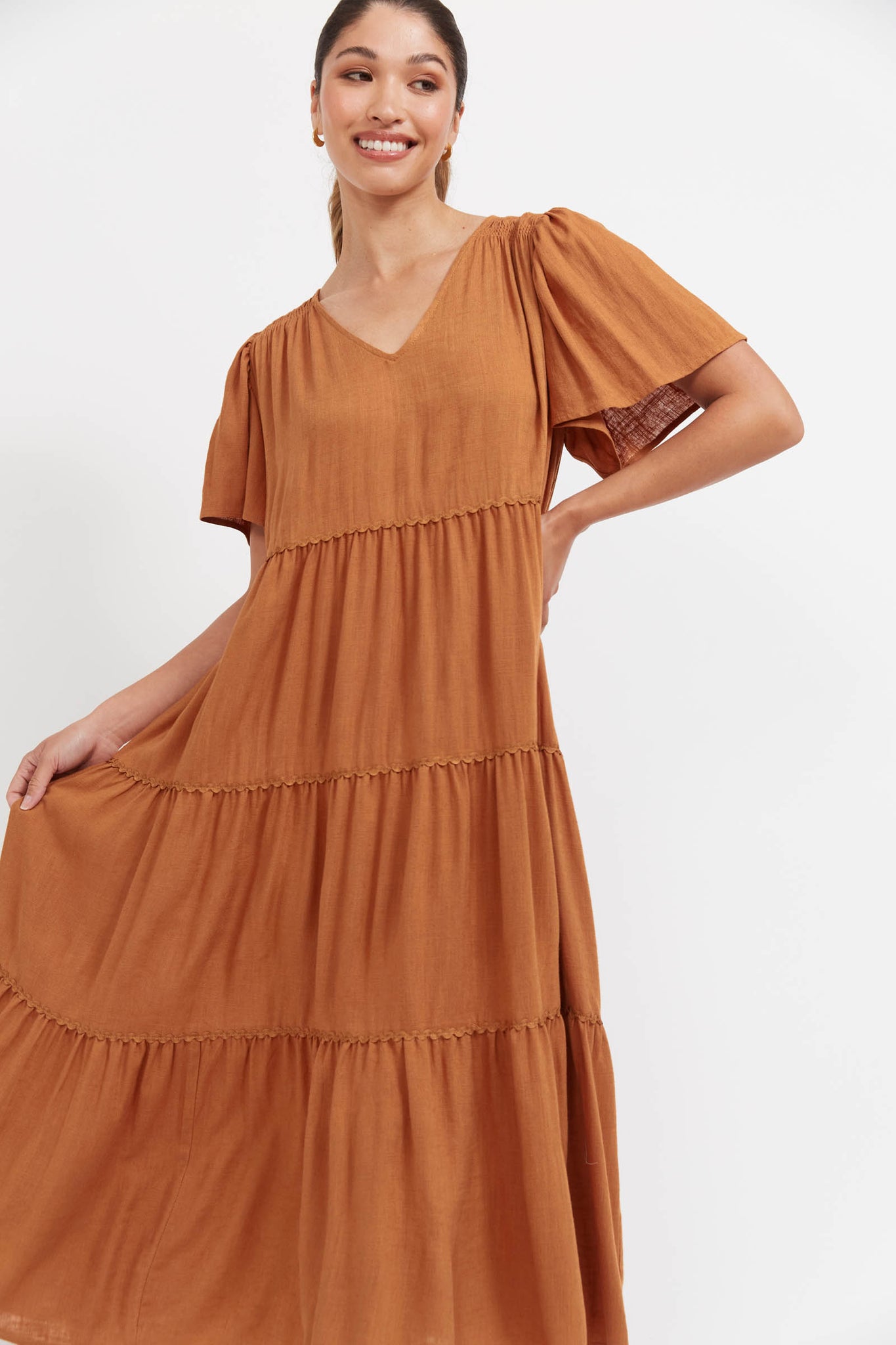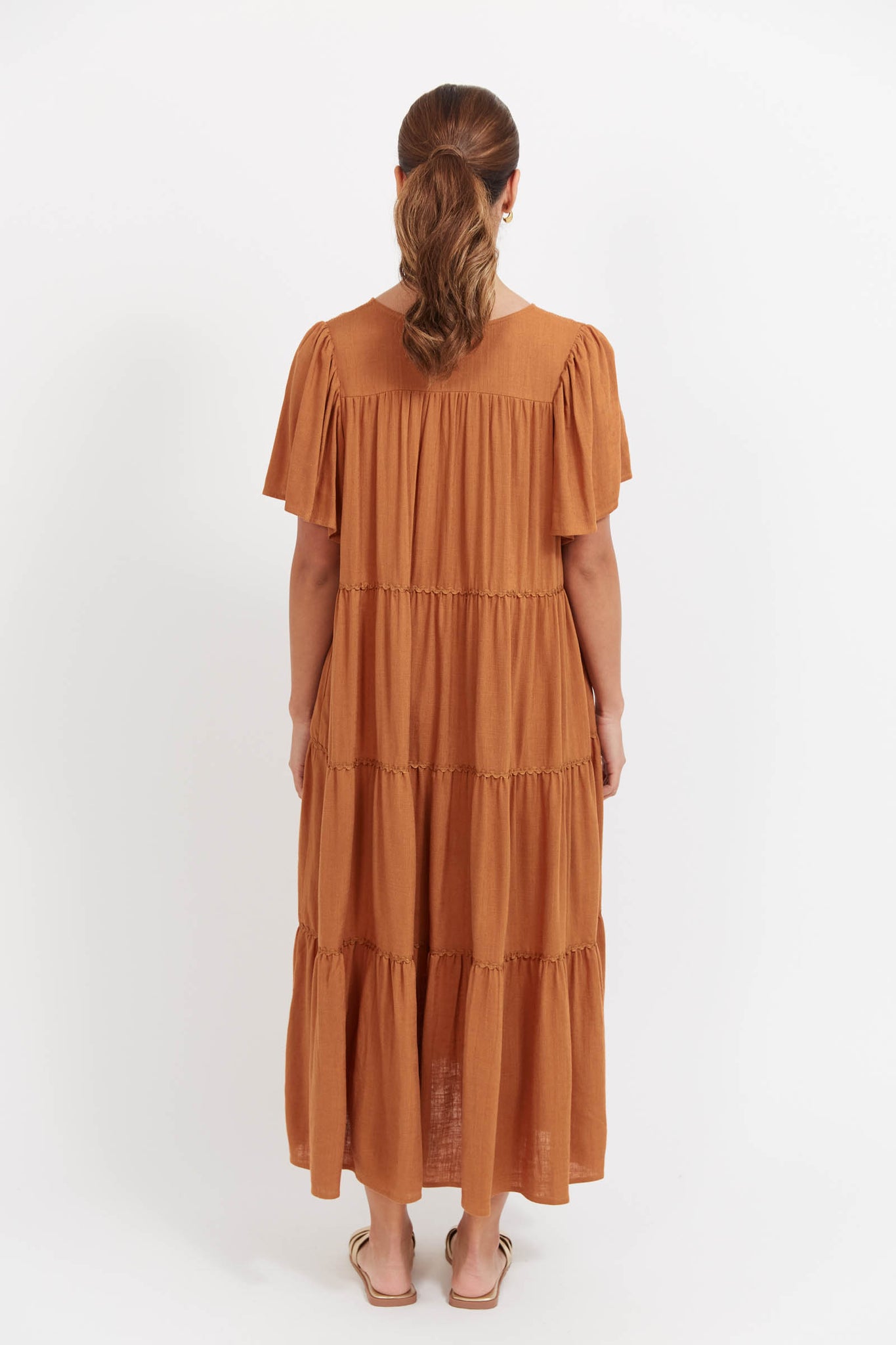 Whether it's lunch with friends or barefoot beach strolls, the Haiti Maxi Dress strikes the perfect balance between coverage and carefree style. With soft flutter sleeves for sun protection, a relaxed fit, and tiered panels trimmed with playful ric-rac, it's designed for warm days that roll into golden evenings.