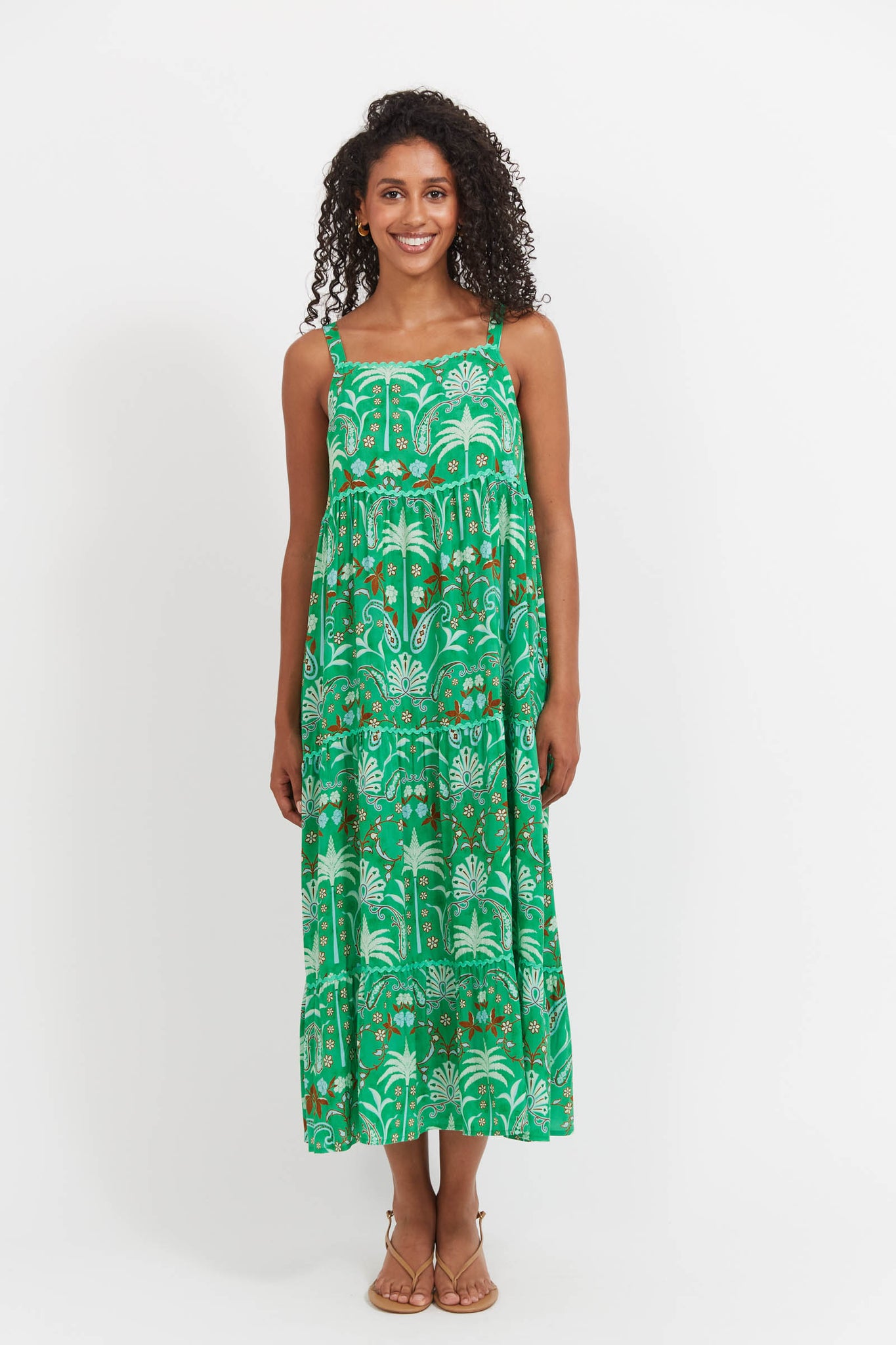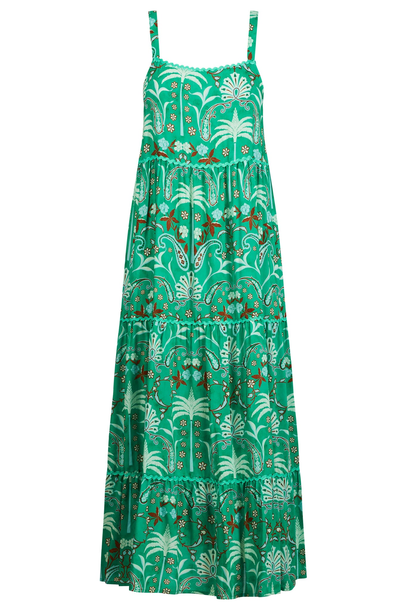 Your no-fuss, go-everywhere summer hero. The Haiti Tank Maxi Dress is tiered, flowing, and versatile - from beach strolls to balmy nights out. Featuring a straight neckline, adjustable straps with gold-tone hardware, and an elasticated back panel for comfort. Ric-rac trim along the neckline and skirt tiers adds playful charm, while internal side pockets keep things practical.