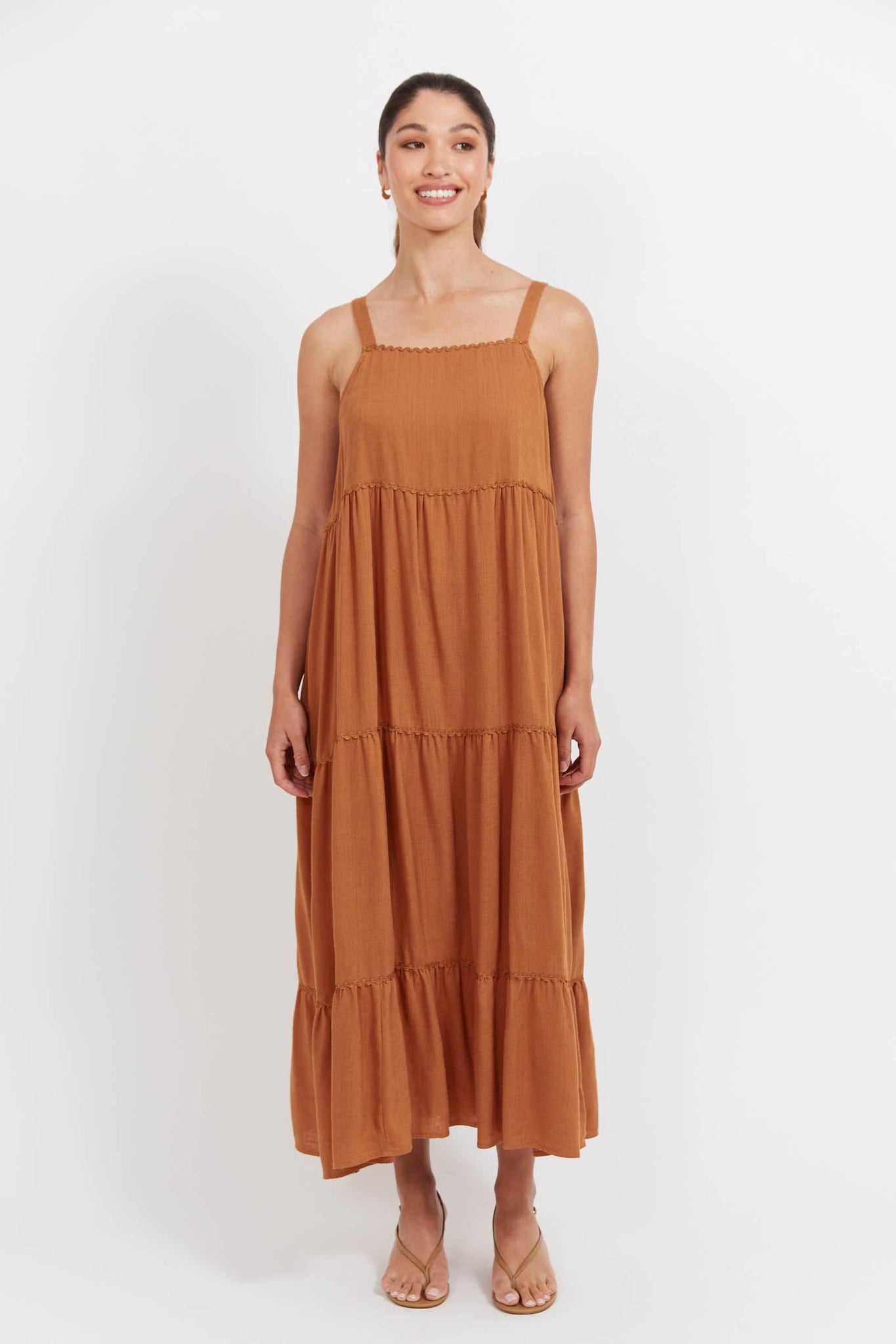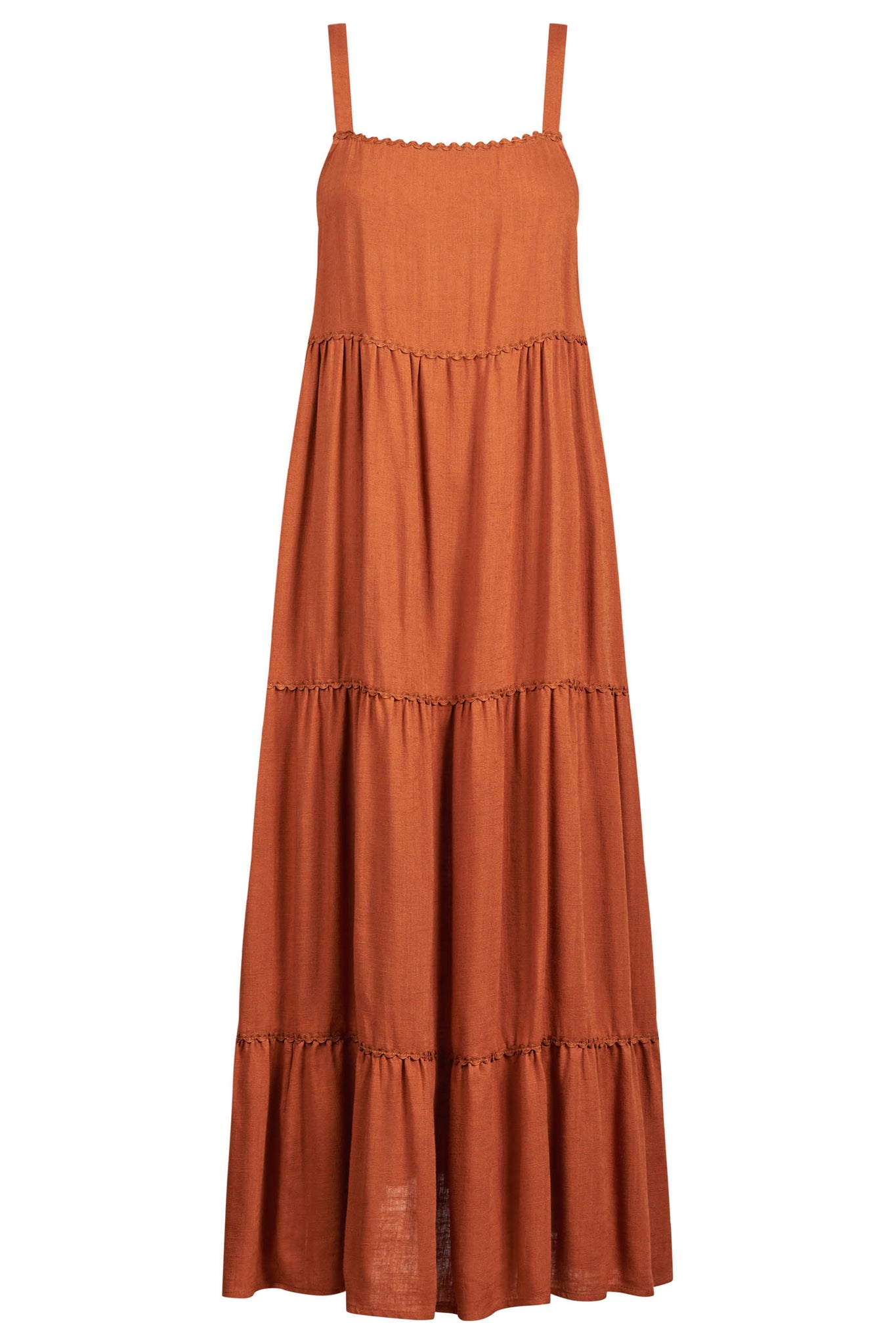 Your no-fuss, go-everywhere summer hero. The Haiti Tank Maxi Dress is tiered, flowing, and versatile - from beach strolls to balmy nights out. Featuring a straight neckline, adjustable straps with gold-tone hardware, and an elasticated back panel for comfort. Ric-rac trim along the neckline and skirt tiers adds playful charm, while internal side pockets keep things practical.