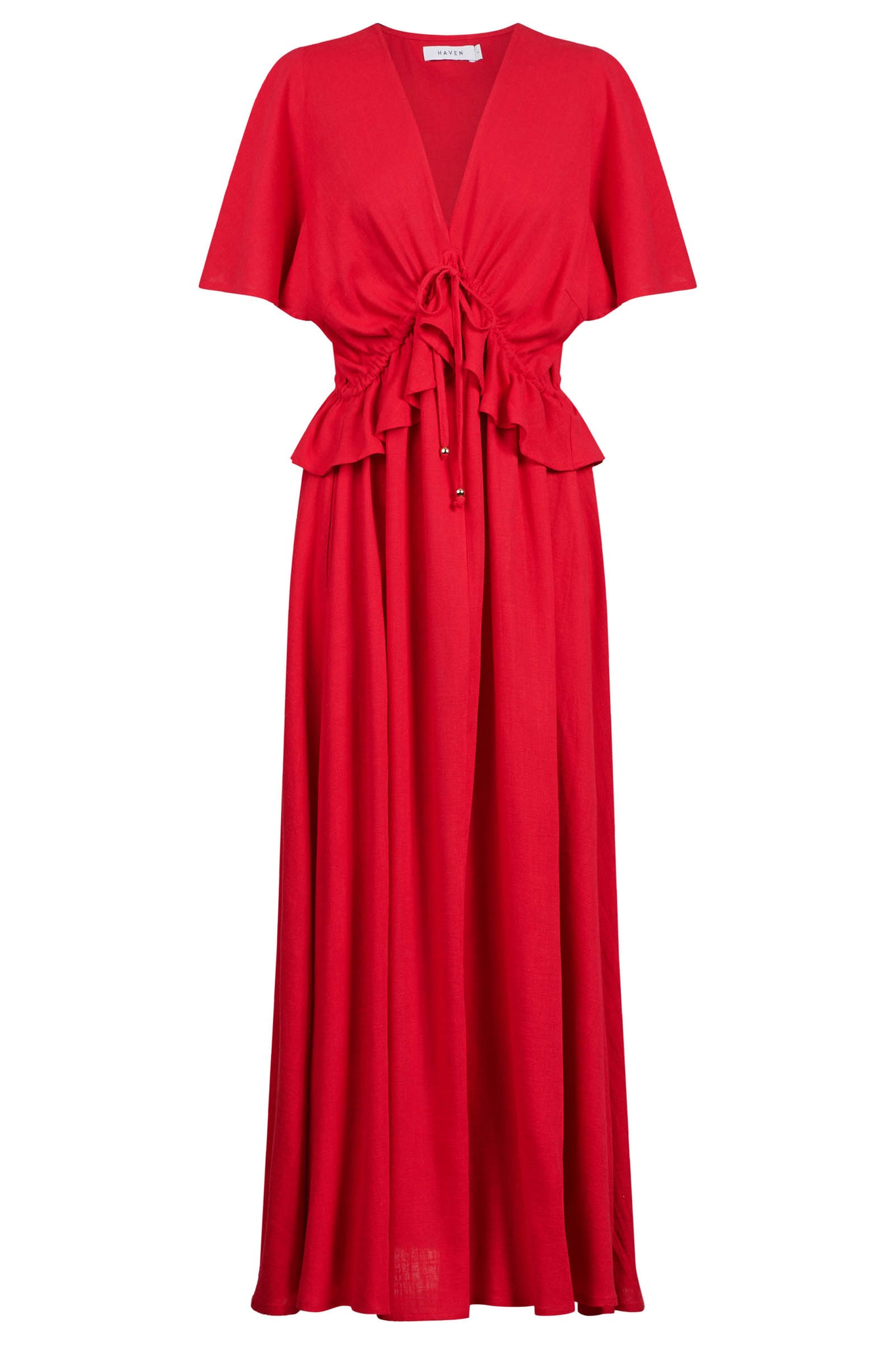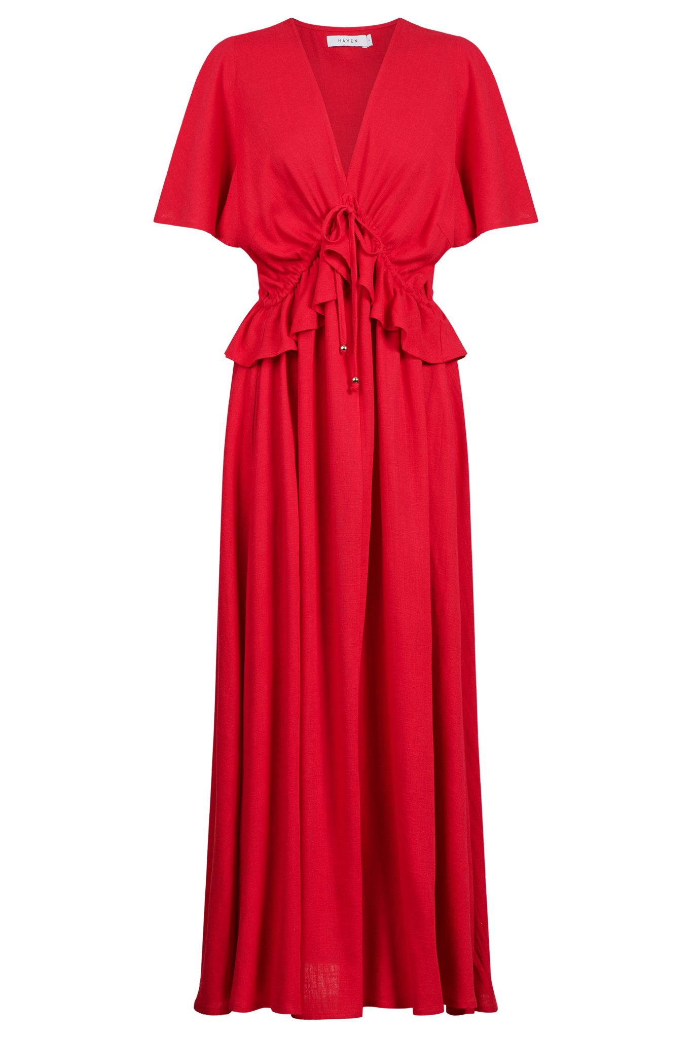 Feminine and flattering, the Jardin Frill Maxi Dress is designed with a soft V neckline, flutter sleeves, and an angled waist seam that flows into a gathered ruffle hem. The adjustable self-fabric drawstring lets you tailor the fit, while gold bead details add a subtle touch of polish. Crafted from a breathable linen blend and finished with hidden side pockets, it's a style that balances beauty with practicality.