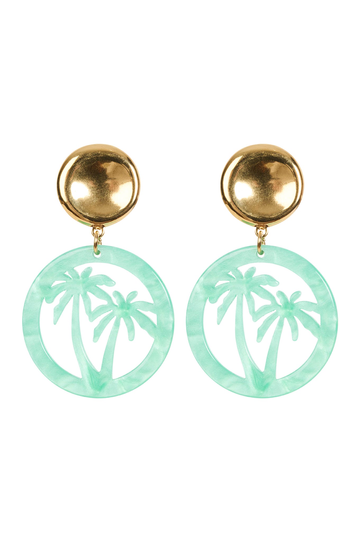 Make a statement with the Haiti Palms Earring - a medium gold-look stud suspends a glossy acetate circle adorned with a tropical palm design. In white, green and tan tones, it's a love letter to island life.