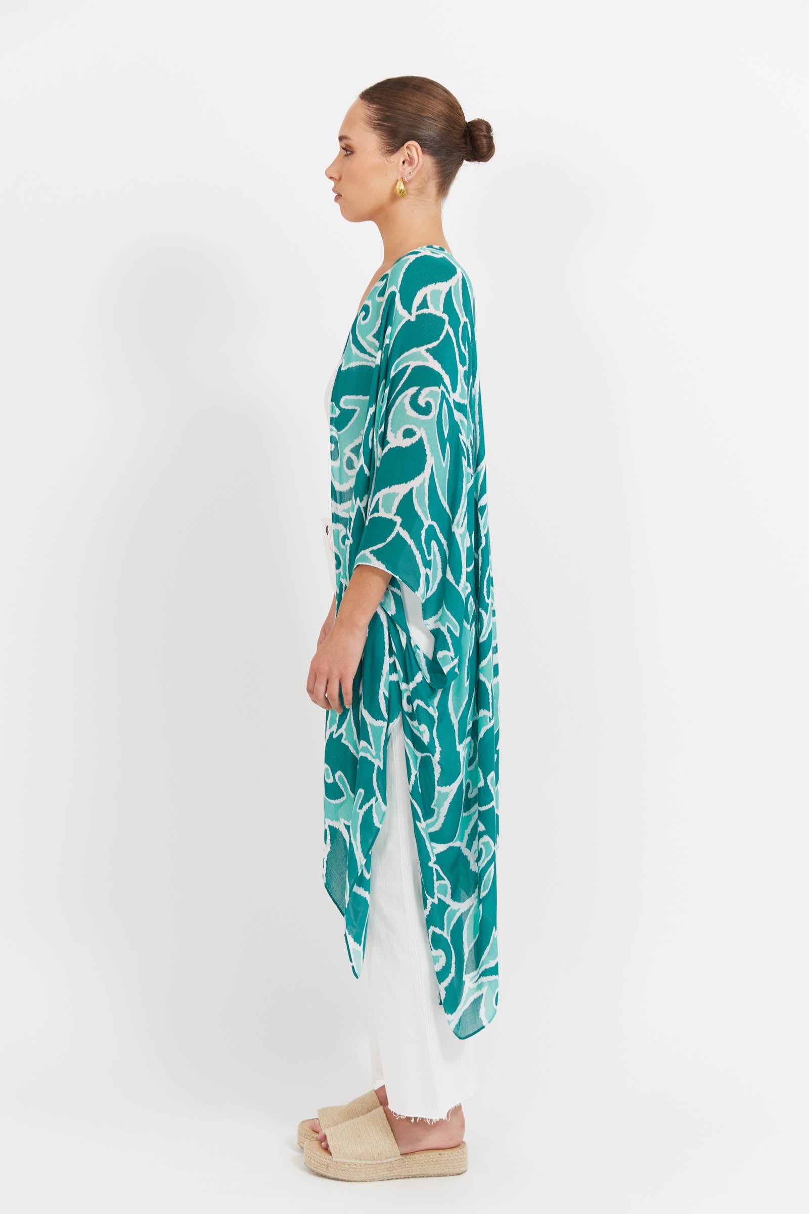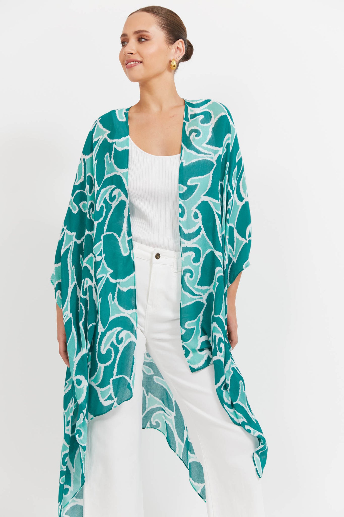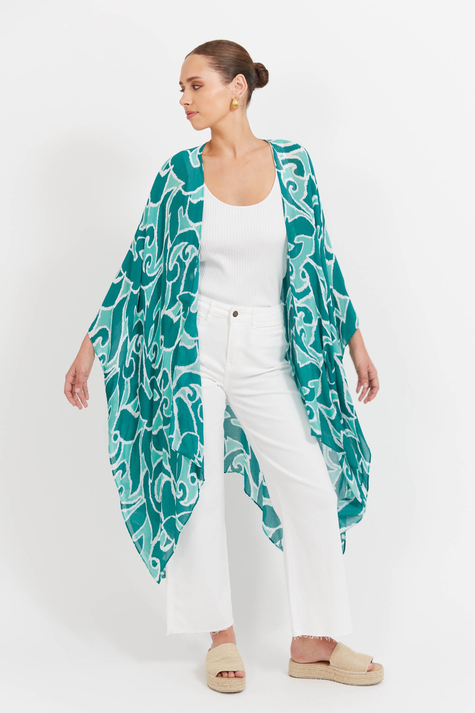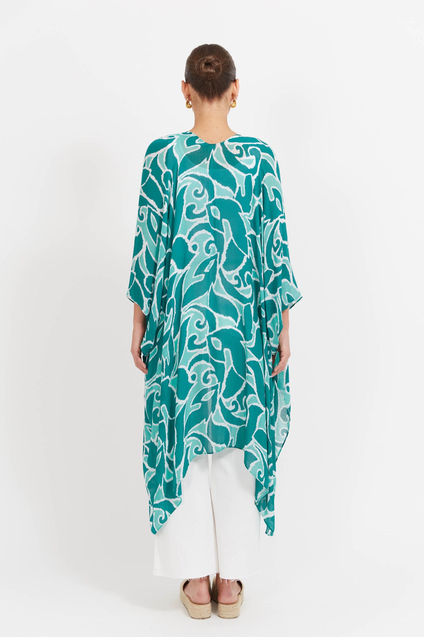 A light layer with a bold touch. The Santos Cape is your go-to for easy sun coverage - whether thrown over swimwear or styled with everyday pieces. Featuring an open-front design, 3/4 length sleeves, side vents, and a flowing handkerchief hem, it adds movement without the bulk. Crafted in a semi-sheer, summer-ready print, it pairs perfectly with the matching Santos Swimsuit for a coordinated beach-to-lunch look.