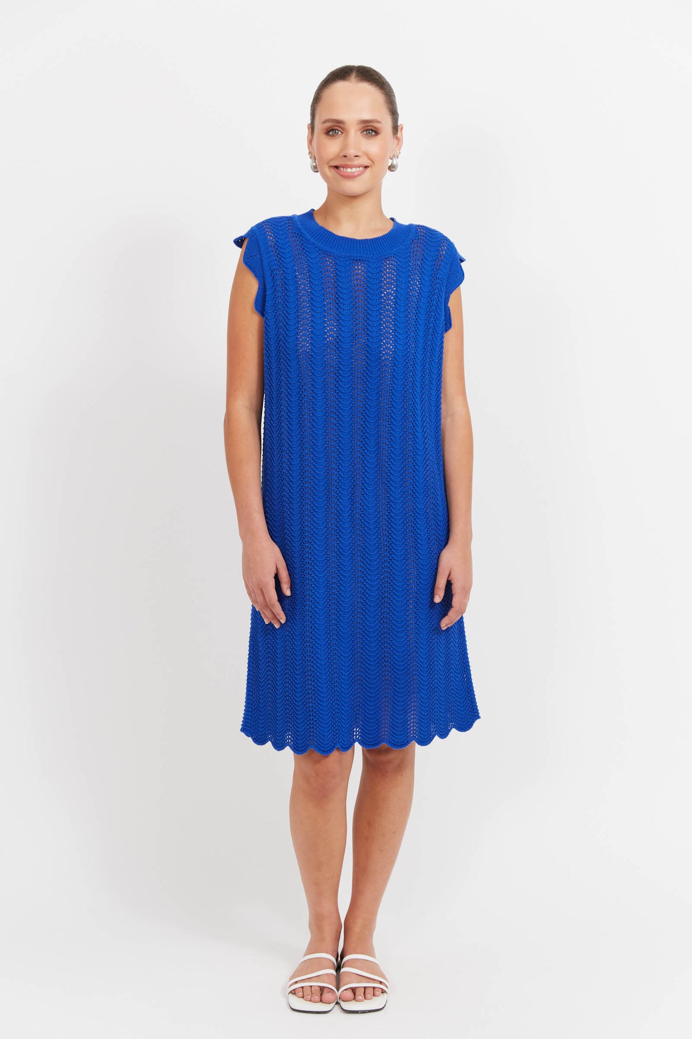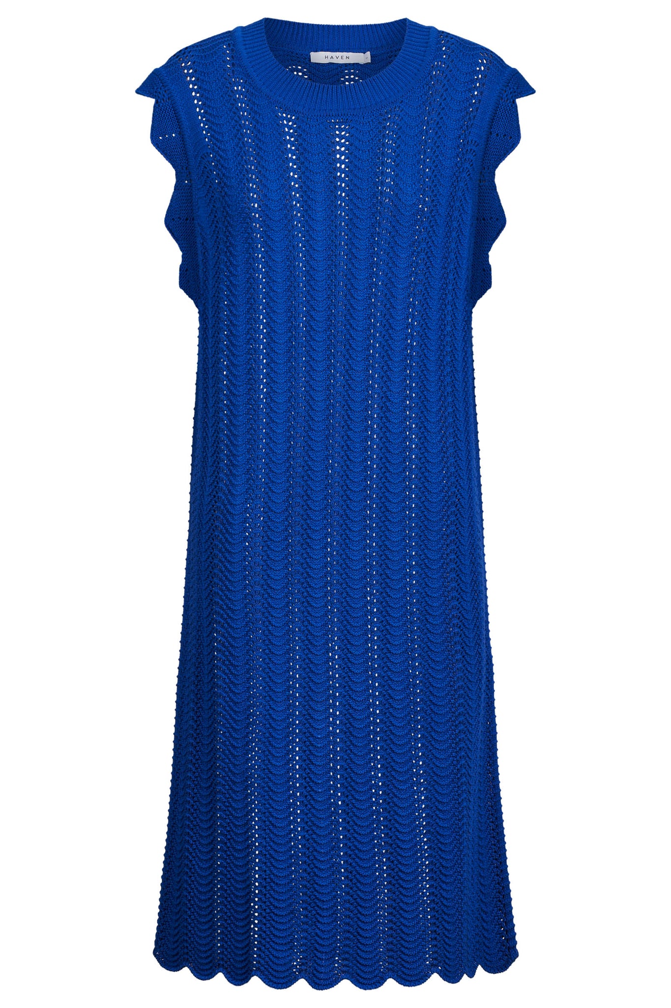 The Jamaica Knit Dress is your go-to for beach days, balmy nights, and everything in between. Crafted from 100% cotton in a pointelle-style cable knit, it's semi-sheer and breathable with a relaxed fit that falls below the knee. The sleeveless design is finished with soft scalloped trim for a feminine touch.