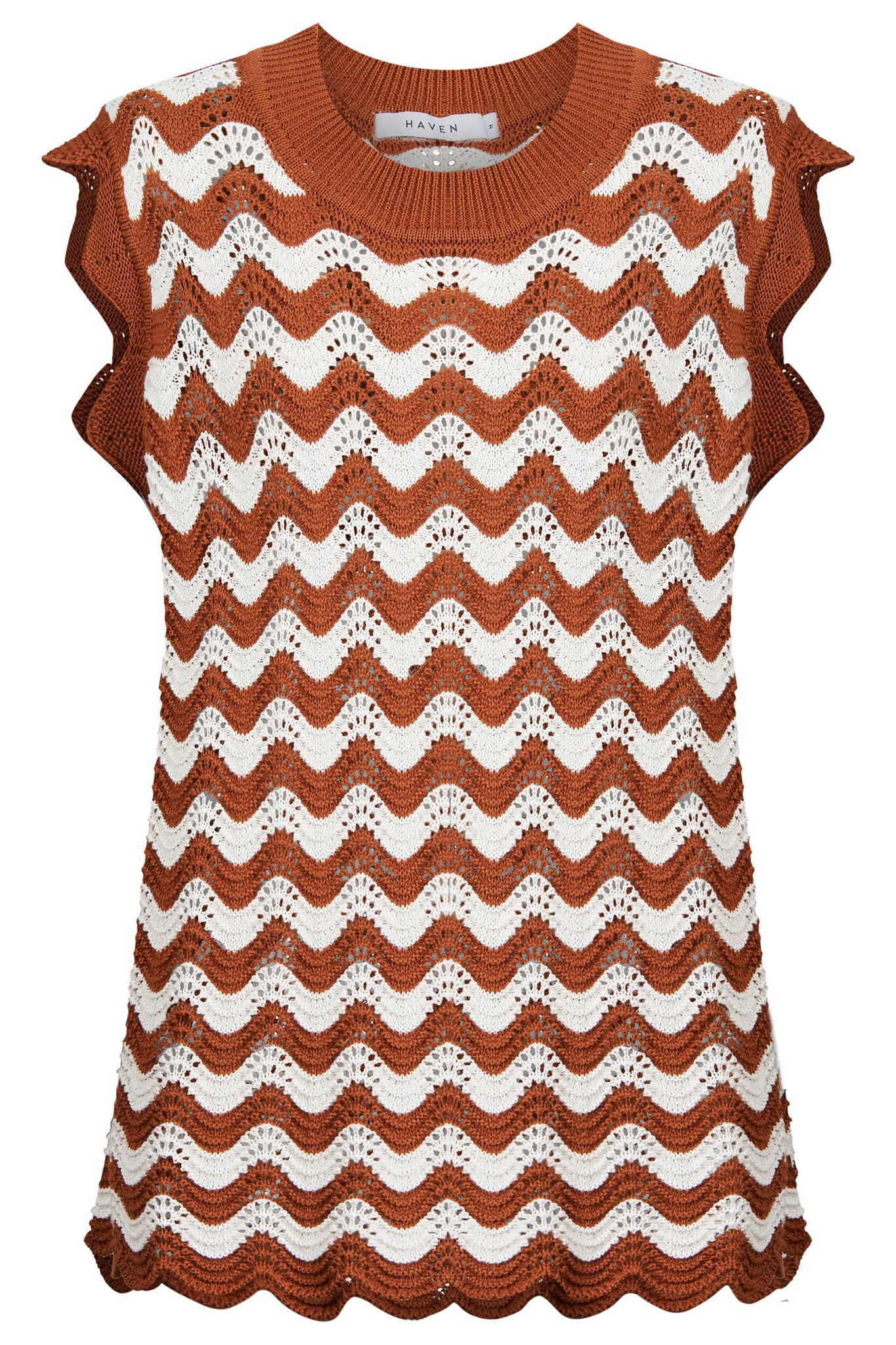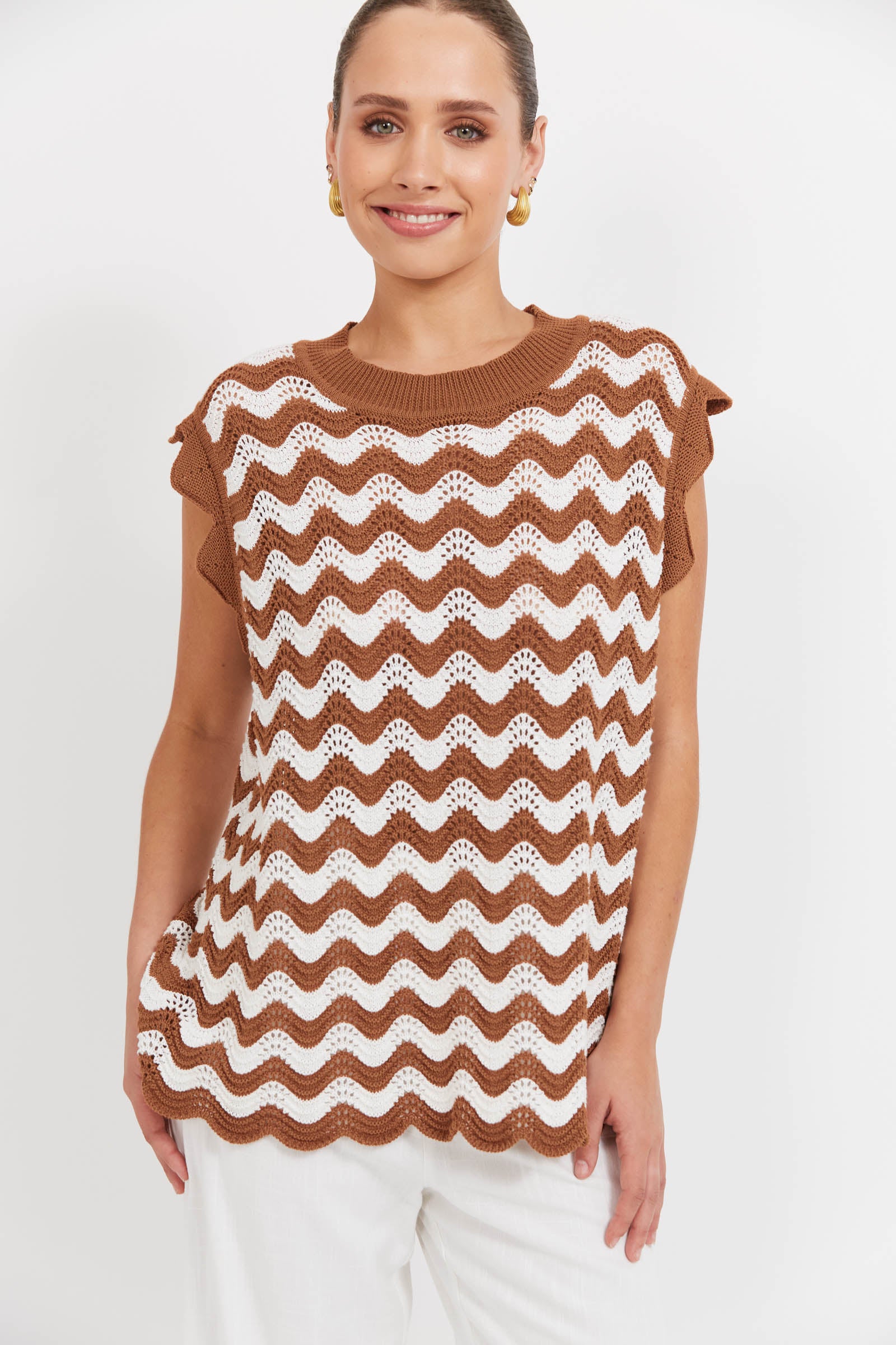 Textured, breathable, and full of personality. Made from 100% cotton, this sleeveless style features a relaxed fit and hip-length cut for all-day comfort and easy layering. The standout design comes through in its two-tone zigzag pointelle knit, round neckline, and delicate scalloped trim detailing.