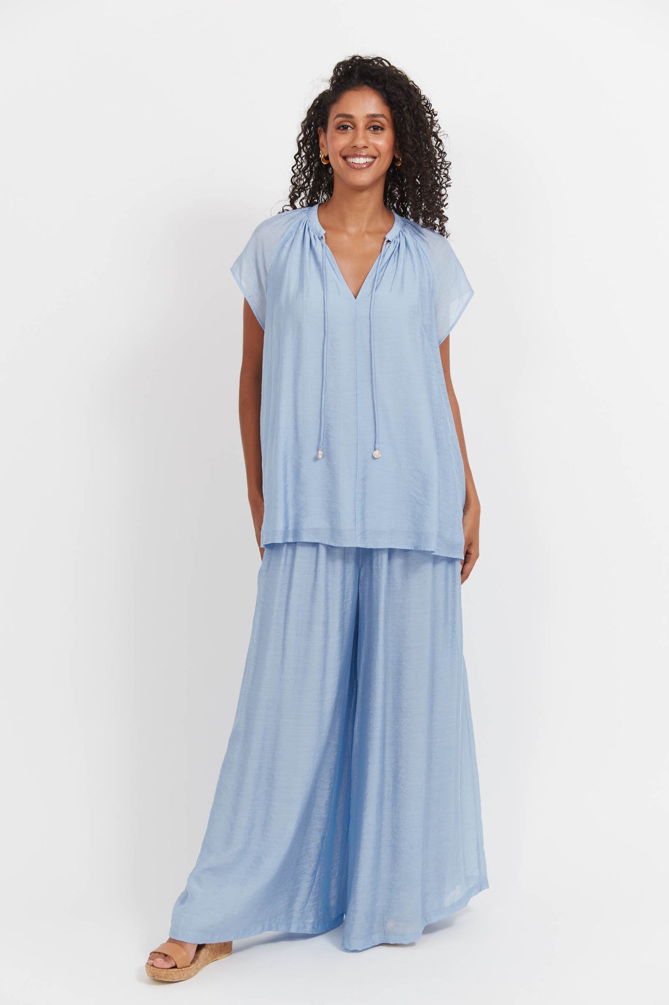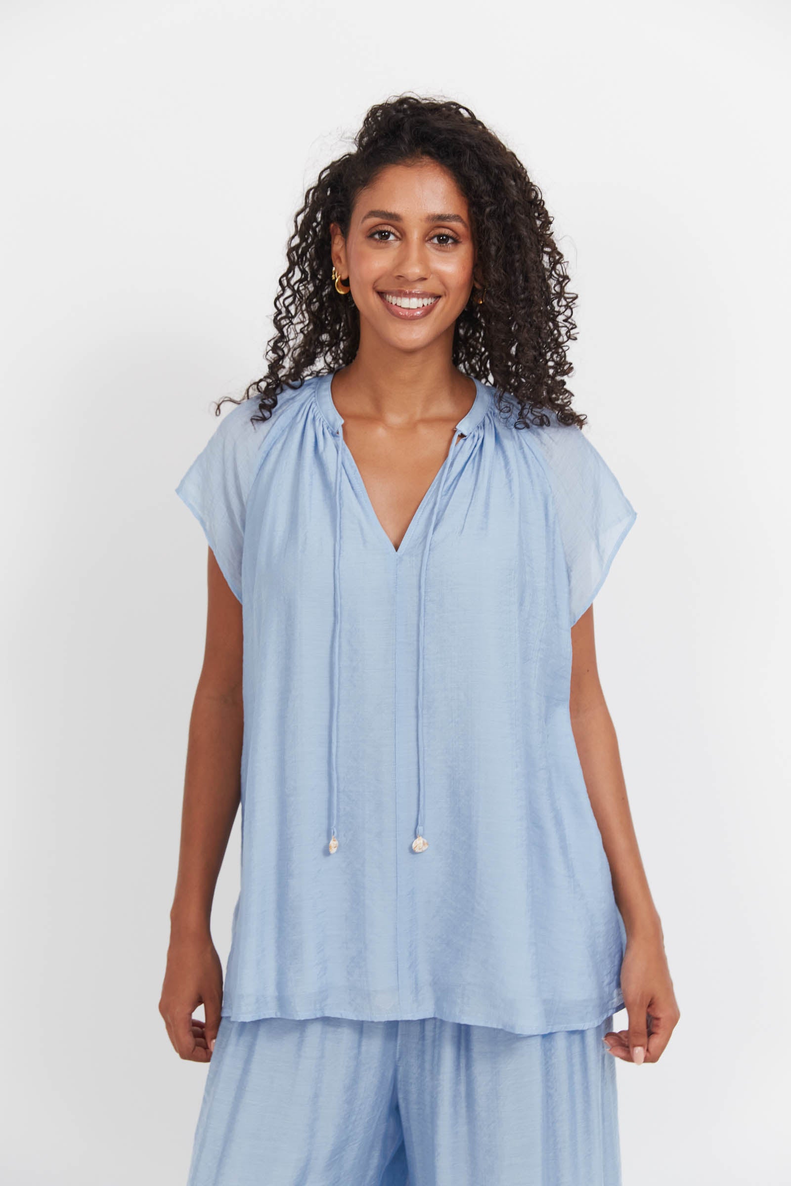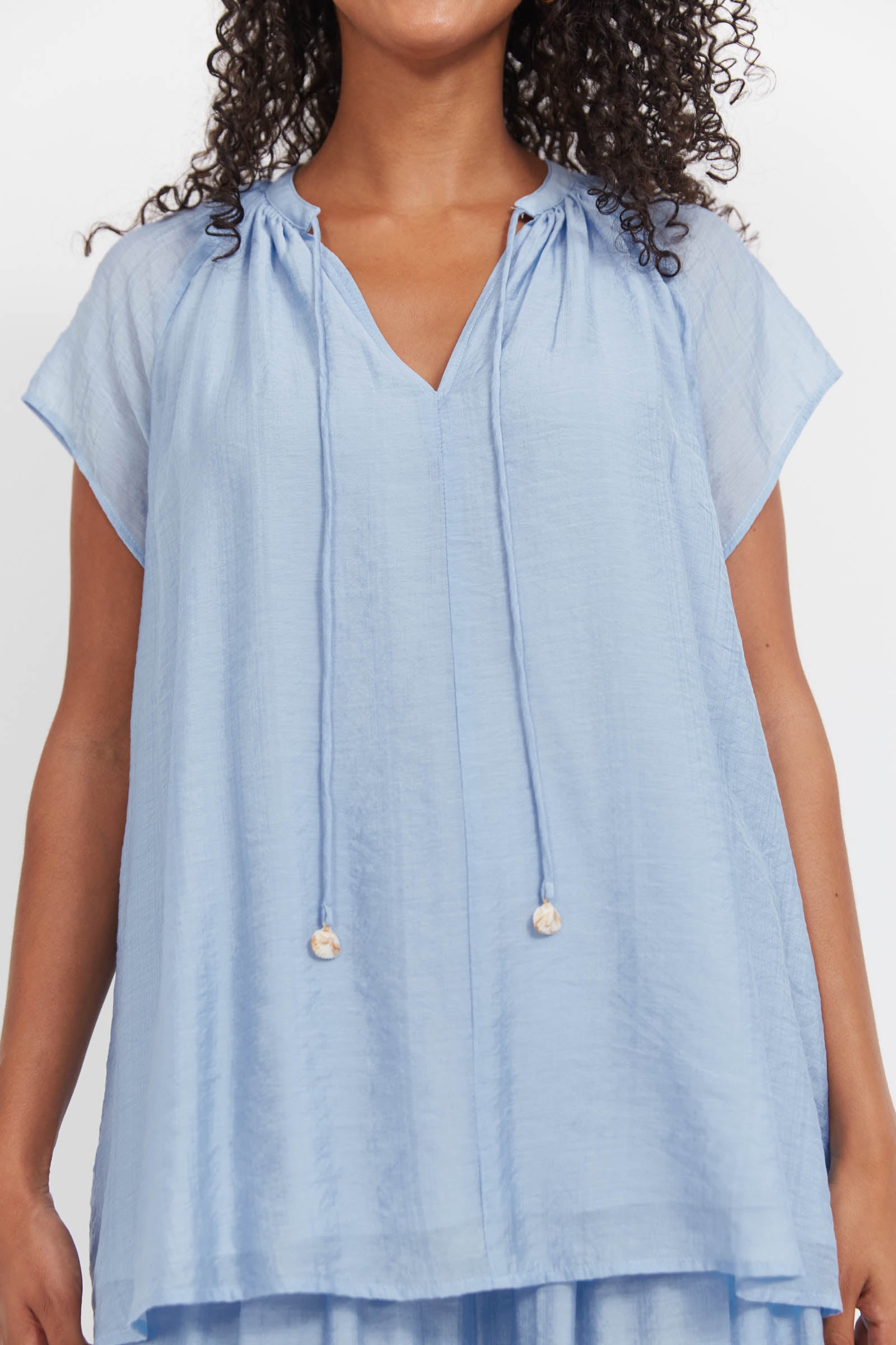 An easy-wear staple with a soft subtle shimmer, the Baja Top is designed for relaxed summer days. Featuring a V-neckline with shell charm-tipped ties, gentle gathering, flutter sleeves, and a swing hem, it offers a flattering, floaty silhouette.