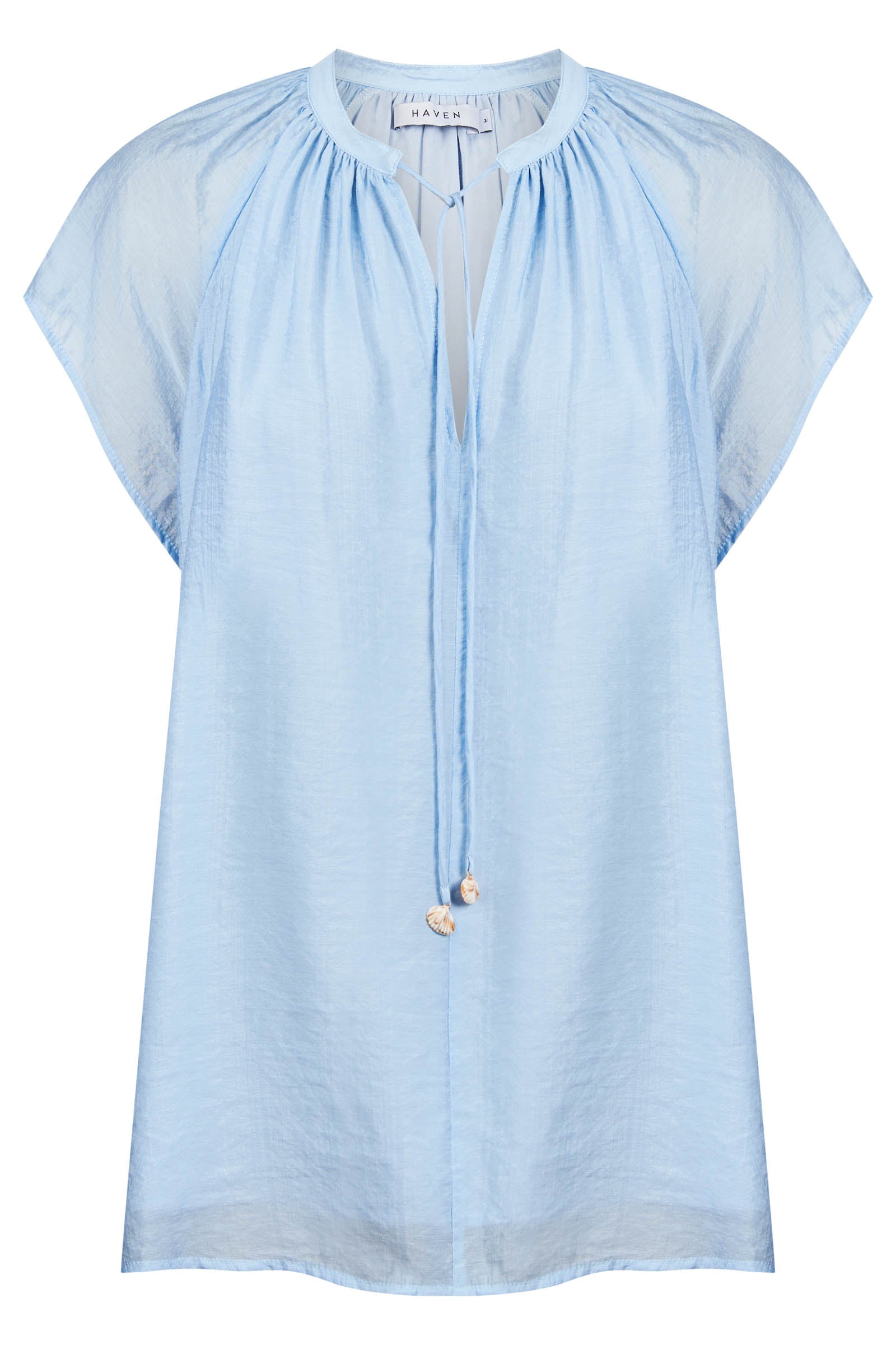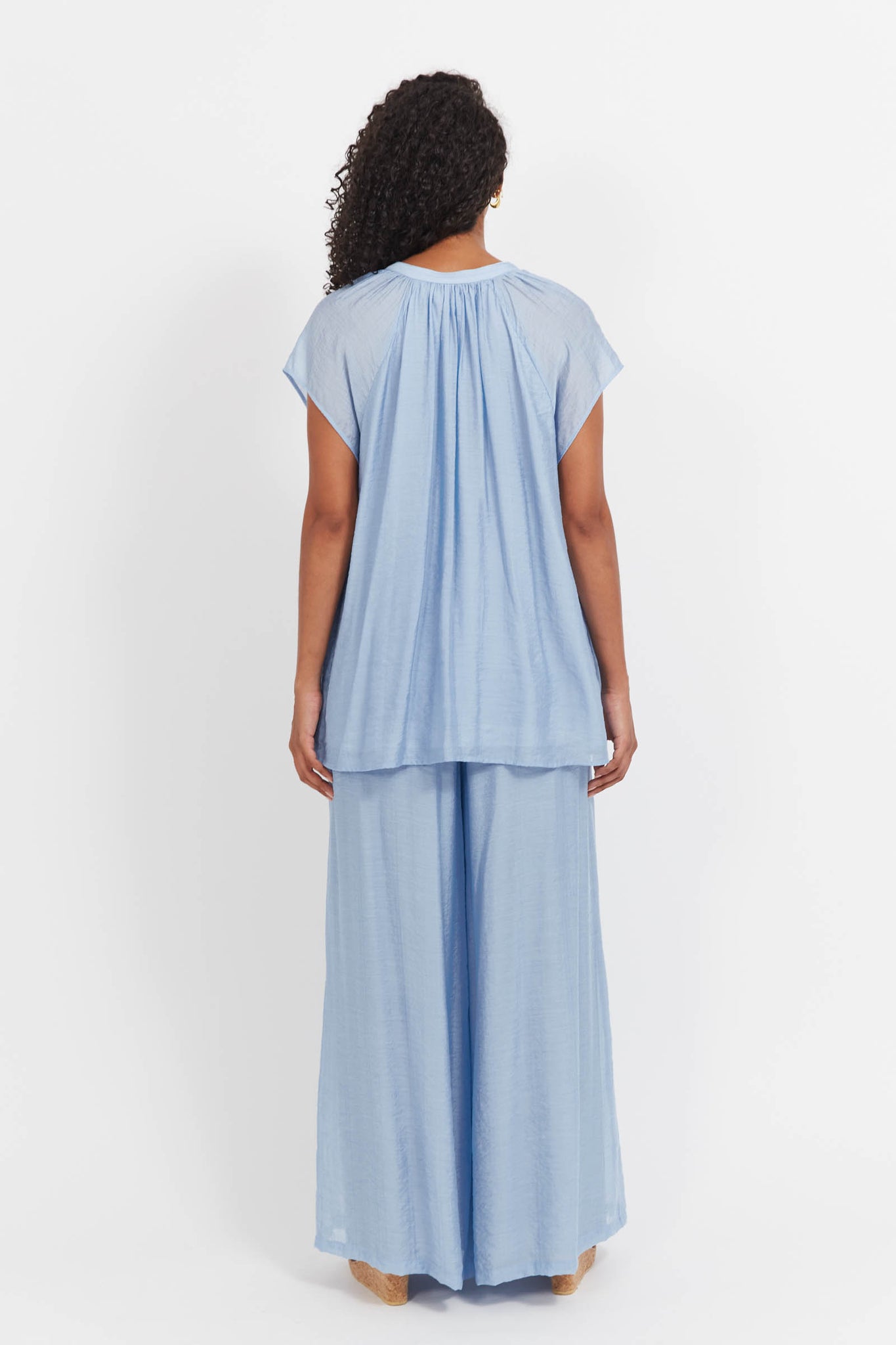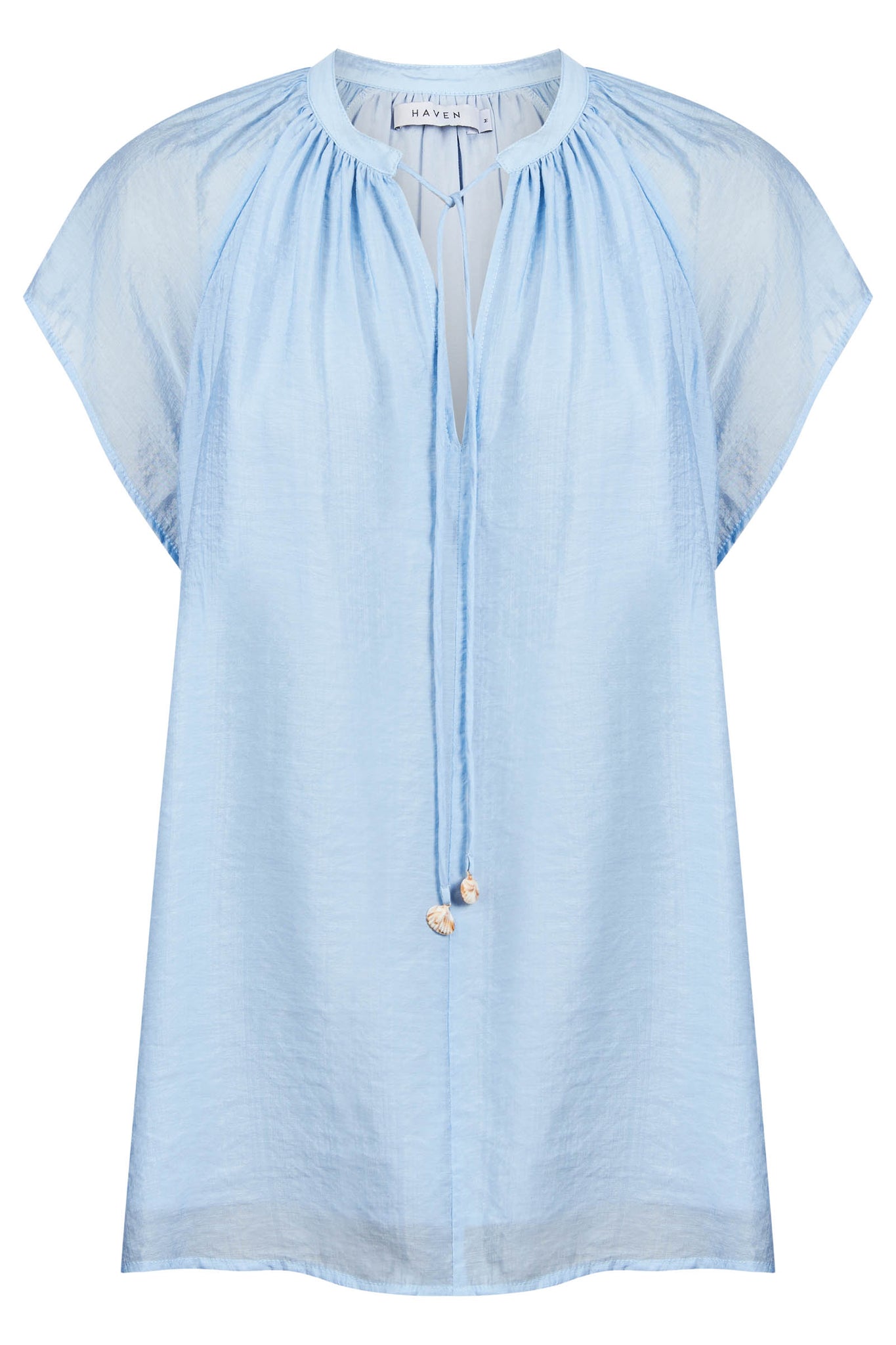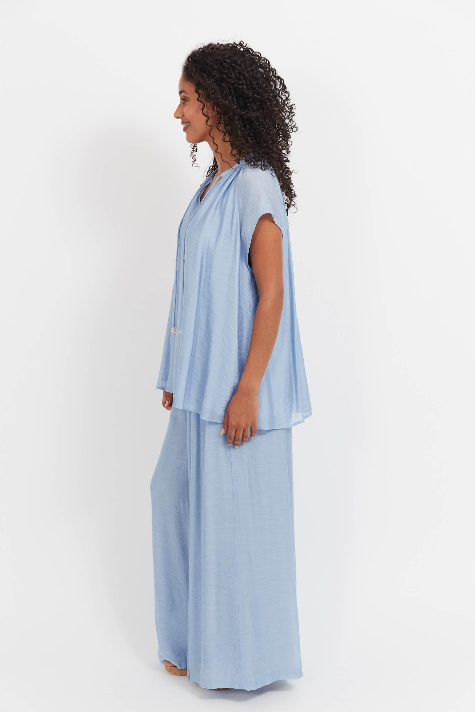 An easy-wear staple with a soft subtle shimmer, the Baja Top is designed for relaxed summer days. Featuring a V-neckline with shell charm-tipped ties, gentle gathering, flutter sleeves, and a swing hem, it offers a flattering, floaty silhouette.