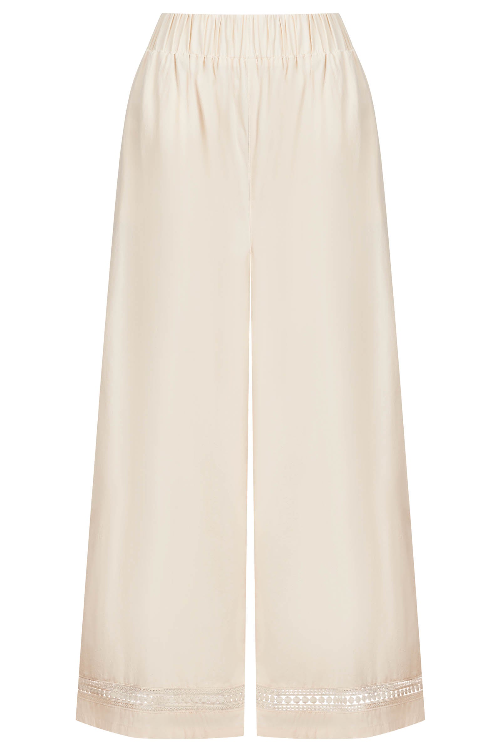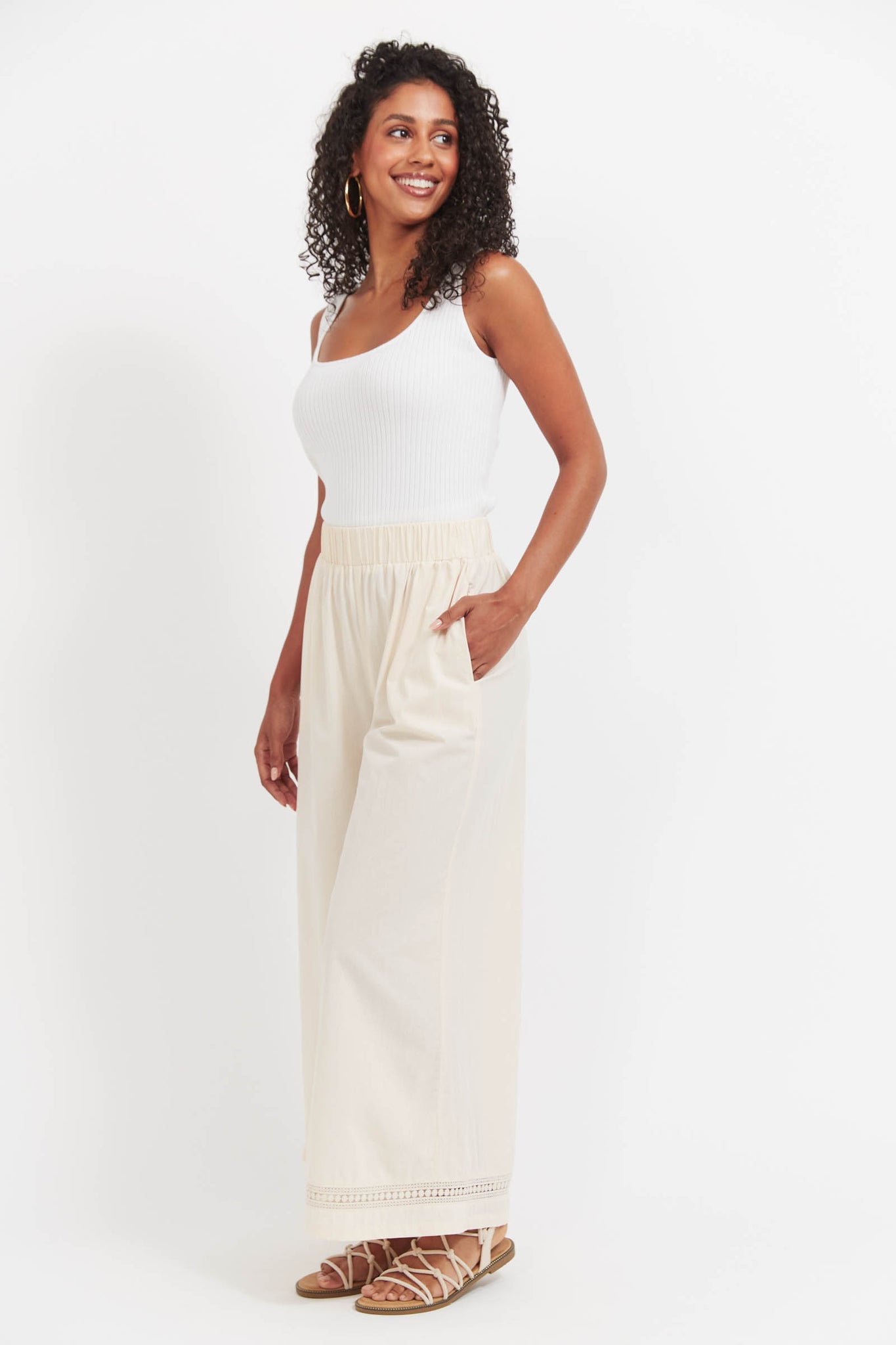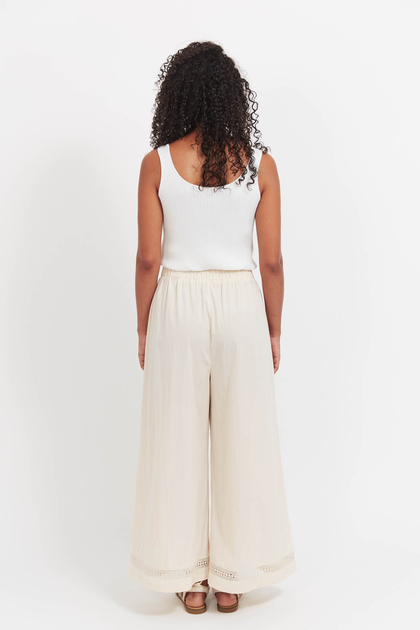 With a wide-leg silhouette, 7/8 length, and soft cotton feel, the Santos Pant strikes the perfect balance between casual comfort and refined. The wide elasticated waistband makes for an easy pull-on fit, while lace trim at the hem adds a feminine finish. Whether you're poolside or exploring a new city, pair it with a tucked-in tank or the matching Santos Shirt. Just add woven platform sandals and shimmering accessories.