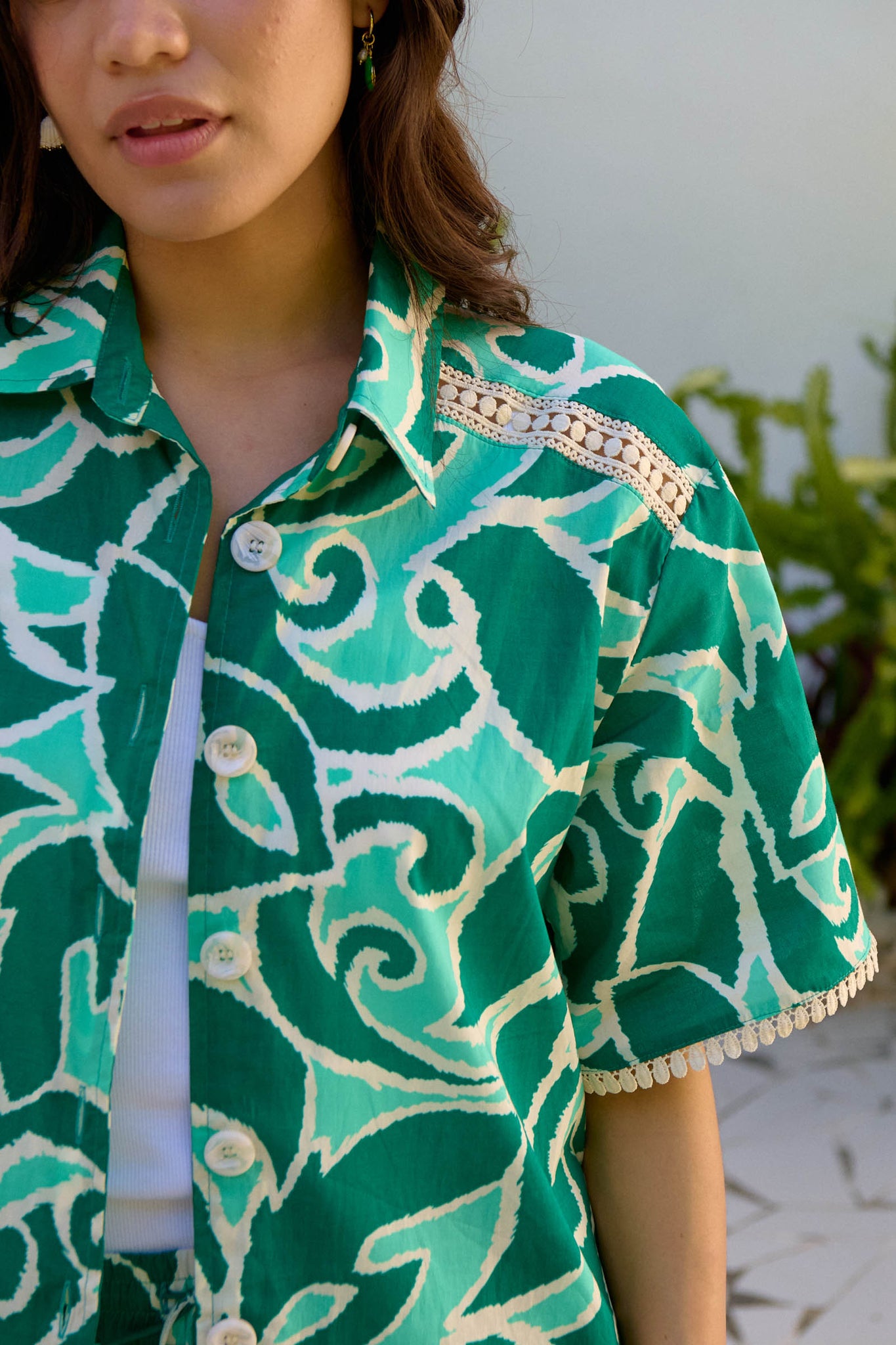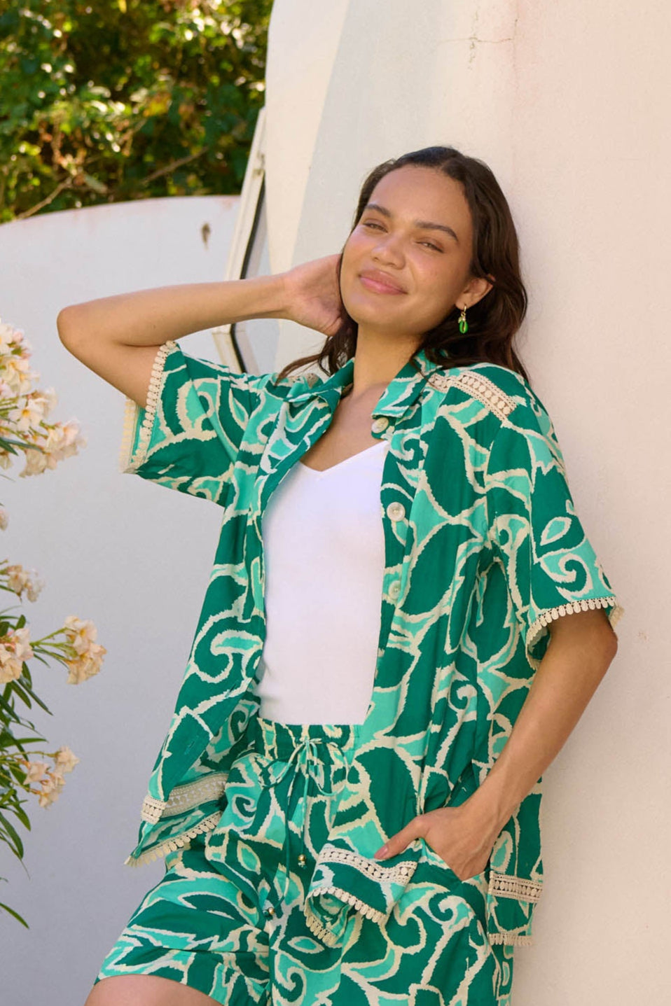 The Santos Shirt is your summer shirting upgrade - lightweight, breathable, and finished with sheer lace inserts for a soft, feminine touch. Designed with a button-through front, classic collar, and side splits for movement, it falls to a flattering below-hip length for easy layering. Throw it on over the Santos Pant with woven slides and a statement earring for an effortless holiday look that goes from beachside to dinner.
