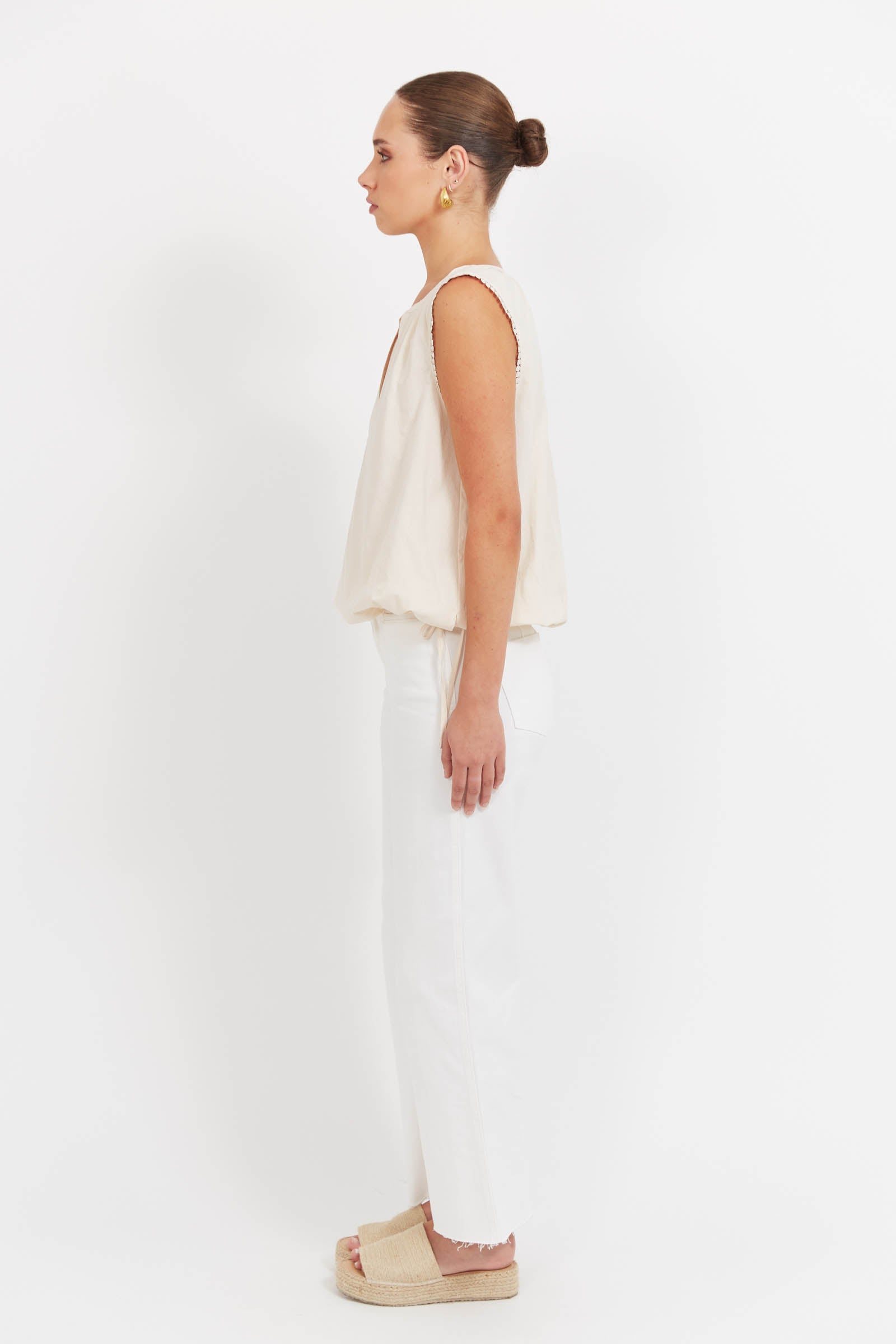 The Santos Top combines lightweight cotton with soft detailing for a flattering, feel-good fit. Featuring a gathered V-neckline, lace-trimmed shoulders and a relaxed silhouette. An adjustable drawstring hem lets you style it loose or cinched, depending on your day.