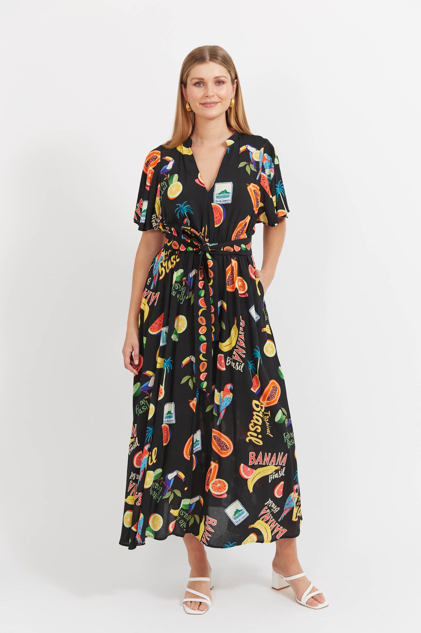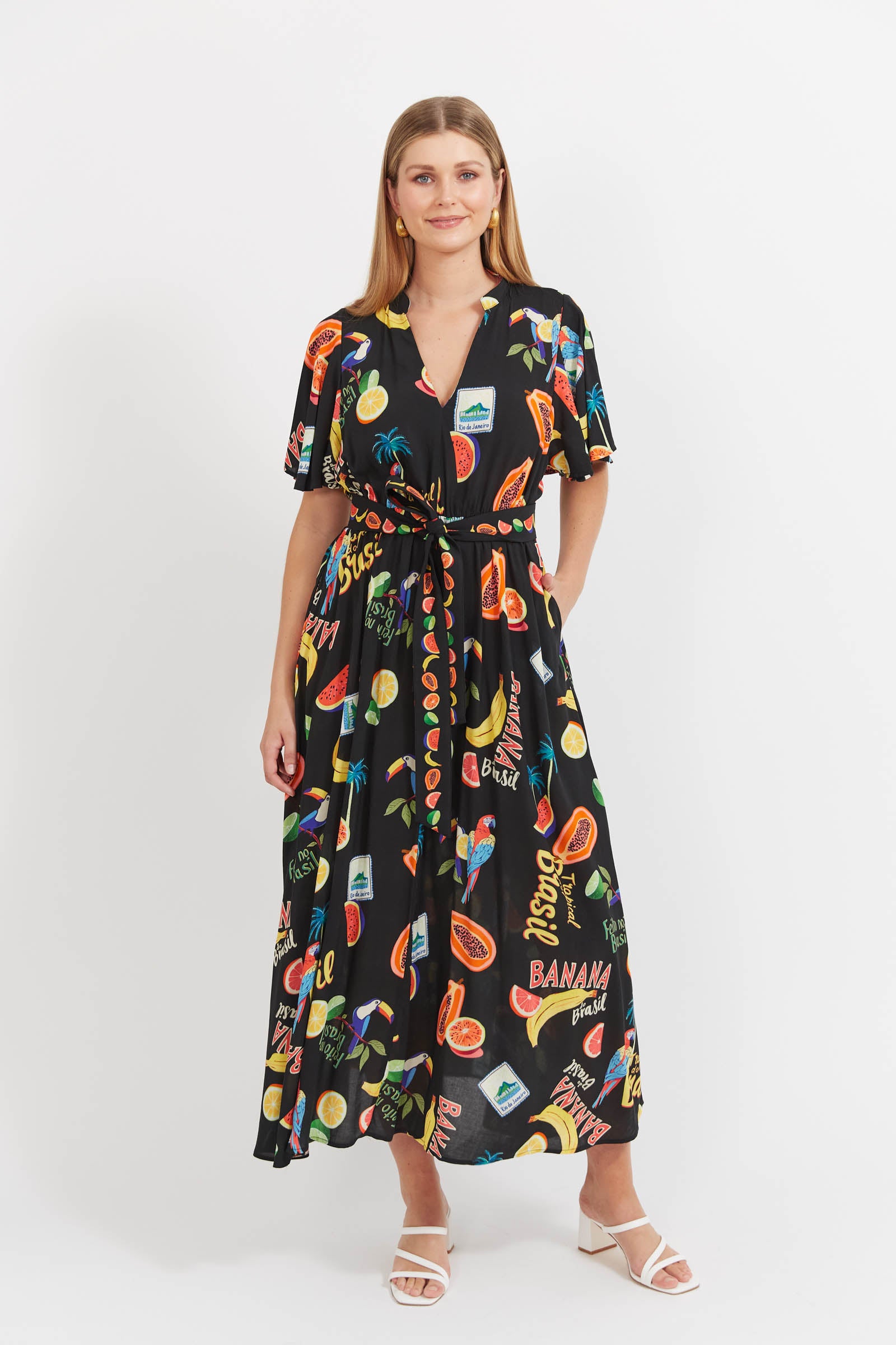 With a flattering V-neckline, soft flutter sleeves, and a flowing silhouette, this dress is made for days when you want to feel put together without the fuss. The elasticated waist adds gentle shape, while the removable contrast belt lets you style it your way. Finished in a full maxi length with handy side pockets, it's as practical as it is pretty.