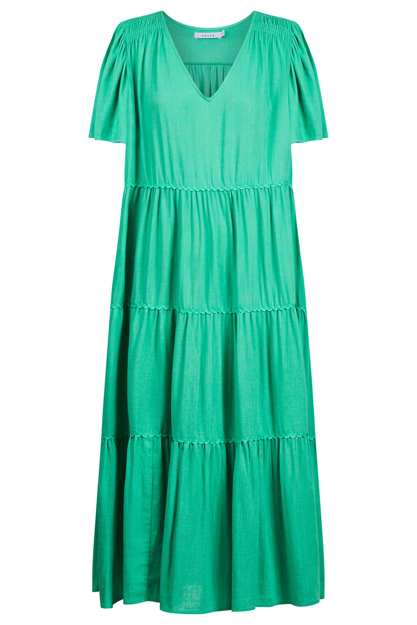 Whether it's lunch with friends or barefoot beach strolls, the Haiti Maxi Dress strikes the perfect balance between coverage and carefree style. With soft flutter sleeves for sun protection, a relaxed fit, and tiered panels trimmed with playful ric-rac, it's designed for warm days that roll into golden evenings.