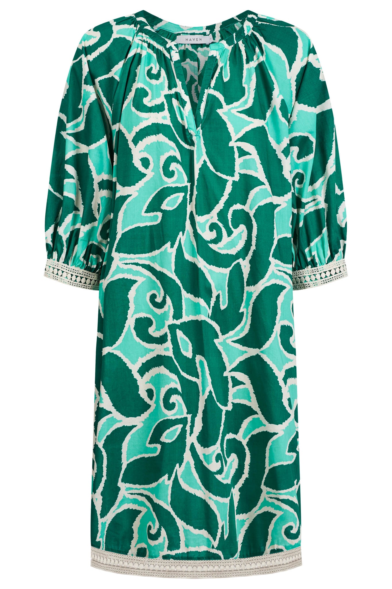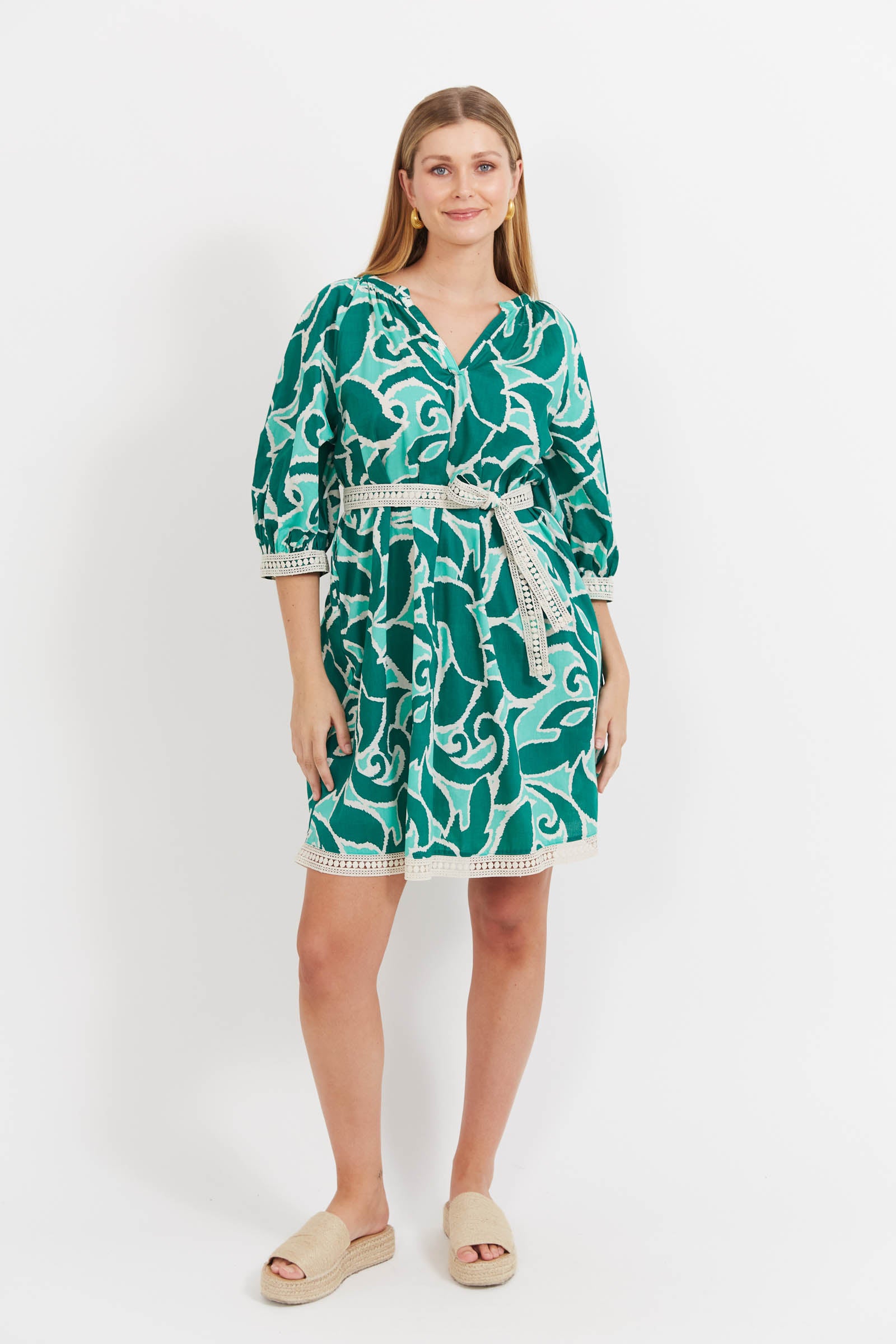 The Santos Dress is crafted from soft, breathable cotton and finished with delicate lace inserts at the hem and sleeves for a subtle, feminine touch. The relaxed silhouette features a V neckline with gentle gathers, 3/4 sleeves for added sun coverage, and a self-fabric belt so you can wear it loose or cinched to suit your style.