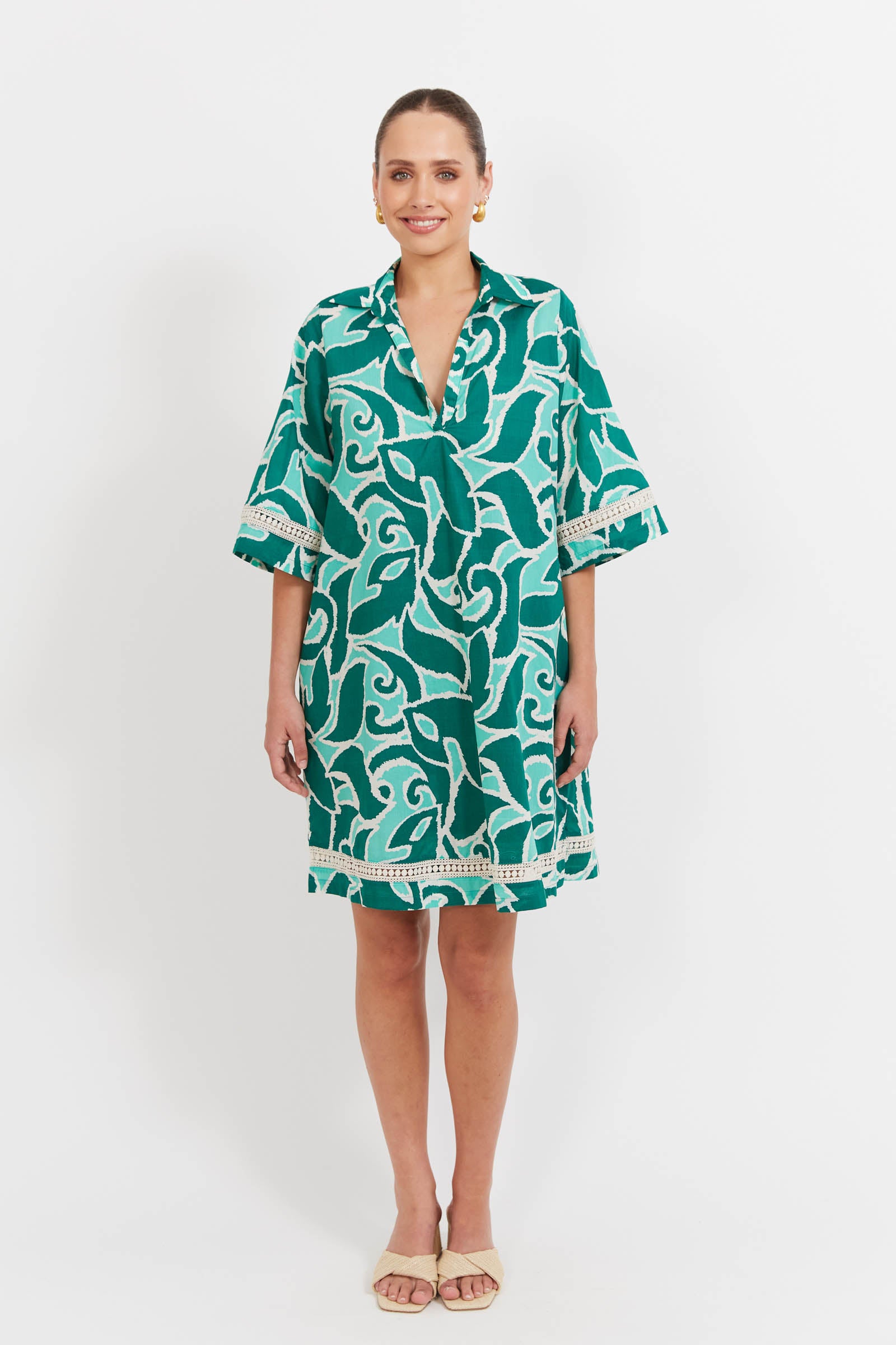 The ultimate throw-on dress with a luxe twist. The Santos Shift Dress is all about easy elegance. Featuring a relaxed silhouette, 3/4 sleeves, and a Johnny collar with a V-neck tab opening, lace insert detailing at the sleeves and hem and internal side pockets. Crafted from 100% cotton and cut to a comfortable knee length, it's perfect for market mornings, beachside brunch, or wherever your summer takes you. Just add strappy sandals and a woven hat.