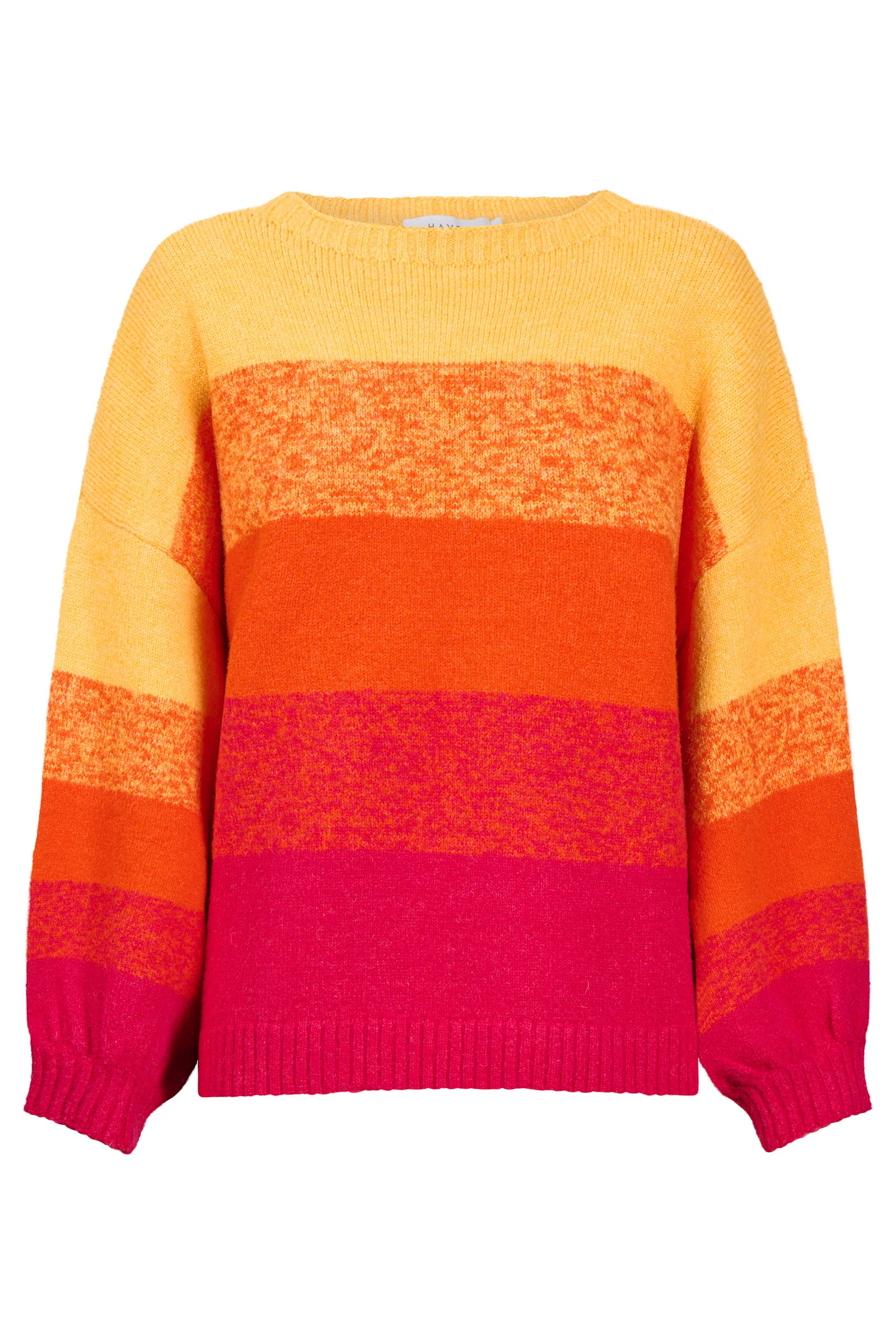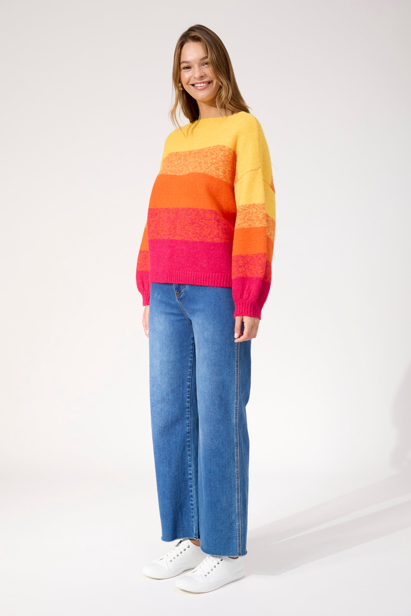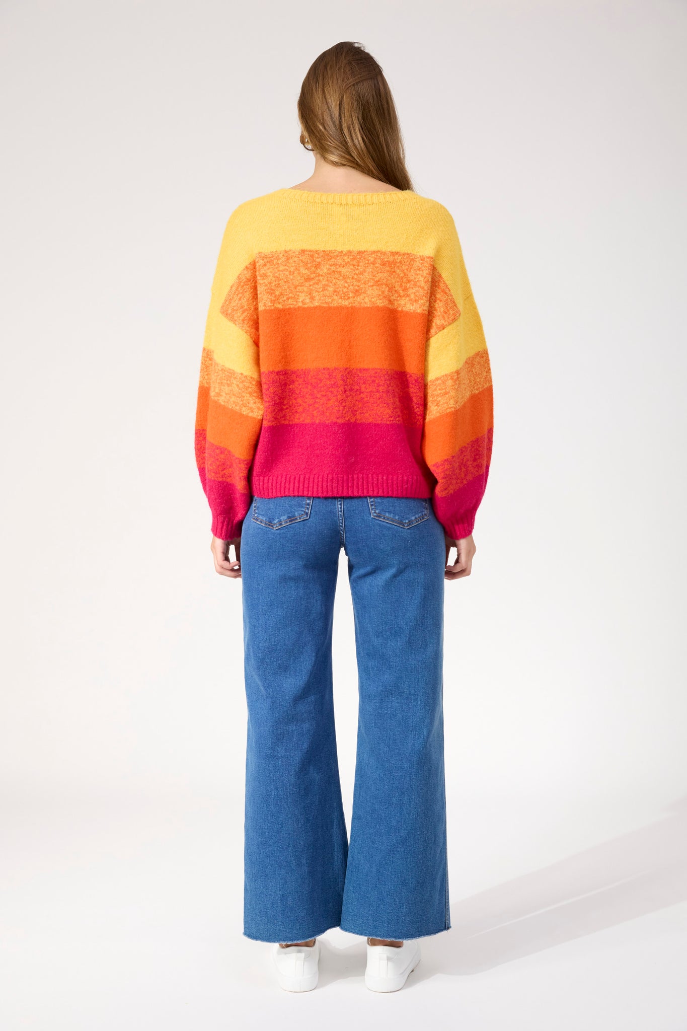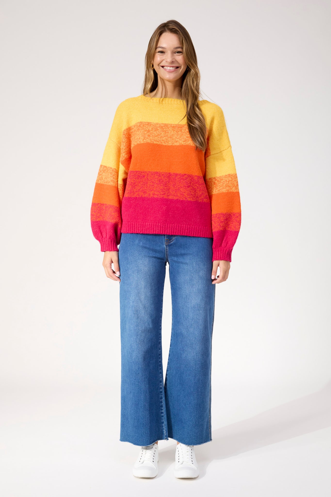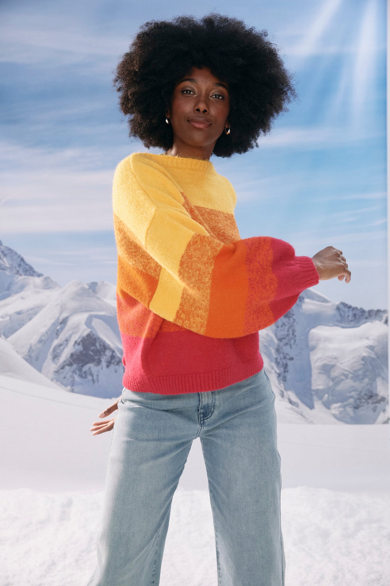 A cosy statement knit designed with comfort at its core. The Valenza Jumper features a custom degrade stripe design that blends soft pastels into warmer tones, creating a relaxed, Nordic-inspired colour story. The textured knit adds depth, while oversized balloon sleeves and drop shoulders give it that effortless, après-ski feel.