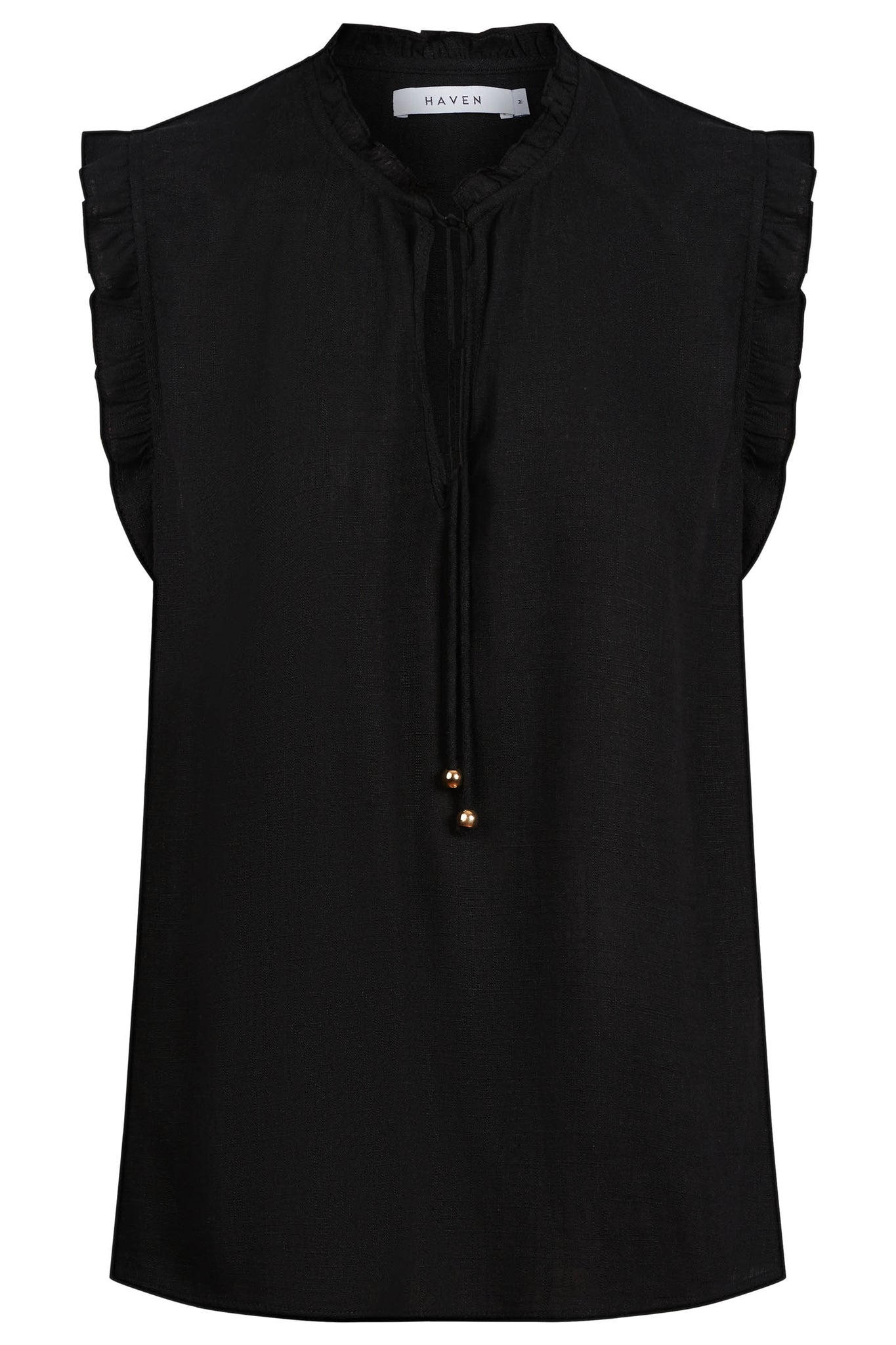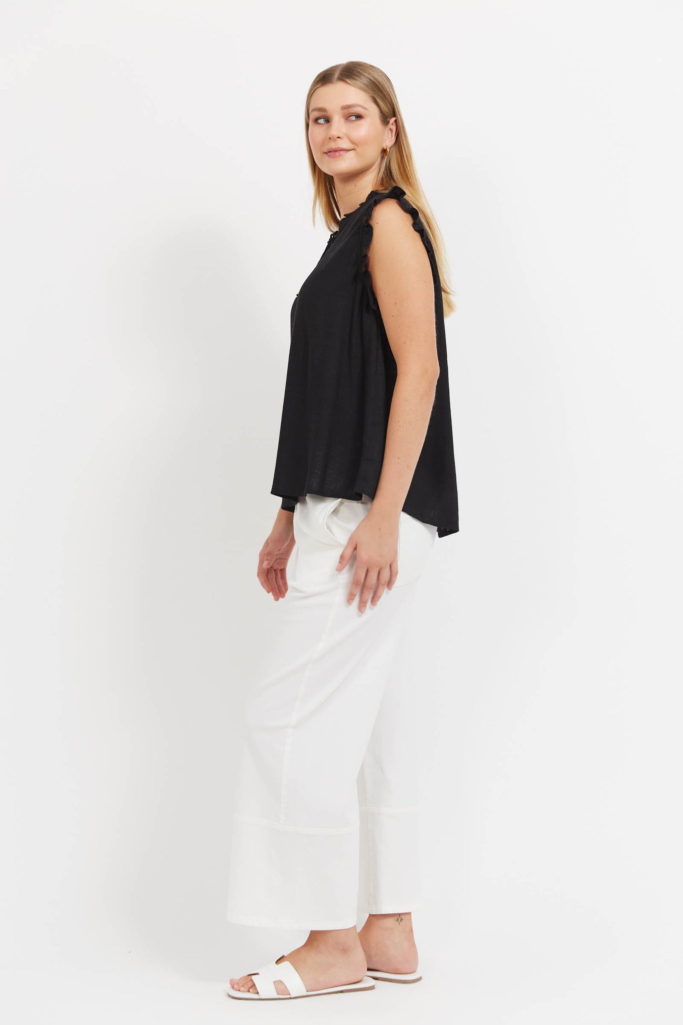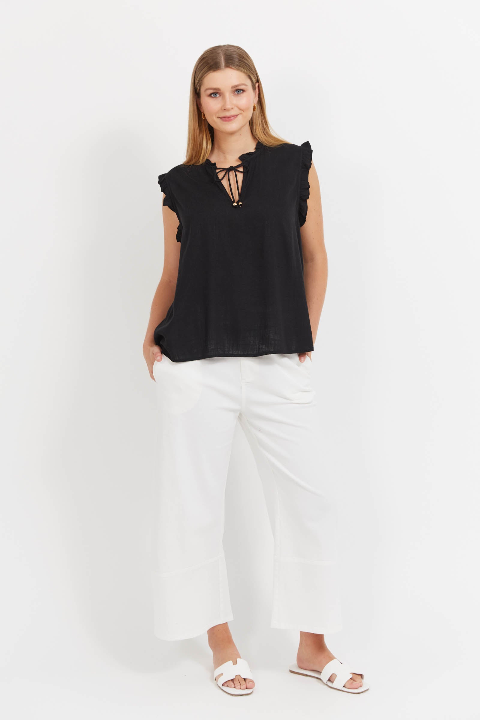 Light, feminine, and easy to wear. Crafted from a breezy linen blend, the Jardin Top features a flattering V neckline with soft ruffle detailing, extended shoulder sleeves, and delicate front ties finished with gold bead accents. Designed to fall at the hip, it's a versatile piece you can dress up or down.