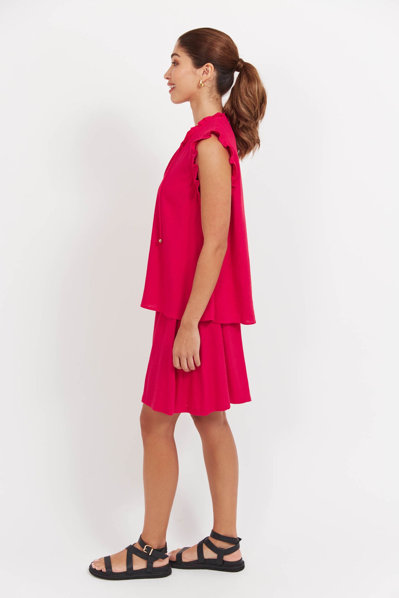 - Extended shoulder sleeve with ruffle edge