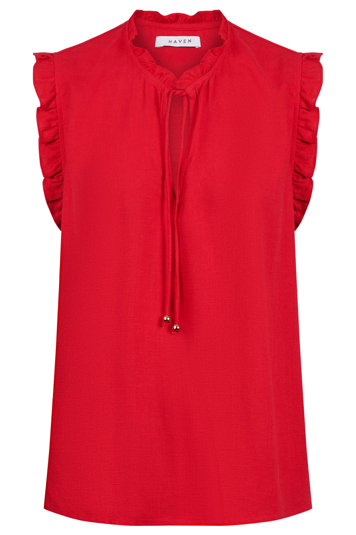 Light, feminine, and easy to wear. Crafted from a breezy linen blend, the Jardin Top features a flattering V neckline with soft ruffle detailing, extended shoulder sleeves, and delicate front ties finished with gold bead accents. Designed to fall at the hip, it's a versatile piece you can dress up or down.
