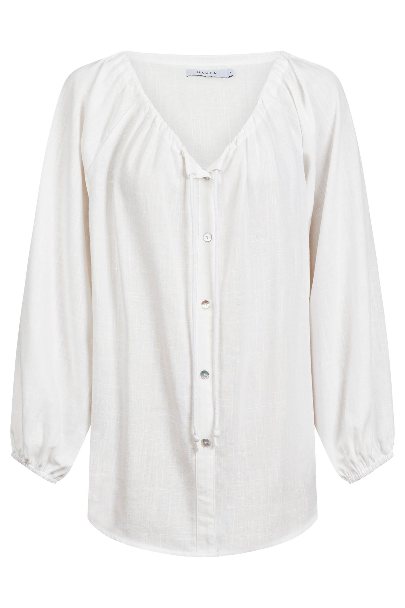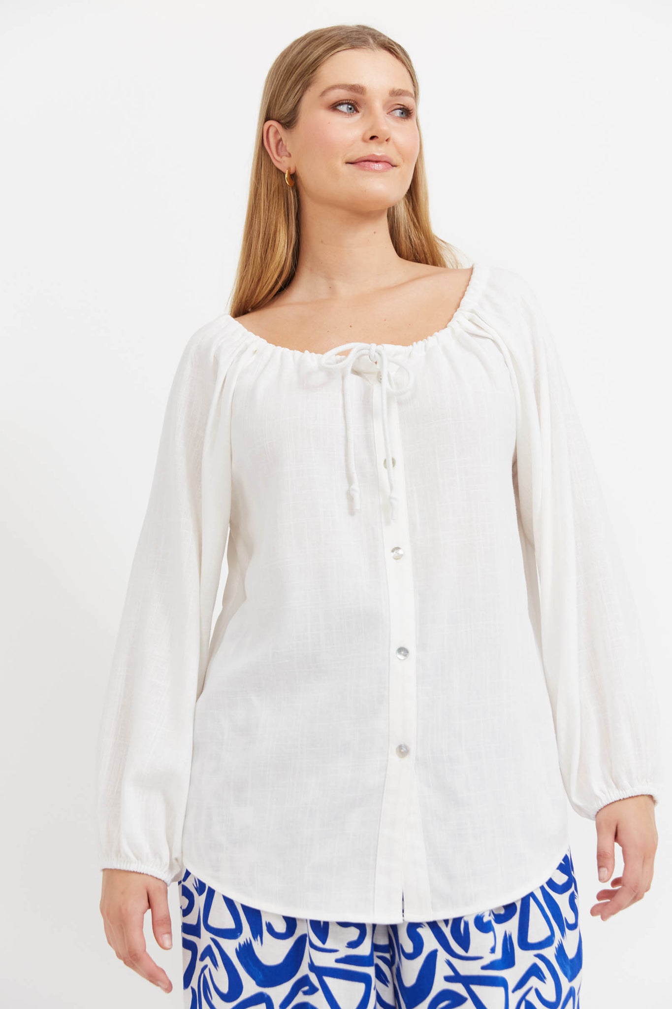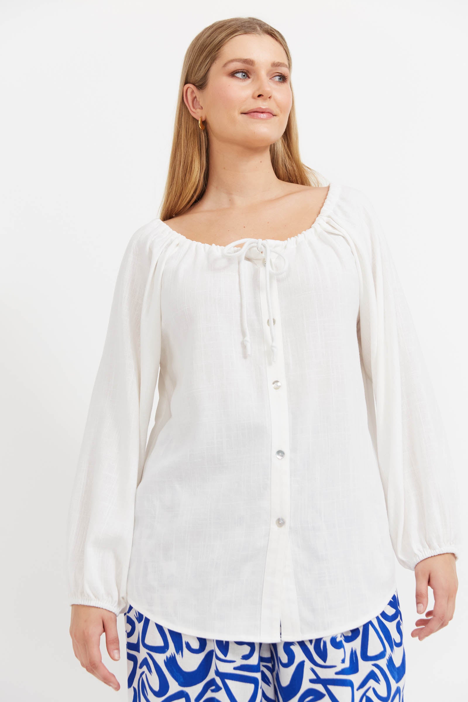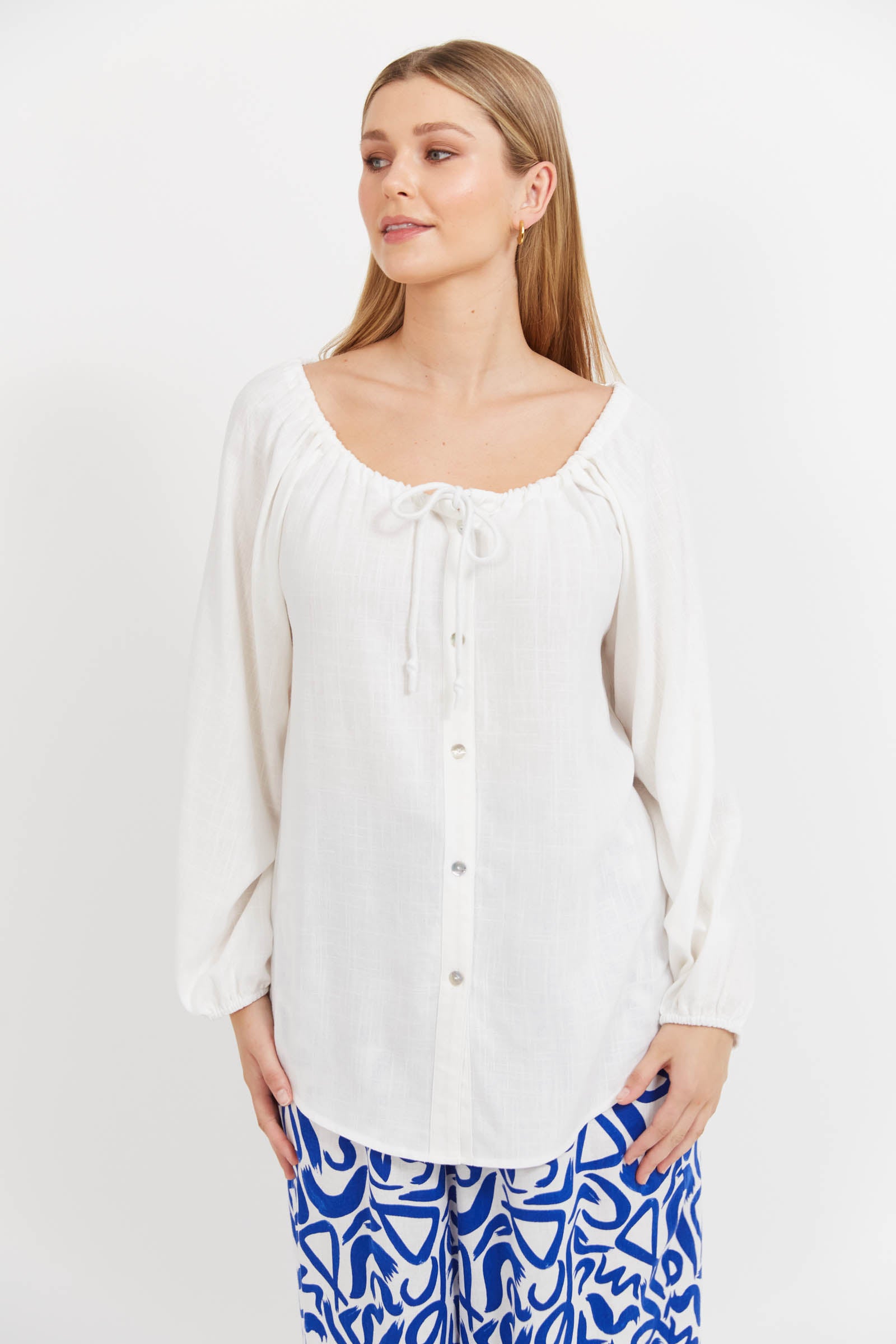 Light and lovely, the Bahama Button Tie Top is a dream for warm weather. The prairie-inspired neckline can be adjusted to sit higher or lower, while the button-down front and long sleeves offer gentle coverage. It's ideal for days when you want sun protection without sacrificing style.