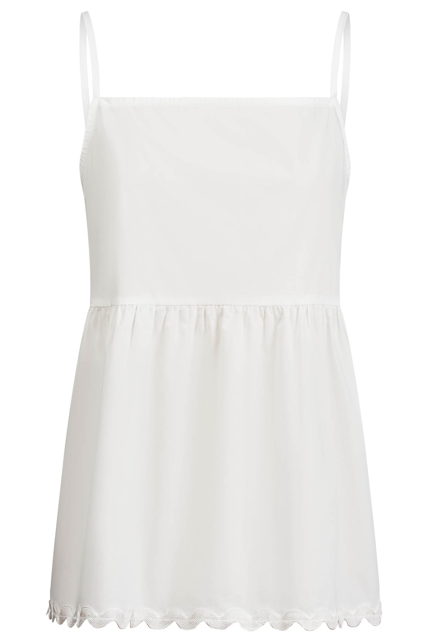 Crafted from 100% cotton, the Brasilia Tank features a square neckline with adjustable thin straps and gold-tone hardware. The softly gathered tiered silhouette and ric-rac trim along the hemline add a playful, feminine touch, while the elasticised back ensures all-day comfort and a flexible fit. Cut to a flattering below-hip length, it offers easy styling over shorts, denim or wide-leg pants. Pair with your favourite summer bottoms for an effortless look that feels fresh and free.