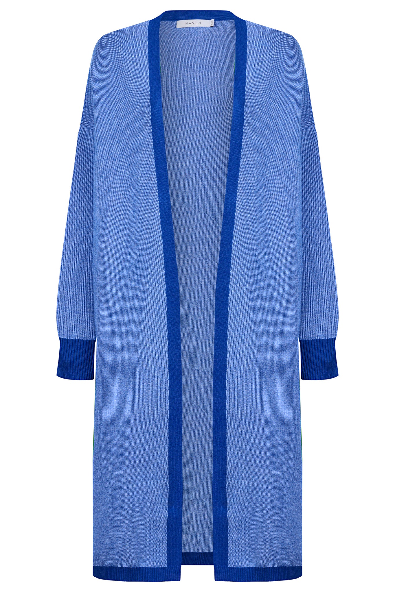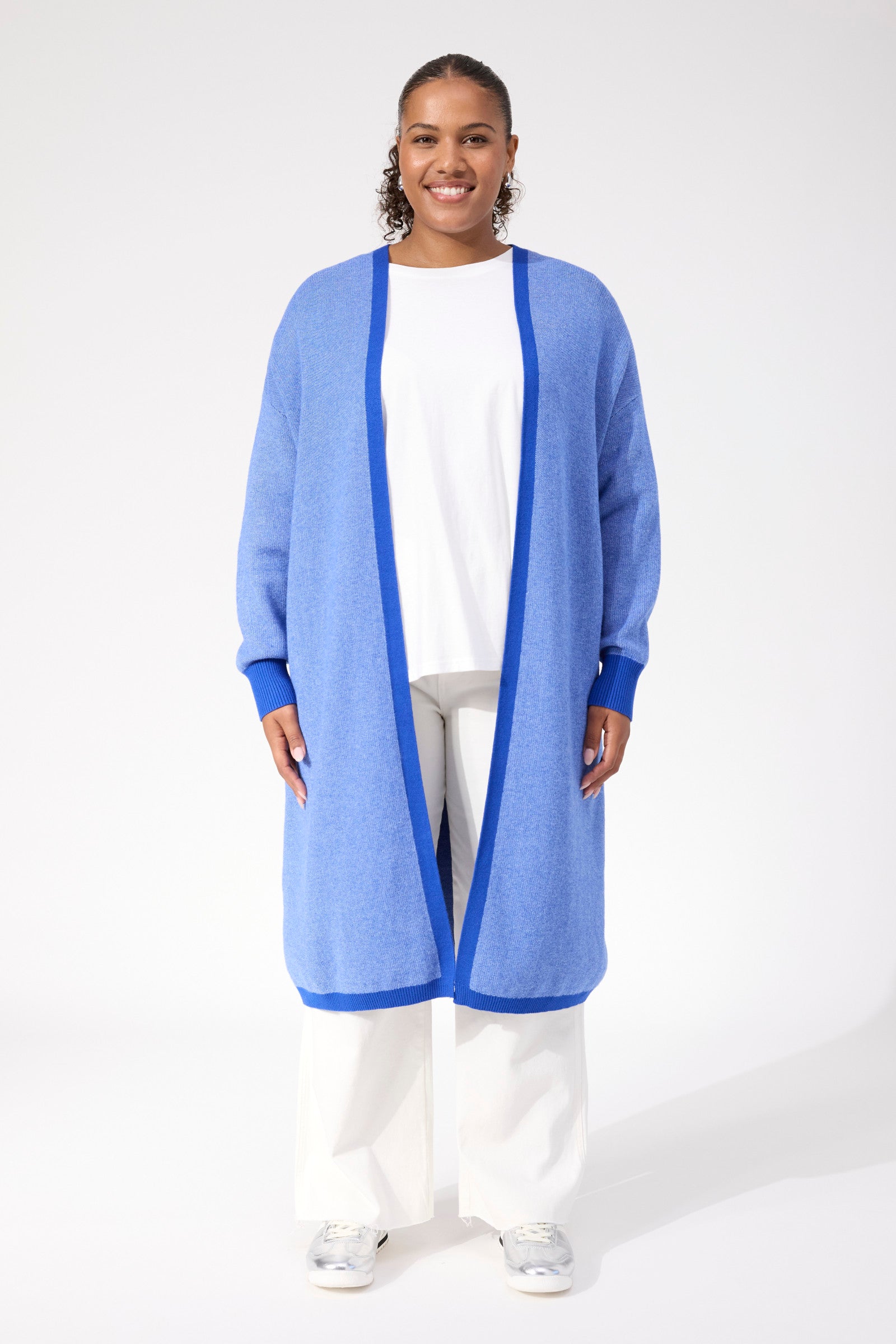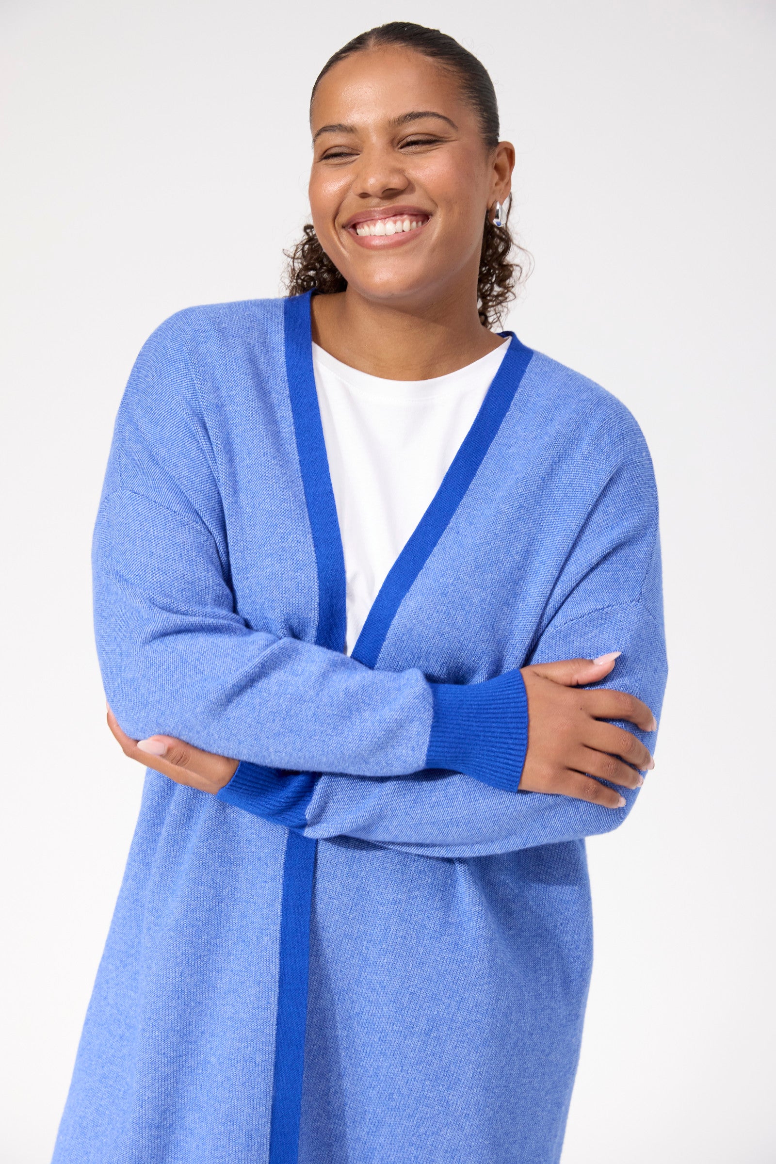 A modern knit layer with bold contrast detailing. The Monterosa Cardigan features a longline silhouette with duotone trims that add structure and interest. A statement cardigan that still feels effortless.