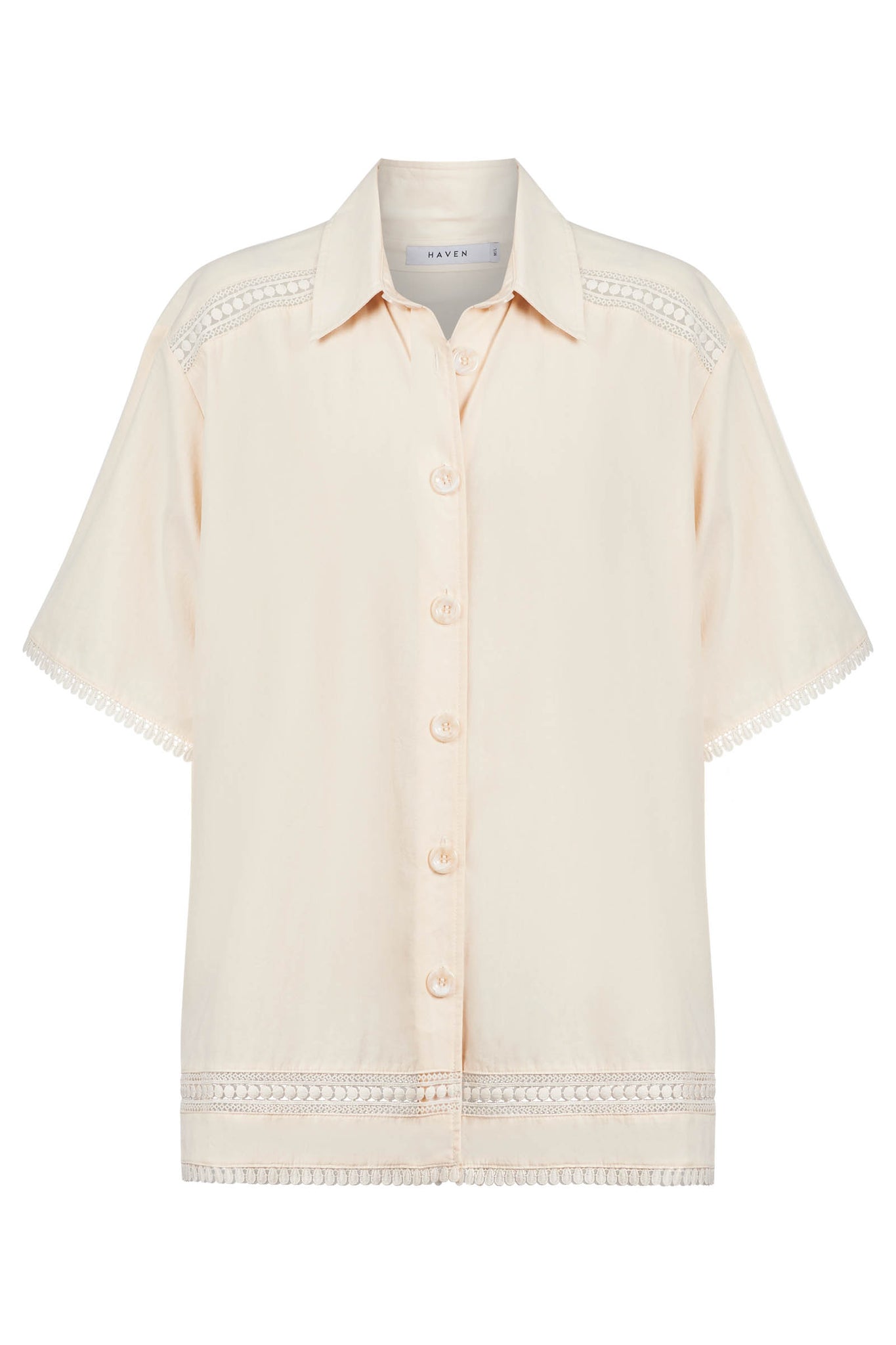 The Santos Shirt is your summer shirting upgrade - lightweight, breathable, and finished with sheer lace inserts for a soft, feminine touch. Designed with a button-through front, classic collar, and side splits for movement, it falls to a flattering below-hip length for easy layering. Throw it on over the Santos Pant with woven slides and a statement earring for an effortless holiday look that goes from beachside to dinner.