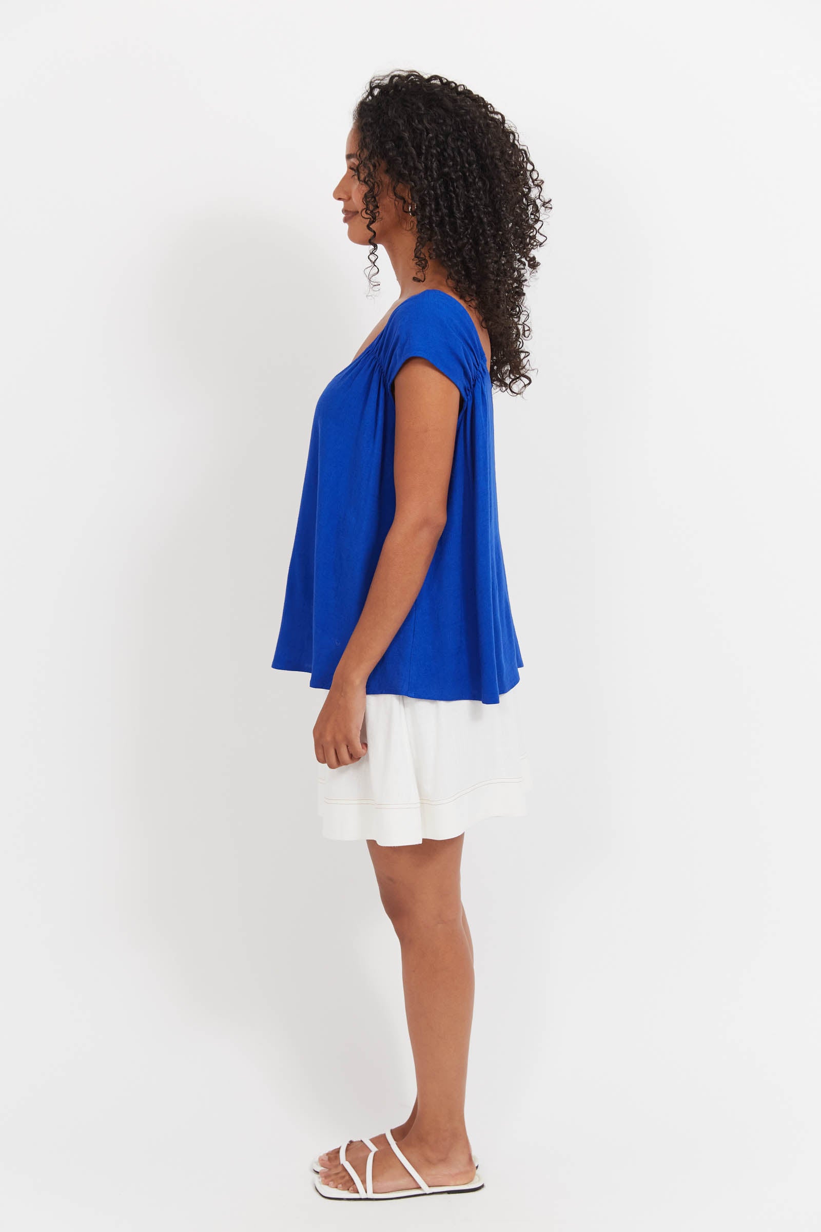The Bahama Tank is your throw-on-and-go essential, designed with a flattering scoop neckline, extended shoulder sleeves, and soft gathered detailing at the straps. Cut in a loose fit from a breathable linen blend, it falls to the hip for versatile styling.