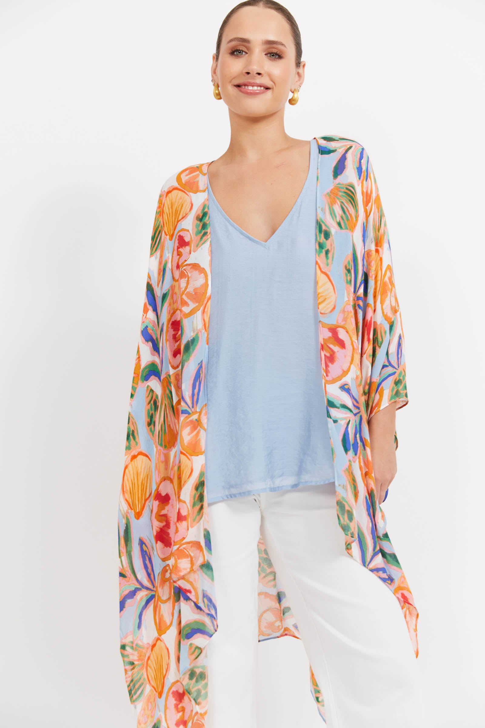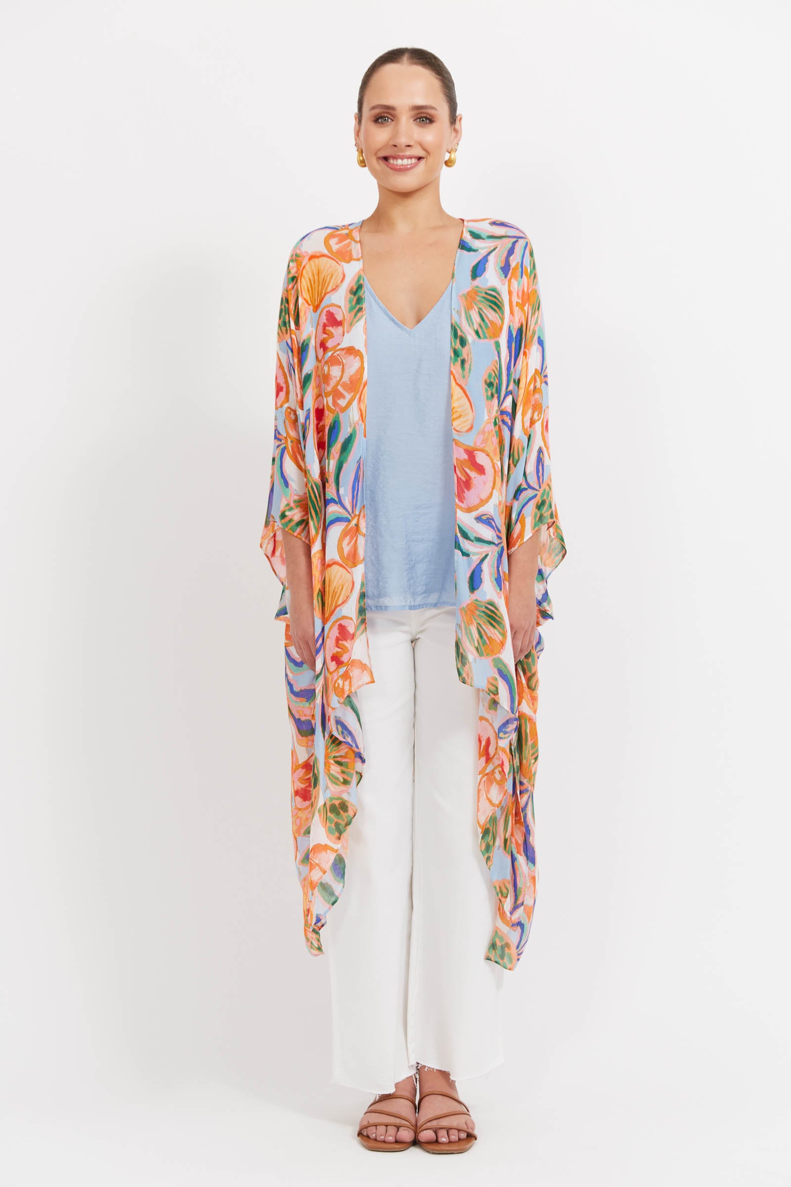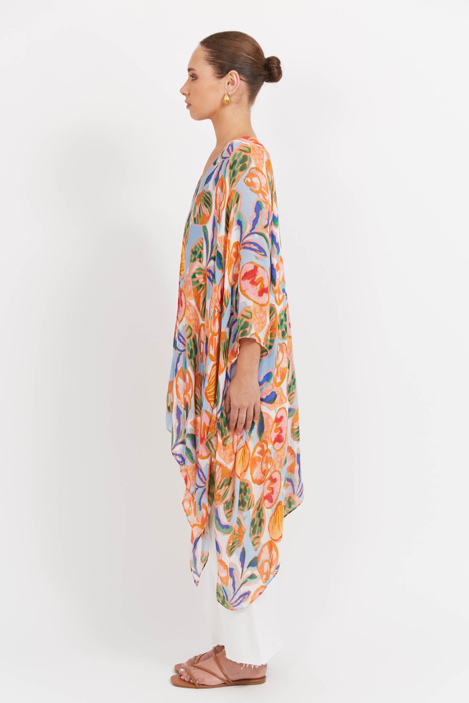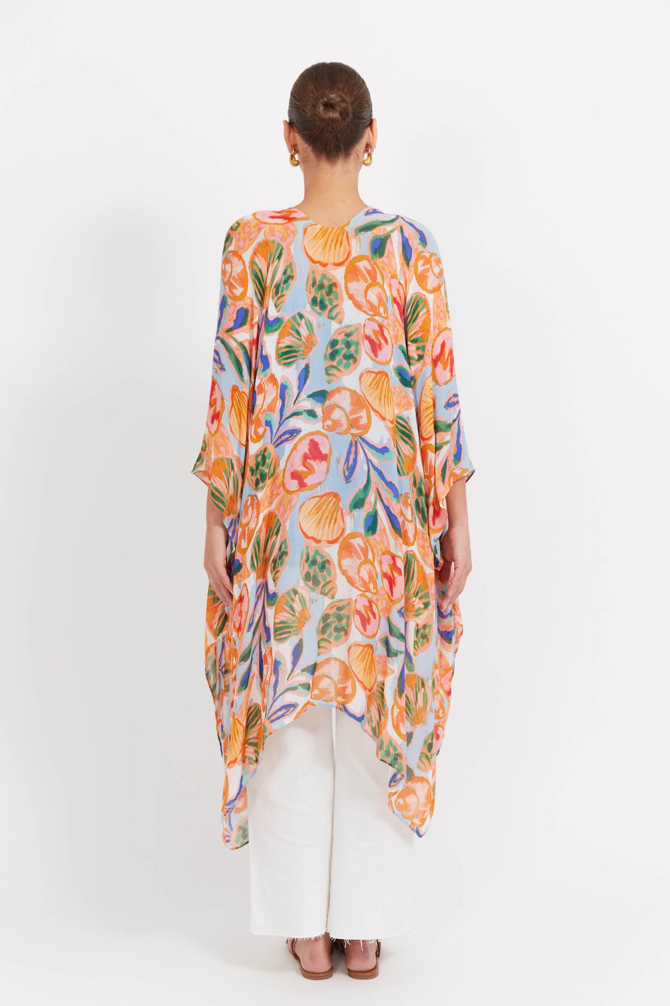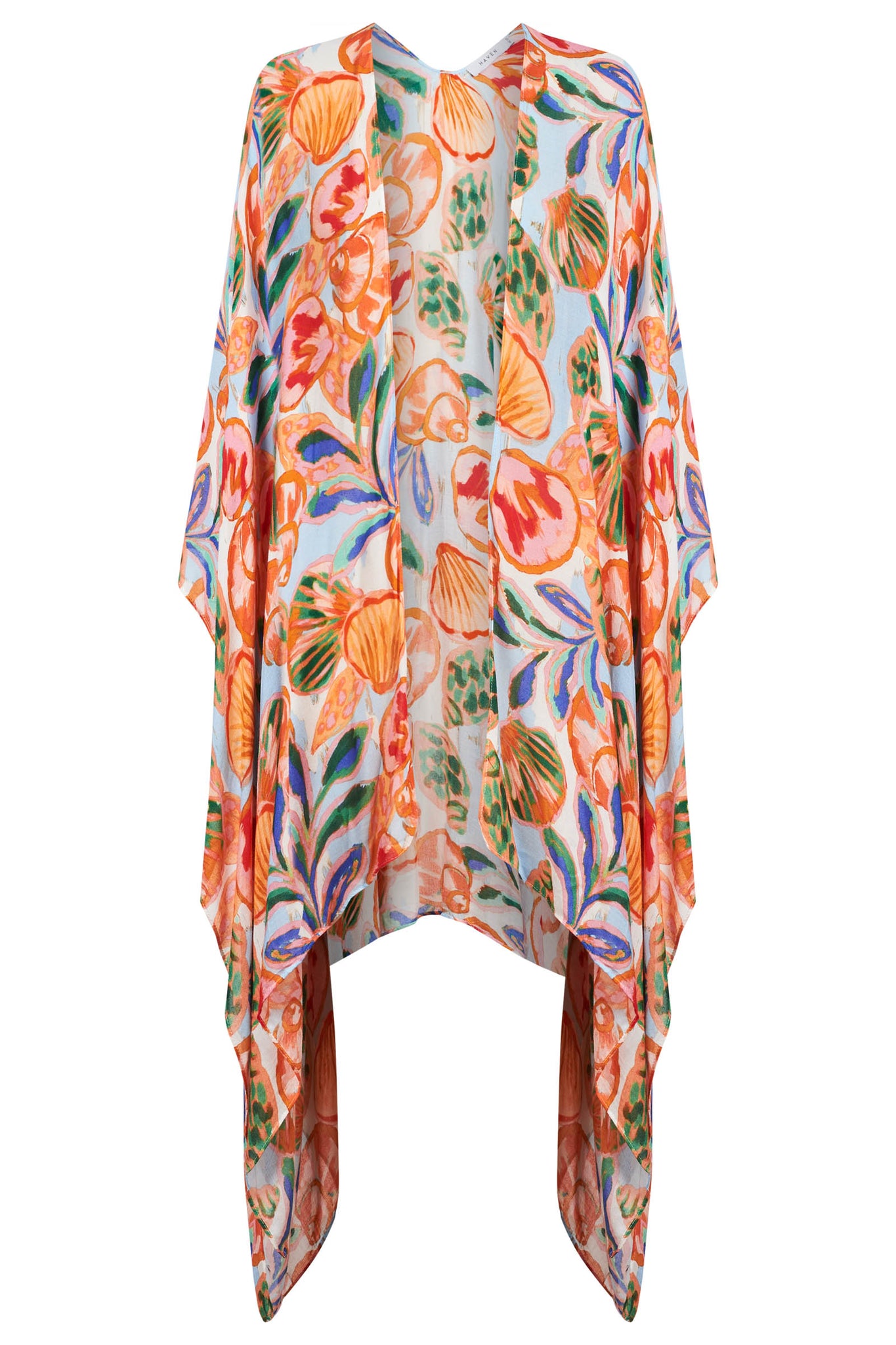 A light layer with a bold touch. The Baja Cape is your go-to for easy sun coverage - whether thrown over swimwear or styled with everyday pieces. Featuring an open-front design, 3/4 length sleeves, side vents, and a flowing handkerchief hem, it adds movement without the bulk. Crafted in a semi-sheer, shell-inspired print, it pairs perfectly with the matching Baja Twist One Piece for a coordinated beach-to-lunch look.