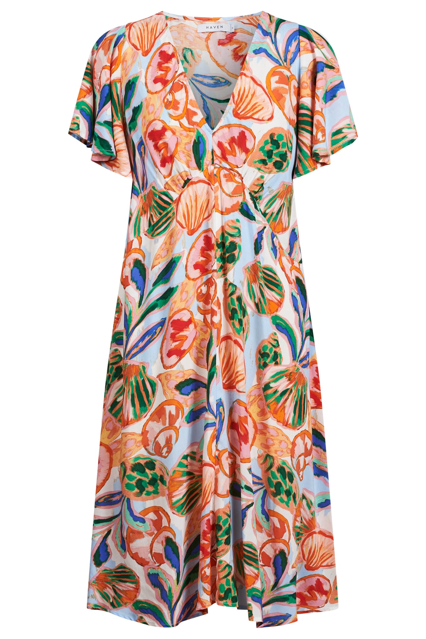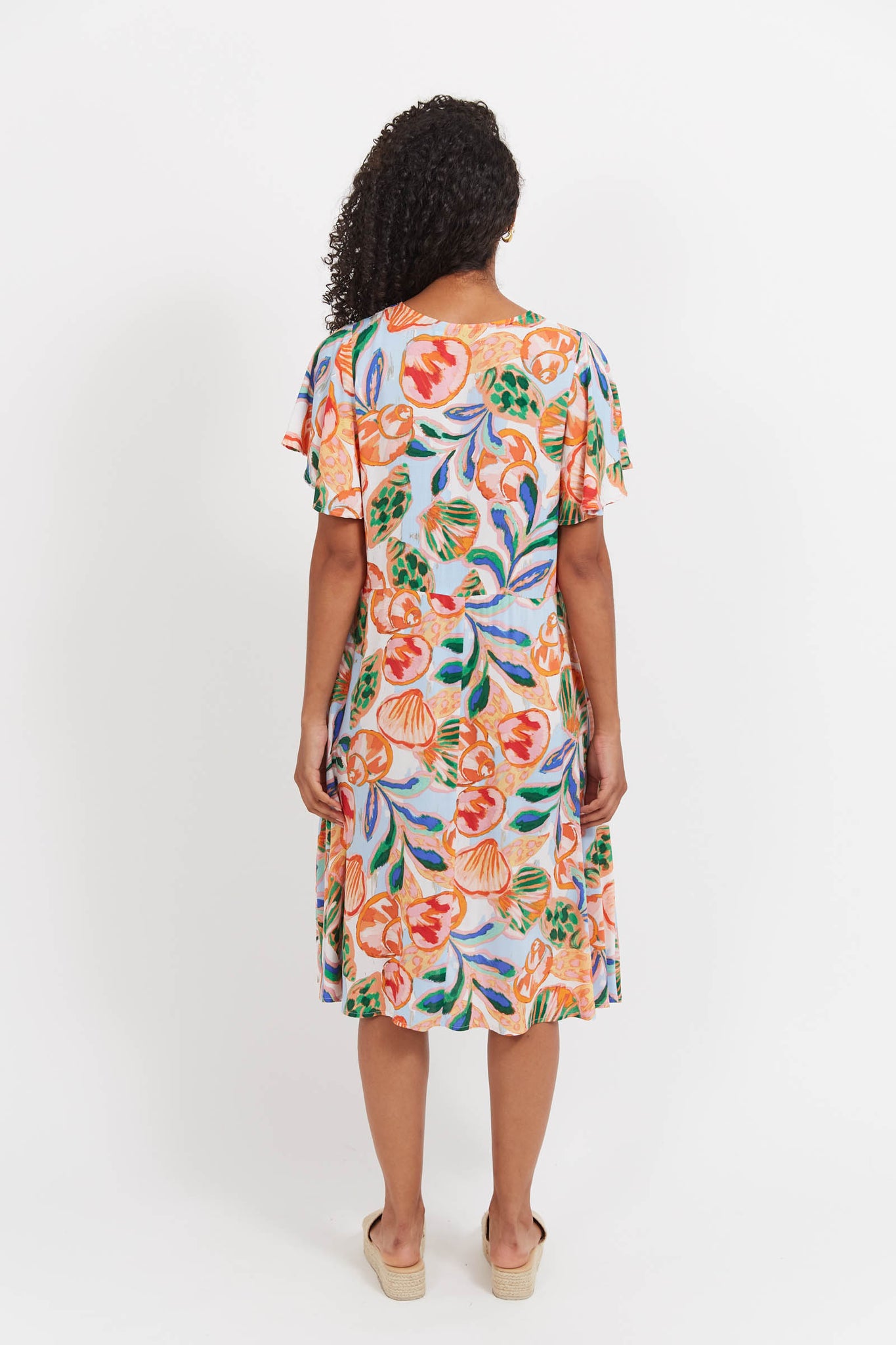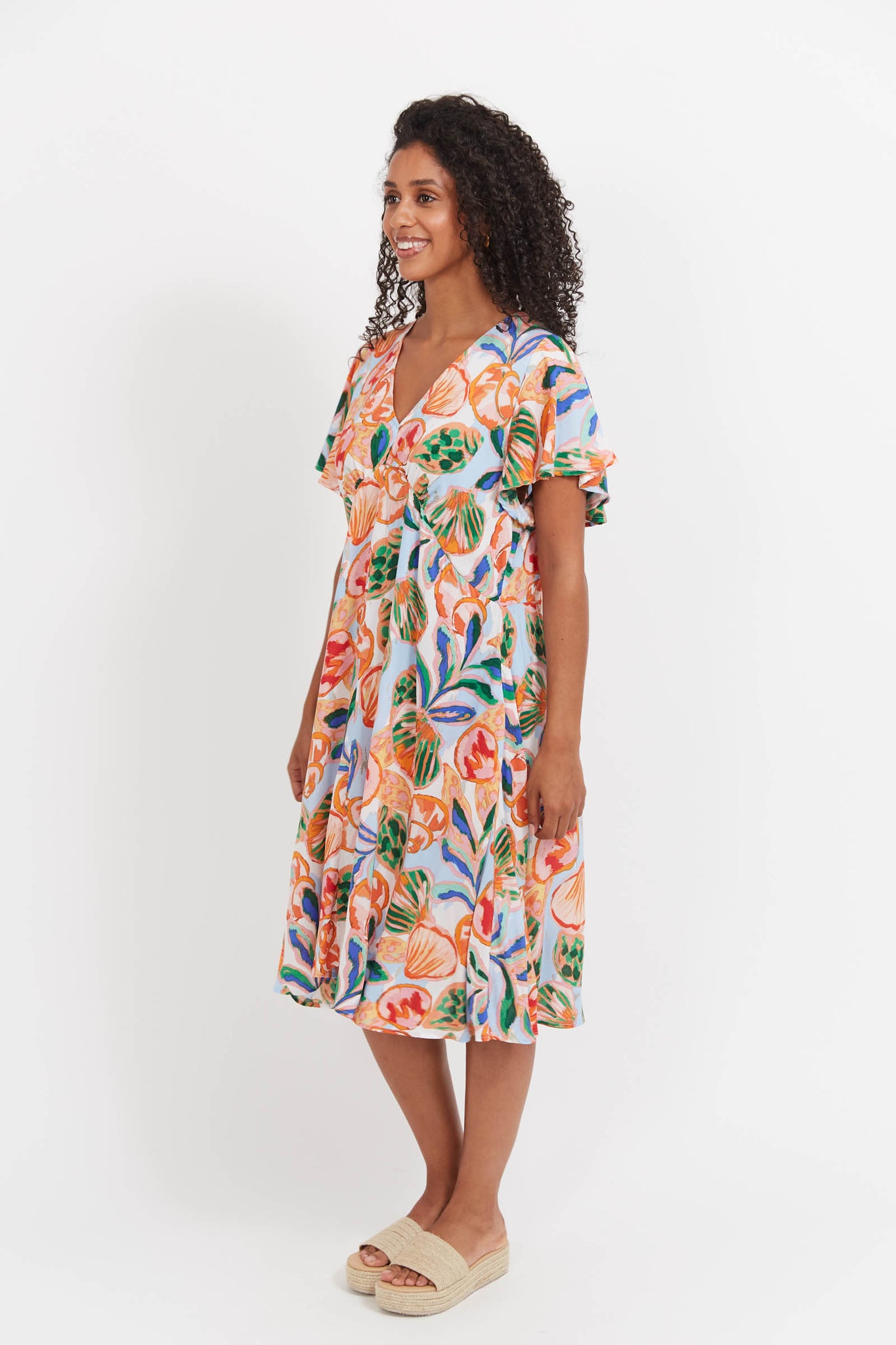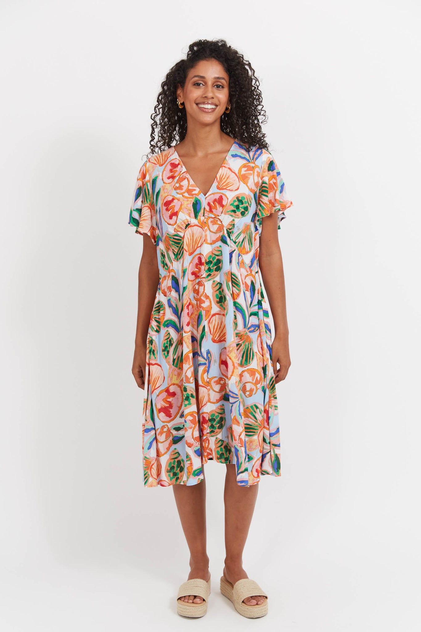 The Baja Dress is your next go-to summer dress. Featuring soft flutter sleeves, a V-neckline, gathered bust panel for gentle shape, and a wide, floaty hem that falls just below the knee. Internal side pockets add a touch of everyday practicality.
