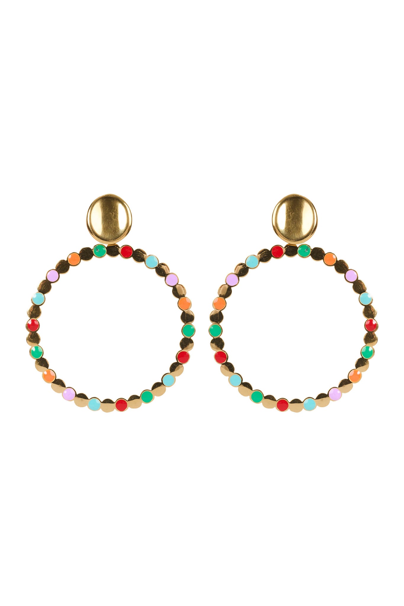 Fun and carefree with a colourful twist. A polished gold-look stud connects to a hanging beaded colour and gold ring. The perfect way to add a subtle splash of summer.
