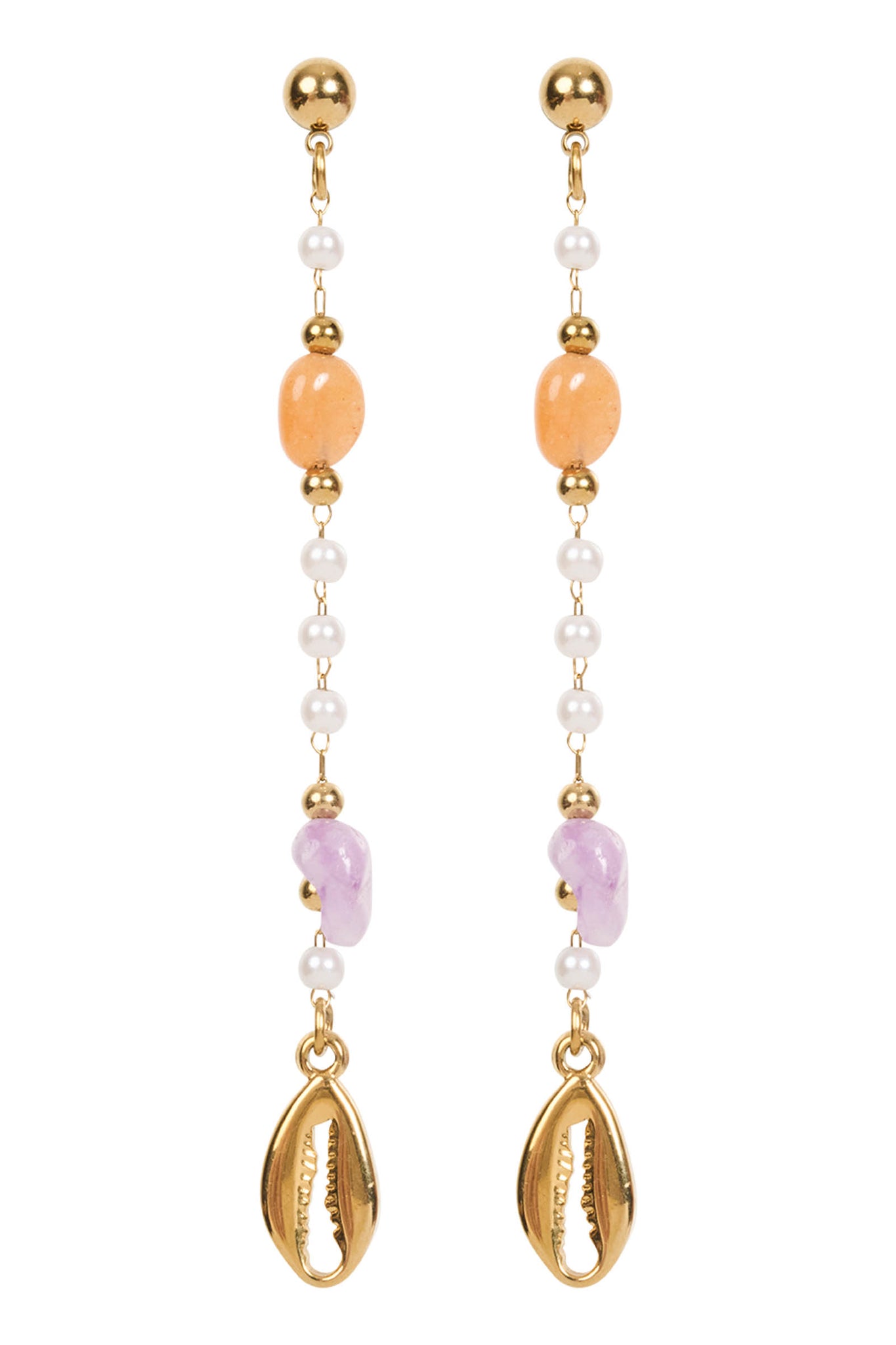 Bring the beach with you. These drop earrings feature a playful chain of imitation pearls and beads in orange and purple, finished with a gold cowrie shell. Statement-worthy but still relaxed - just how we like it.