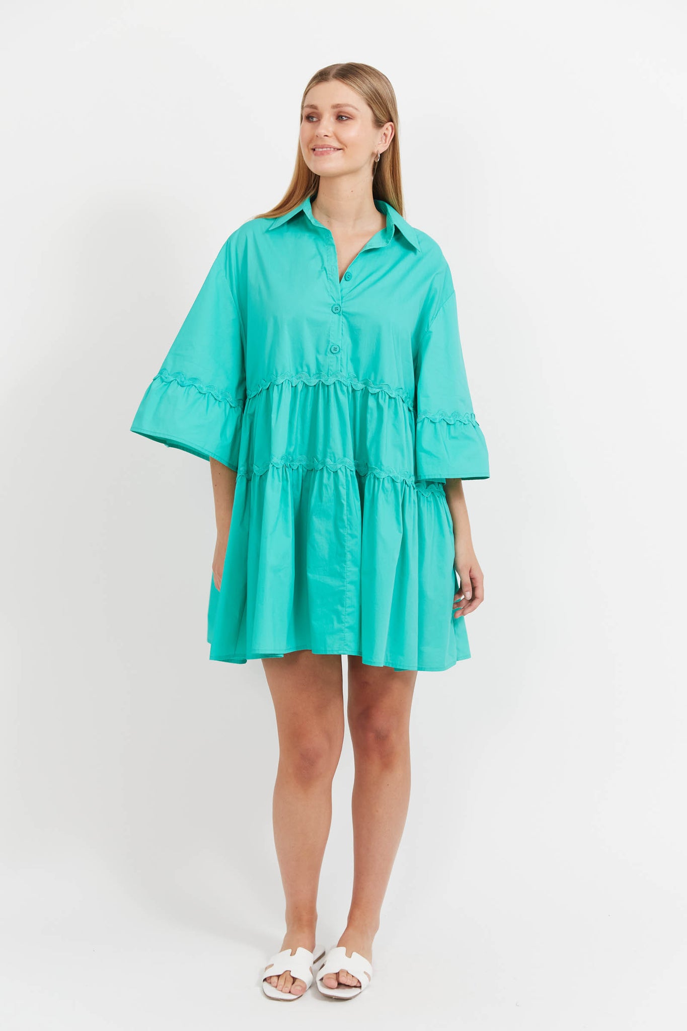 The Brasilia Relaxed Dress is your go-to for sunny days. Crafted from breathable 100% cotton, it features a collared neckline, partial button front, and voluminous 3/4 trumpet sleeves for a soft yet statement silhouette. Featuring feminine tiered panels, internal side pockets and charming ric-rac trimmings. Just add gold jewellery and woven platform slides, and you're summer-ready in an instant.