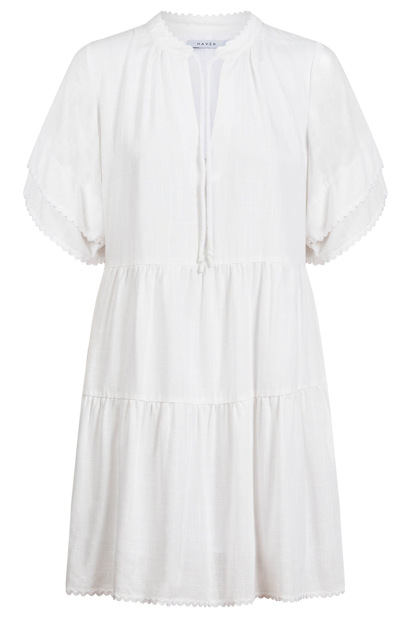 Slip into the Haiti Dress and instantly feel sun-kissed. This breezy beauty features a soft V-neckline with cotton ties, ric-rac trim, and a relaxed tiered silhouette. The short double-layer sleeves and airy linen blend add to its effortless charm, while internal side pockets keep it practical for days on the move.