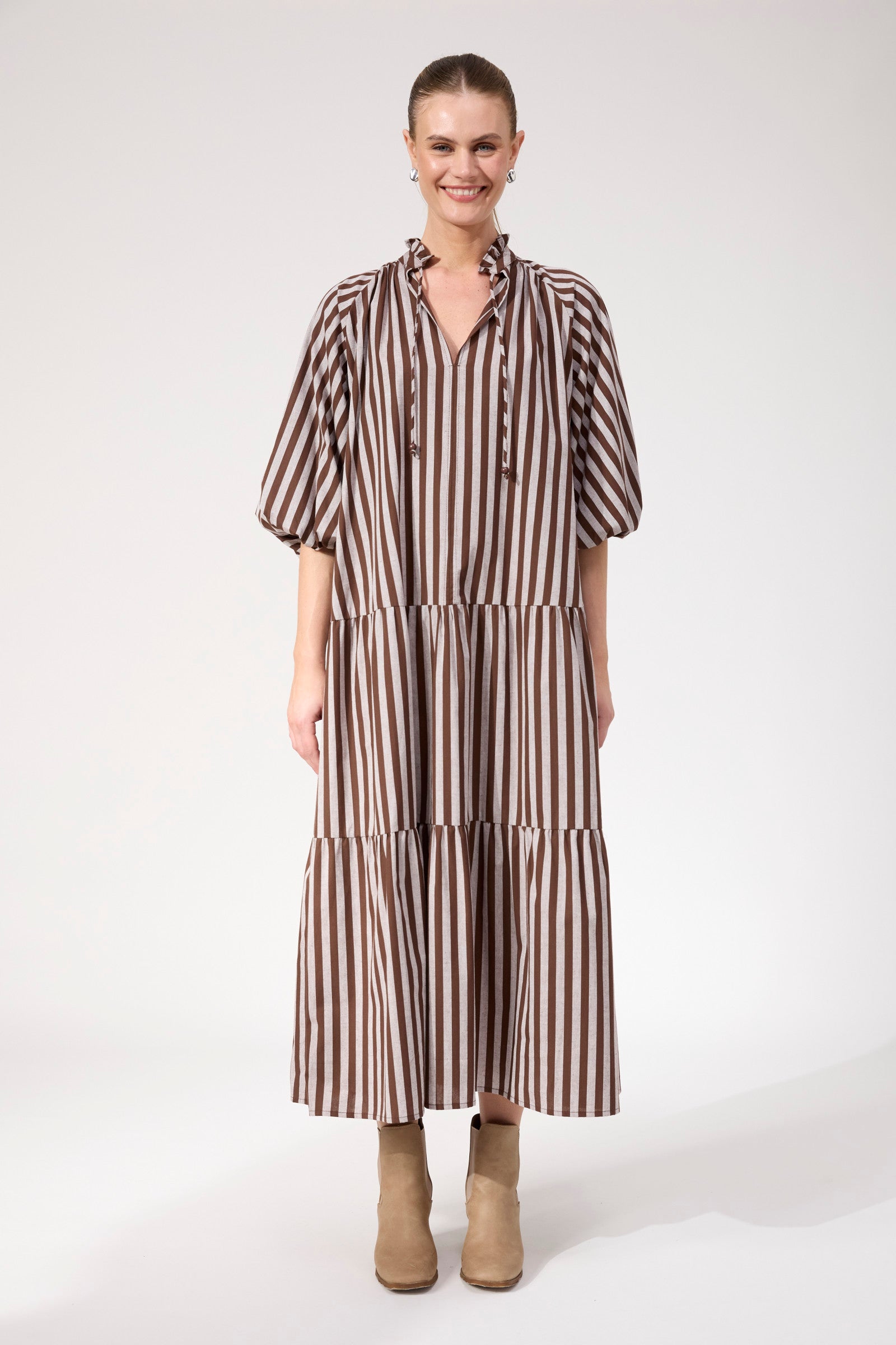 A relaxed statement dress with beautiful movement. The Monterosa Stripe Maxi Dress features a soft V-neckline with ruffle detailing, bloused sleeves and a flowing tiered skirt. Designed to be worn loose or cinched at the waist, it's an easy option for day-to-night dressing.
