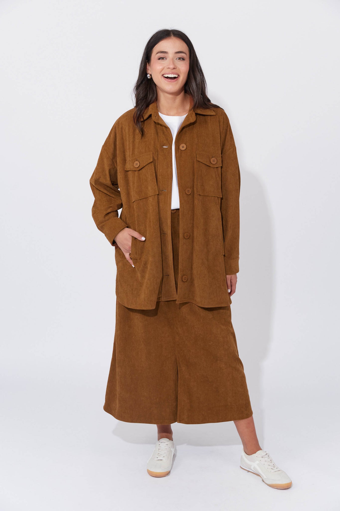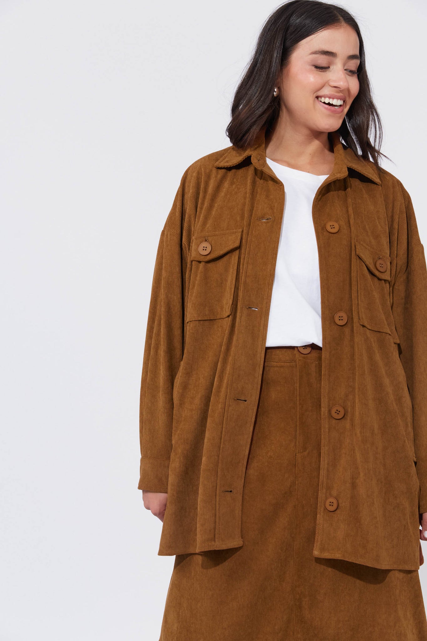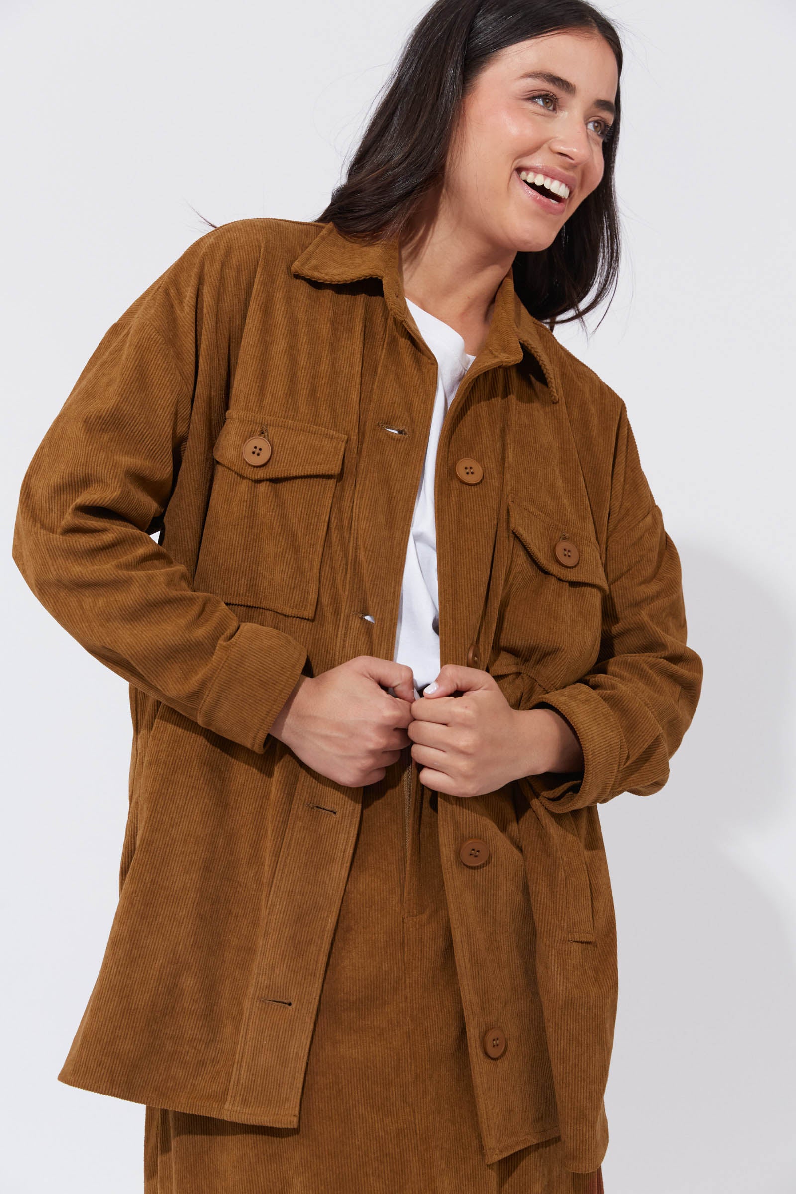 Lighter than a coat yet warmer than a button-down shirt, the Nashville Shacket is perfect for transitional layering. In a soft corduroy, this shacket adds a laid-back, rustic touch to your outfit. The oversized fit offers plenty of space for layering and freedom of movement, making it an ideal choice for casual occasions. Pair it with matching pants and boots for a cohesive look, or keep it casual with leggings and sneakers.