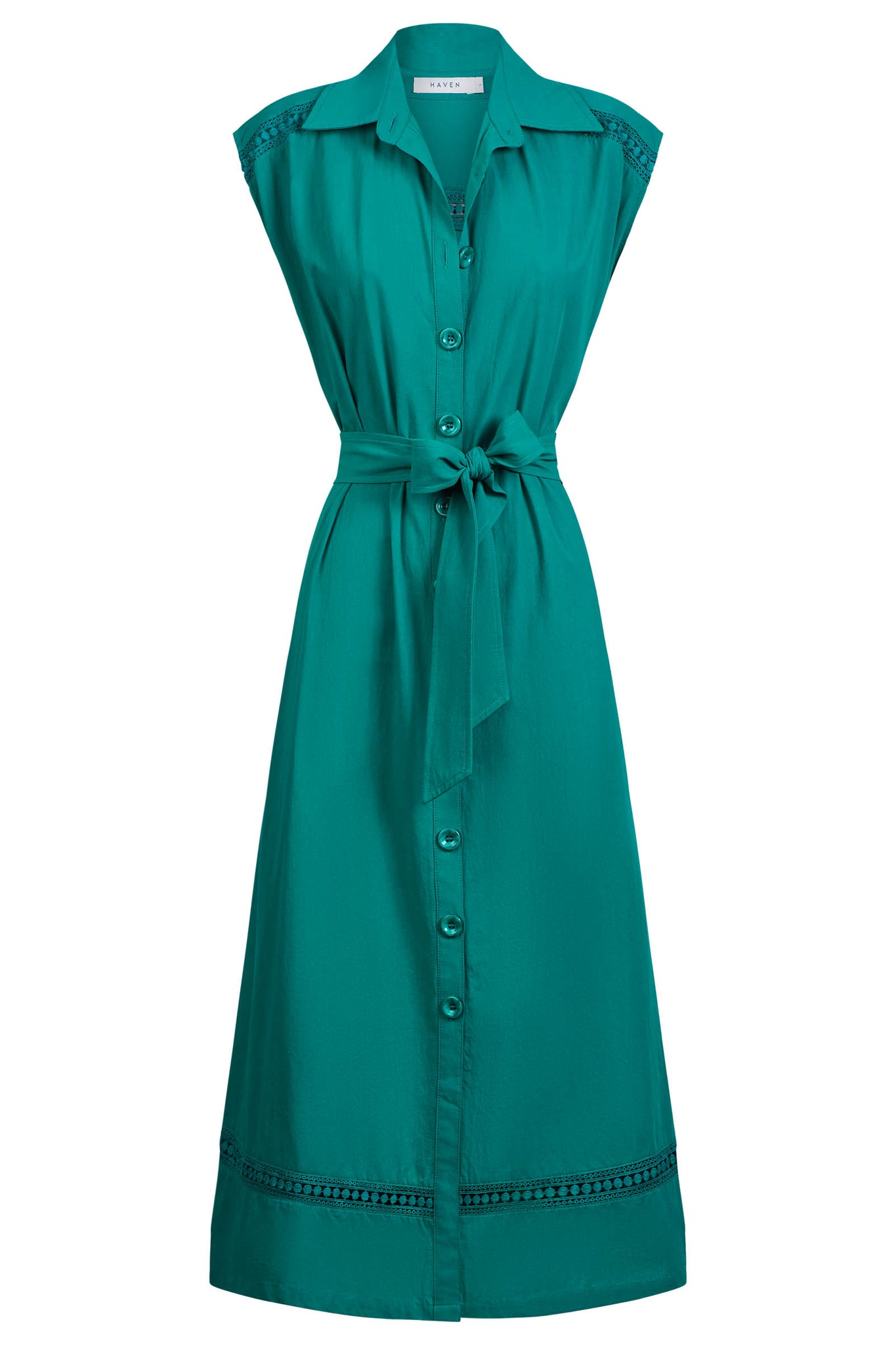 One piece, endless styling potential. Crafted from crisp 100% cotton, the Santos Sleeveless Shirt Dress features a collared button-through front, extended shoulder sleeves for extra arm coverage, and lace inserts at the yoke and hem. An inverted back pleat adds shaping, while the self-fabric belt lets you cinch the waist.