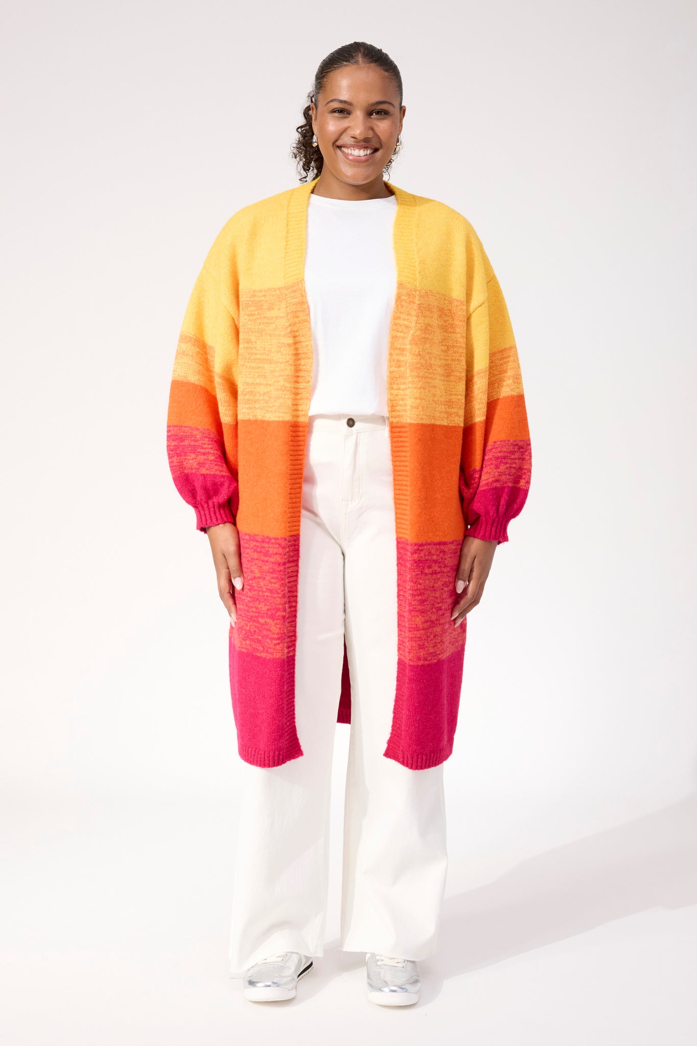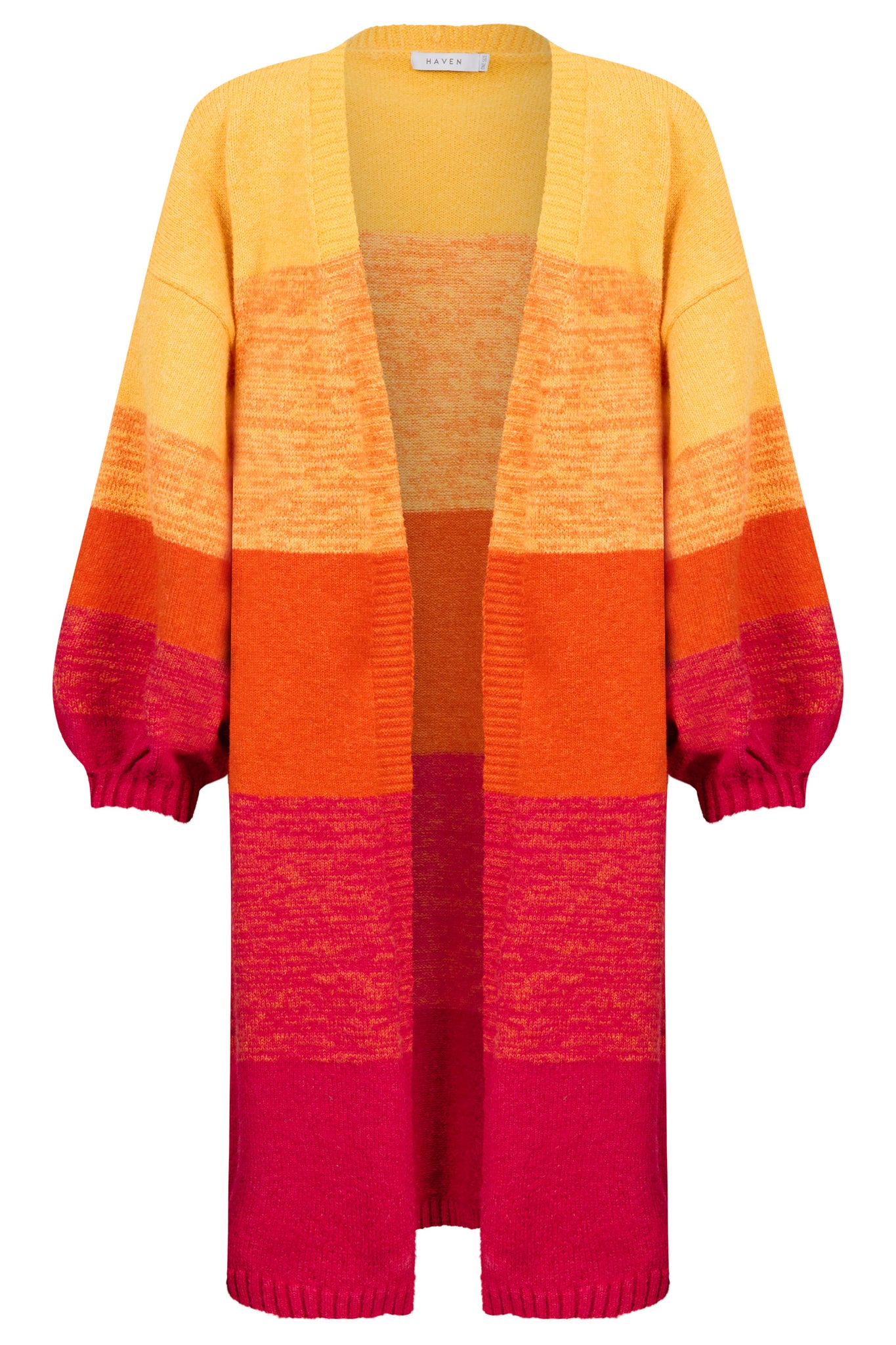 A cosy throw-on layer with a little bit of colour magic. The Valenza Cardigan features a custom degrade stripe design, blending soft tones into a winter-bright palette. Cut in a relaxed, longline shape with an open front, it drapes effortlessly for easy layering. Drop shoulders and long balloon sleeves add a laid-back, après-ski feel, while the heavier weight knit keeps it extra snug.