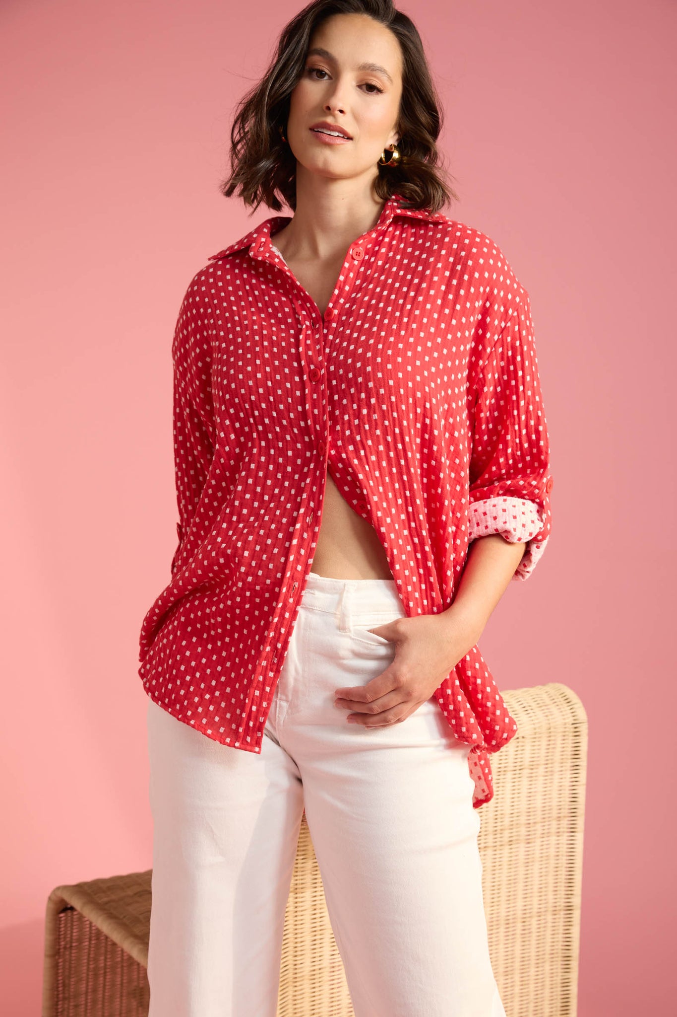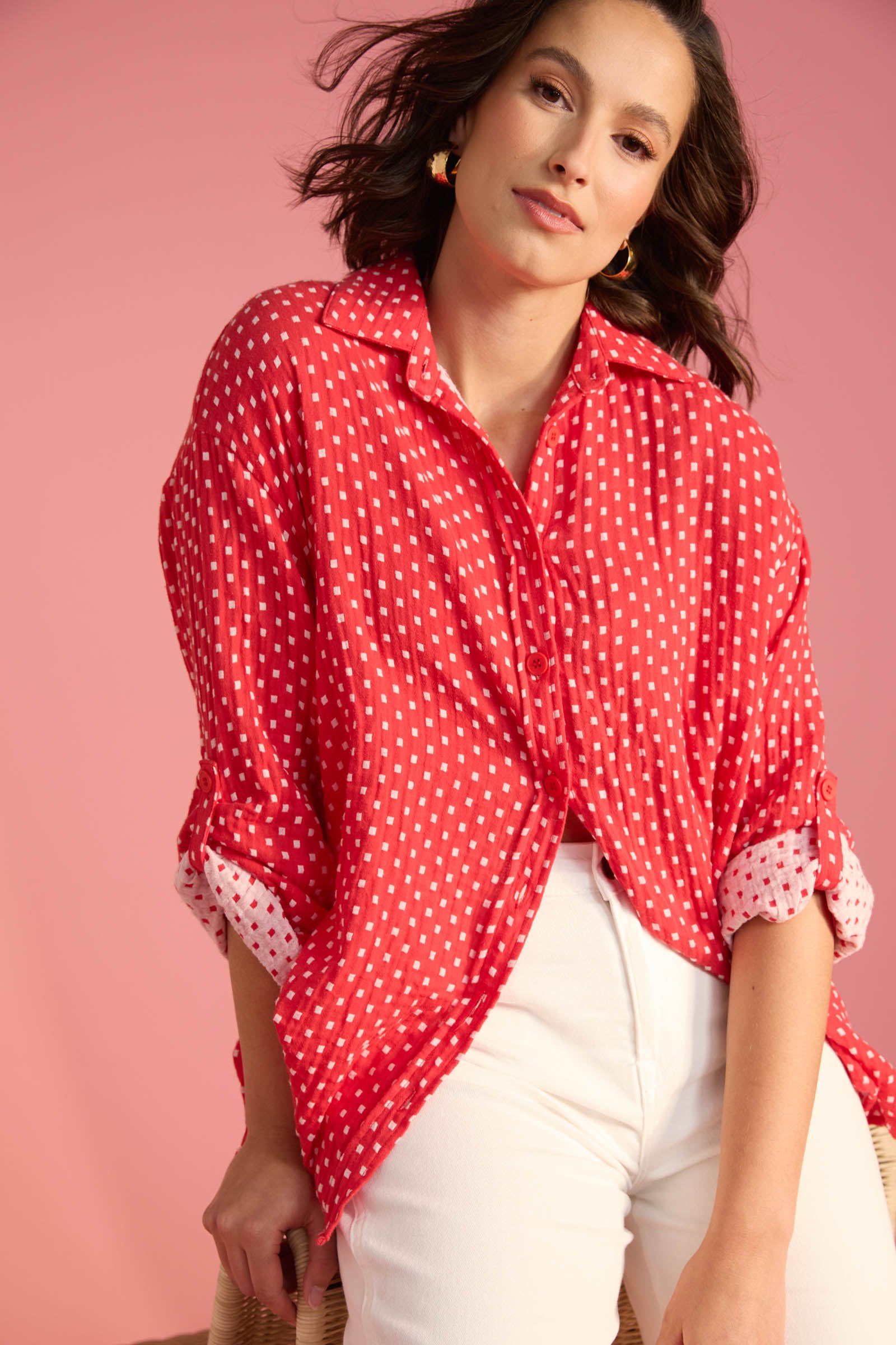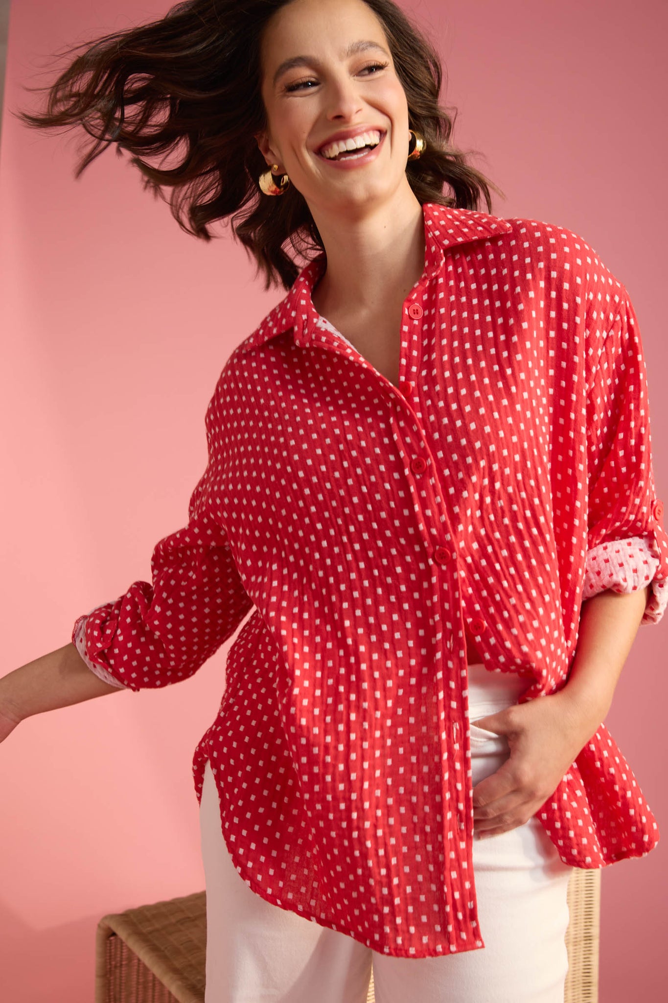 A timeless cotton shirt will go the distance in any wardrobe, and the relaxed Vanuatu Shirt is a perfect example. With its curved high-low hem, you can style it tucked in or left loose for versatile looks. The delicate square print adds charm, while the tab button sleeves provide a striking colour block effect when rolled. Pair it with loose pants for a casual vibe, or layer it under a knit sweater or vest for added warmth and texture.